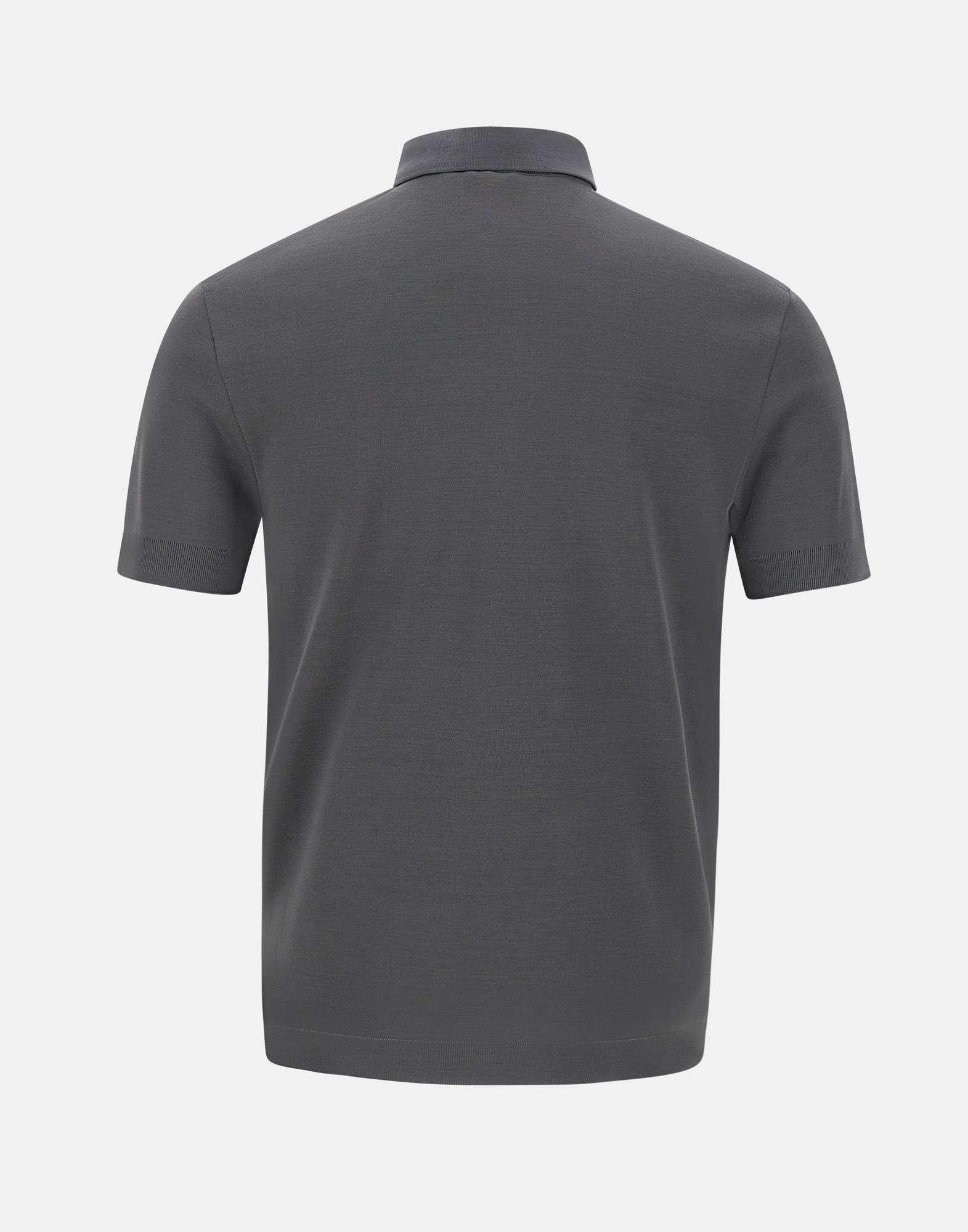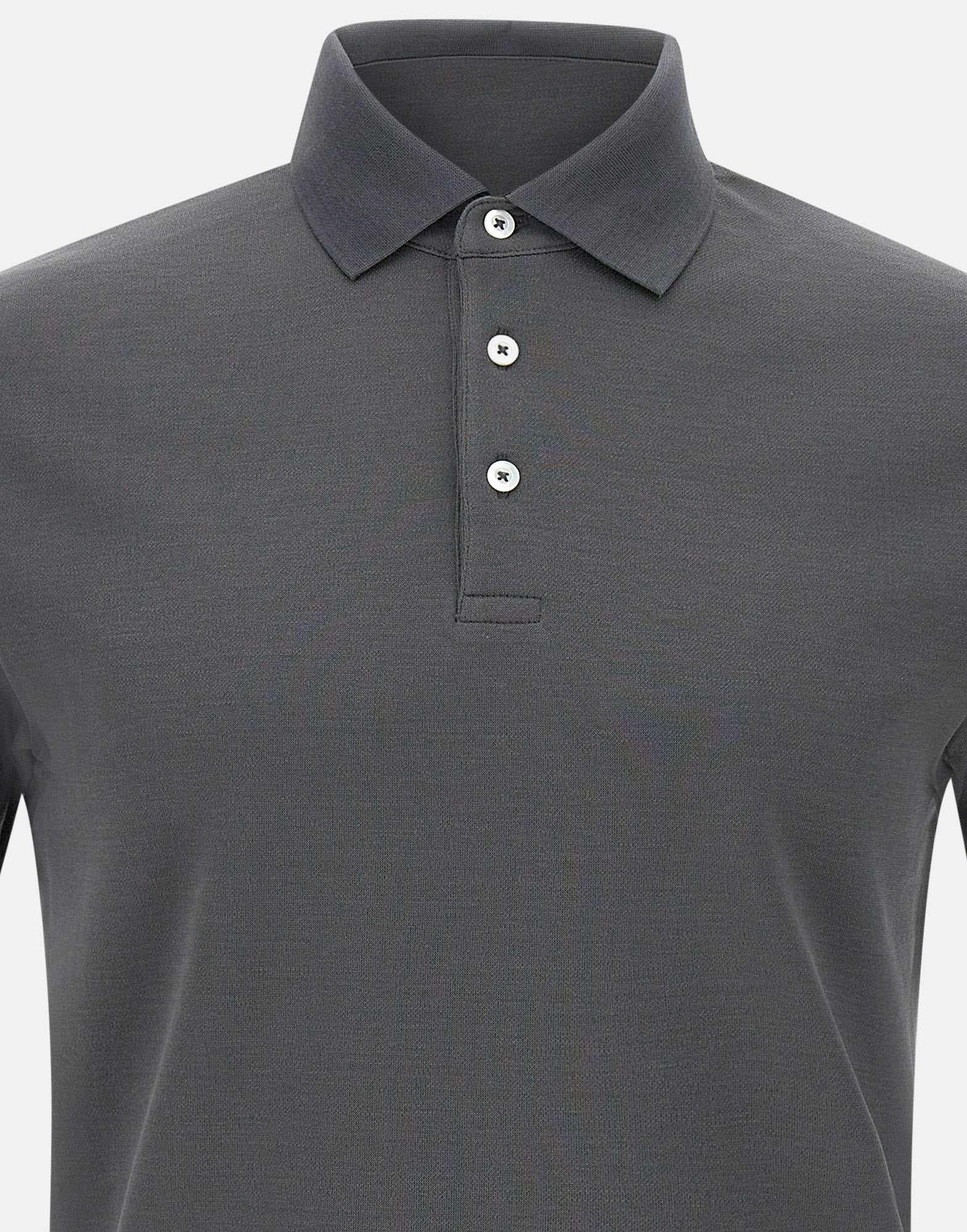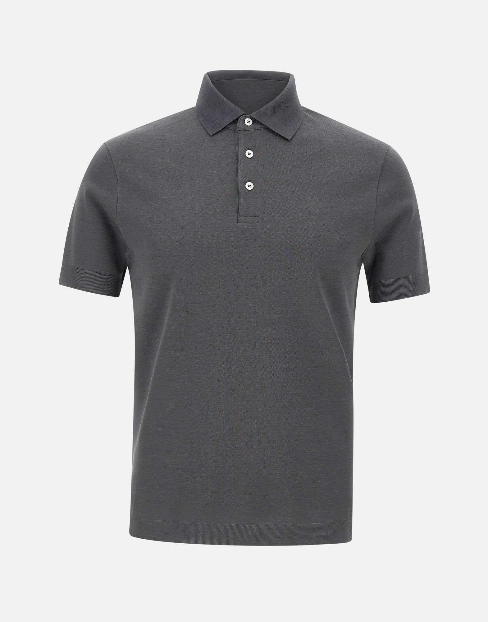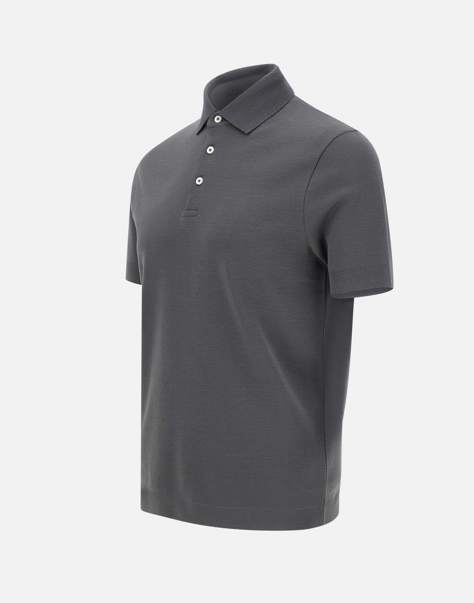 Herno men's double-layered pure cotton piqué polo shirt, smoke grey colour, shaved weave inside, short sleeves, classic collar, ribbed edges, logoed mother-of-pearl effect button fastening, mini side vents at hem, regular fit.