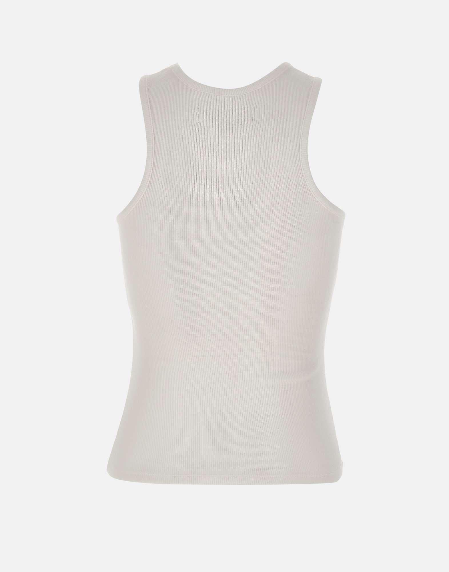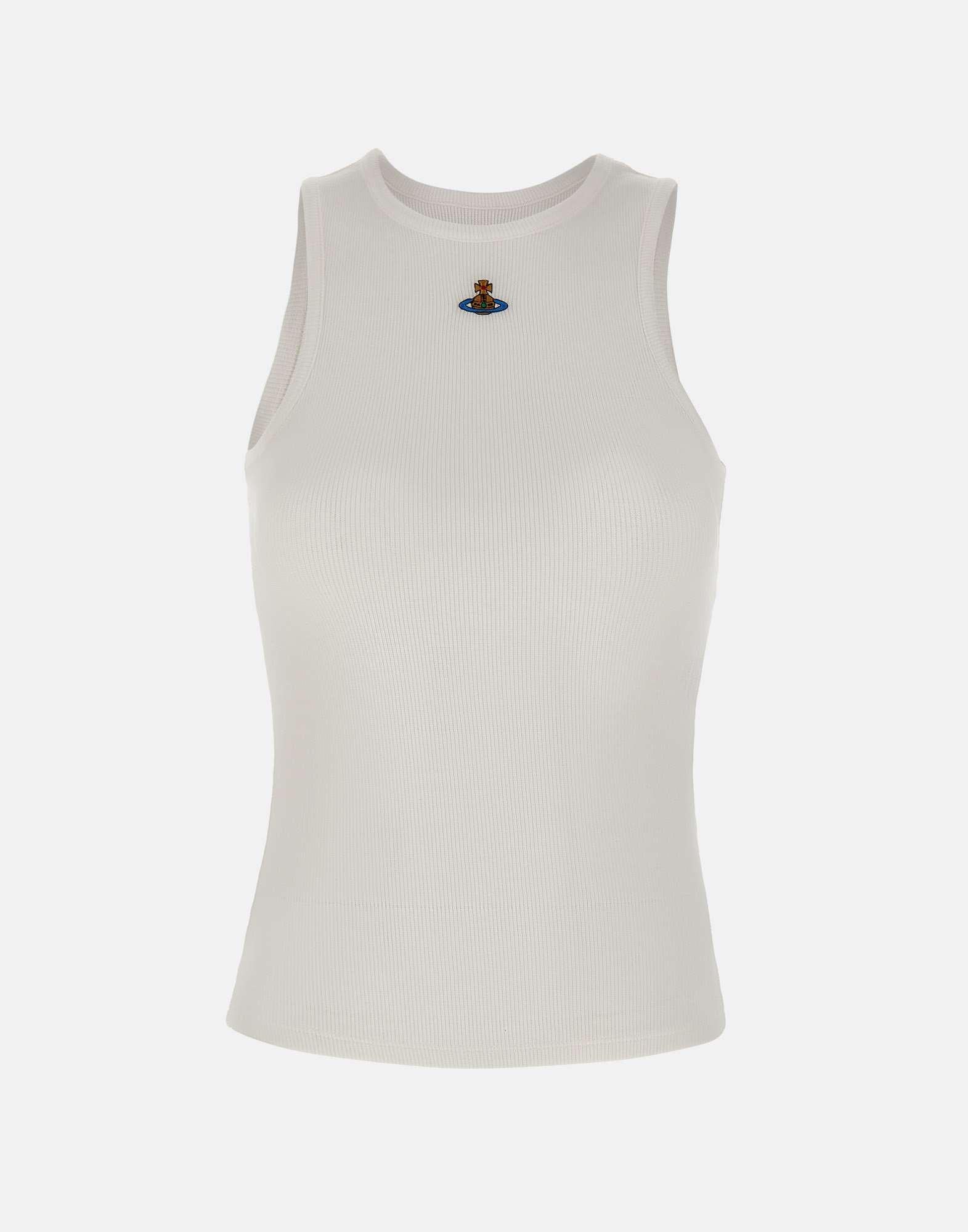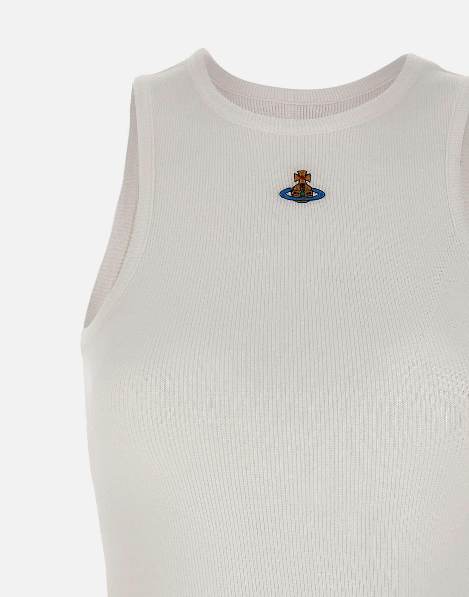 Vivienne Westwood "90s vest", white, sleeveless, stretch organic cotton, ribbed weave, central embroidered colored Orb, regular fit