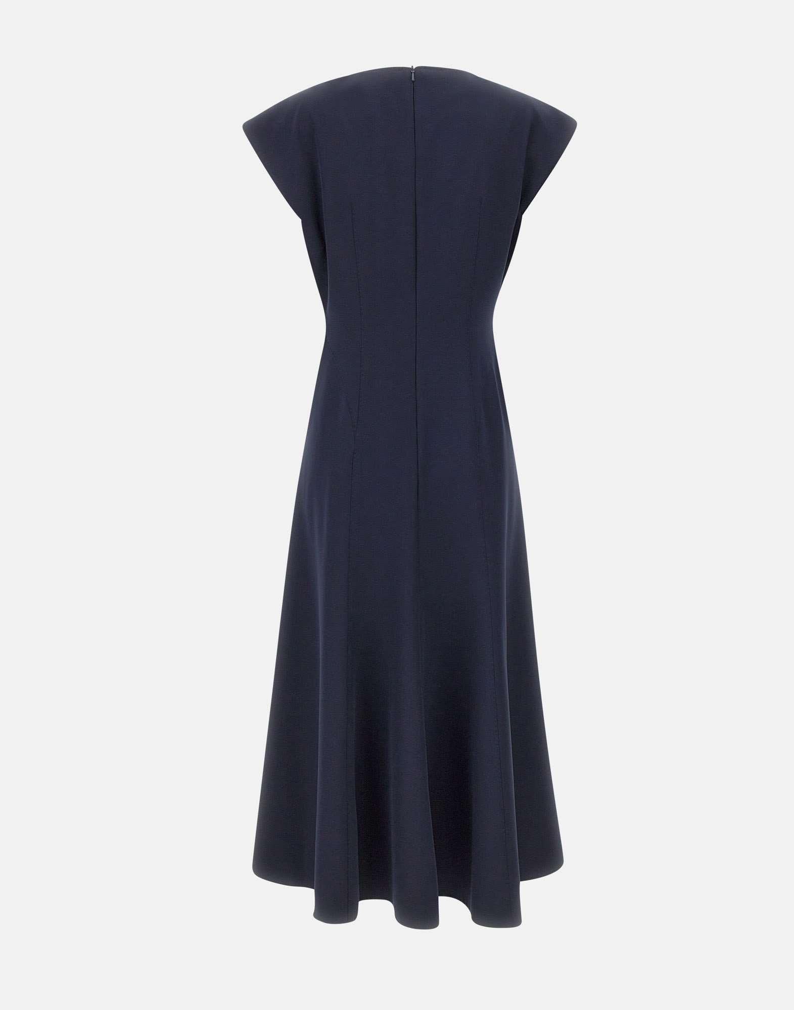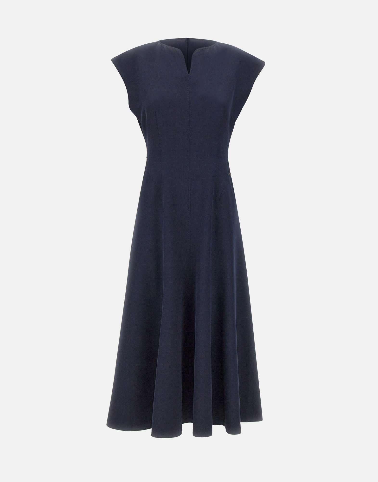 Nissa midi dress in navy blue with an A-line trapeze design, created for contemporary elegance with a clean, feminine shape. This dress features short sleeves and a V-neckline with rounded edges, paired with a defined waist shaped by front and back darts for a balanced silhouette. Visible stitching adds a modern graphic touch, while the full skirt brings movement and lightness. A concealed back zip closure ensures a sleek finish, completed by a small logo charm detail at the waist. Regular fit, perfect for refined seasonal styling.