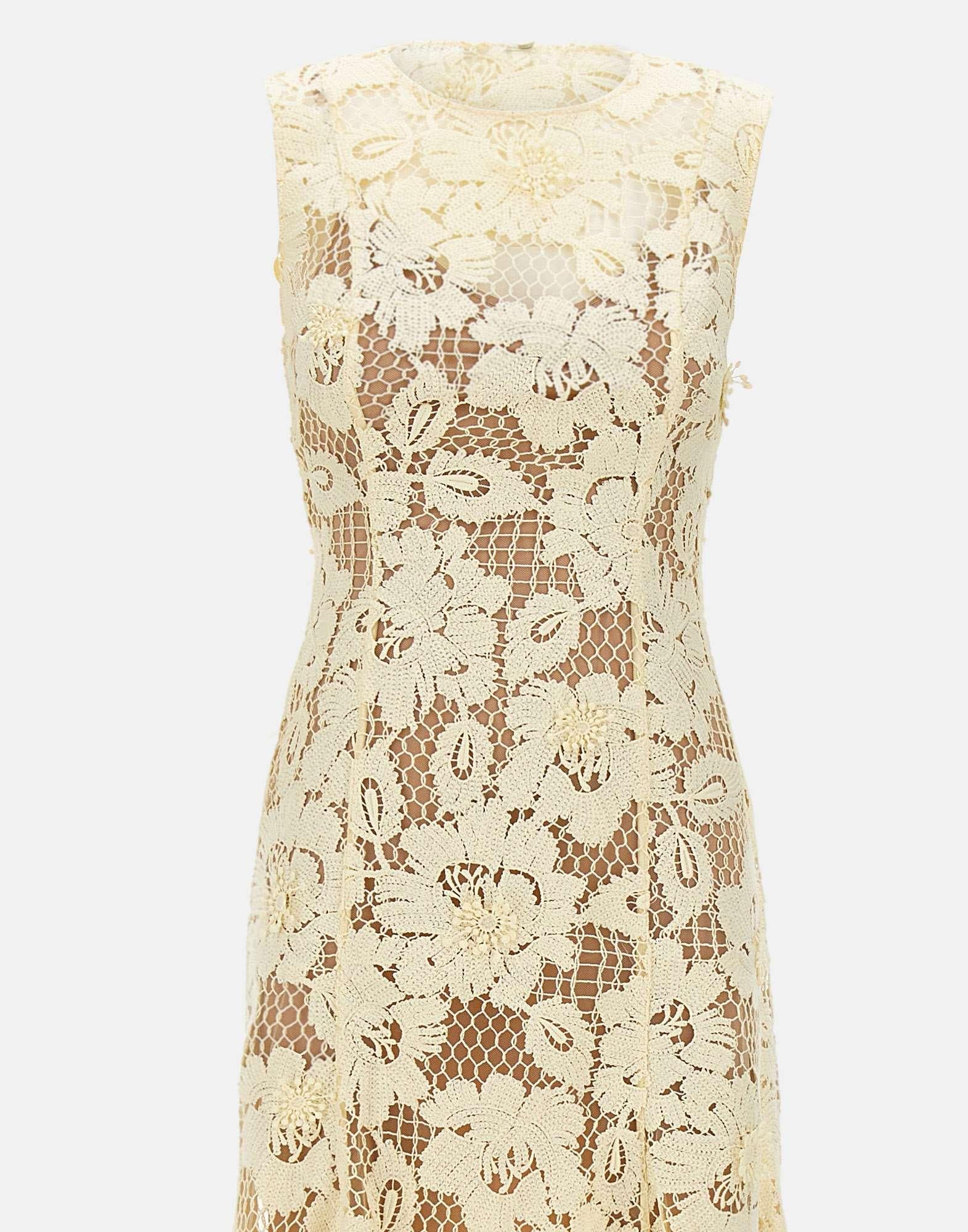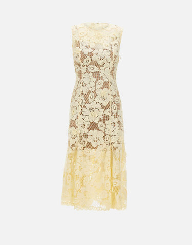 Self-Portrait midi dress crafted from sunshine yellow crochet lace, inspired by vintage floral crochet motifs. The style features a fitted silhouette with a flared skirt to enhance the figure, finished with a crew neck and sleeveless armholes for a clean, feminine line. A scalloped hem adds a refined detail, while the removable inner lining brings versatility and comfort. At the back, a concealed zip closure keeps the look sleek, complemented by a black bow that adds a delicate contrasting accent.