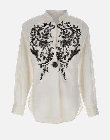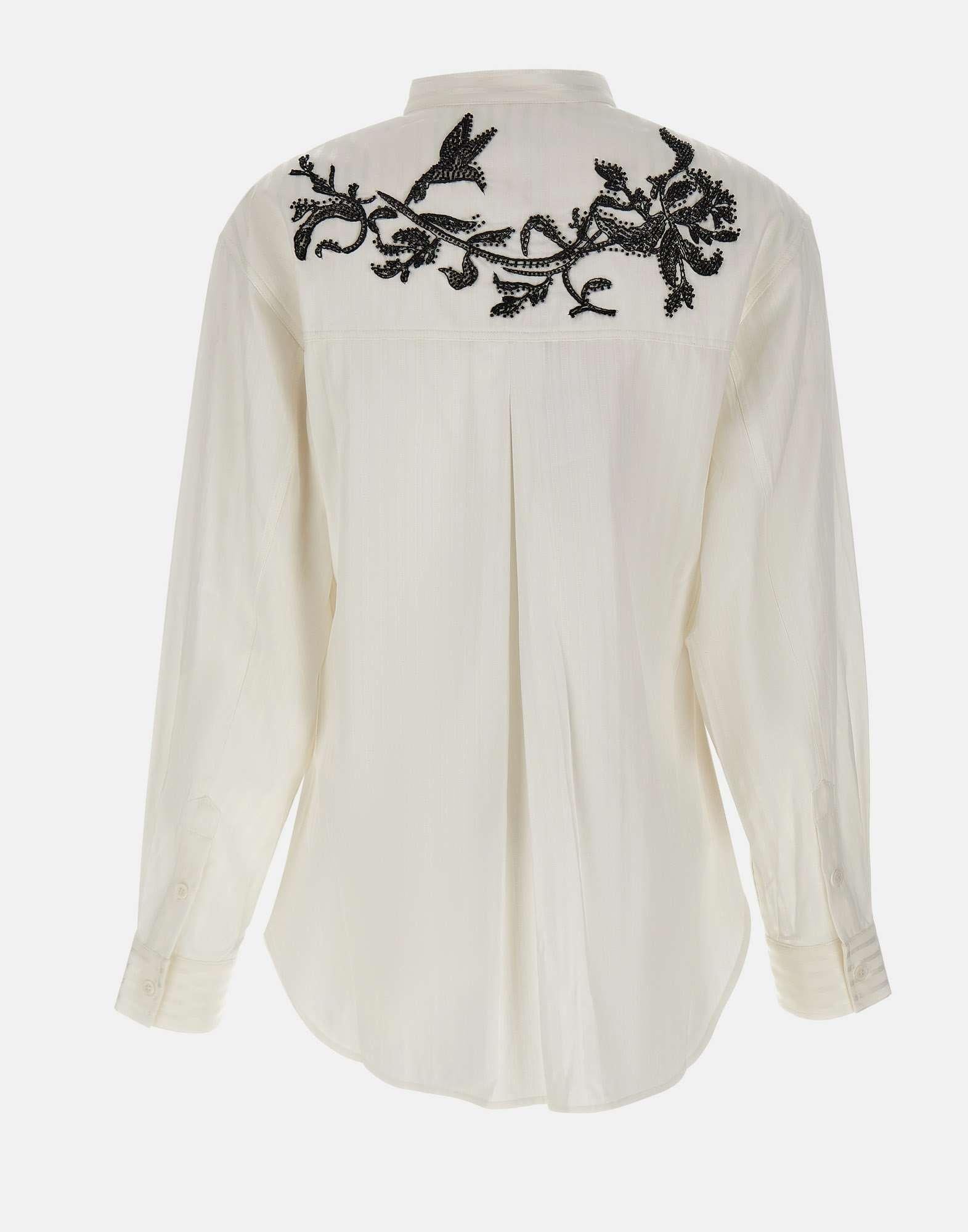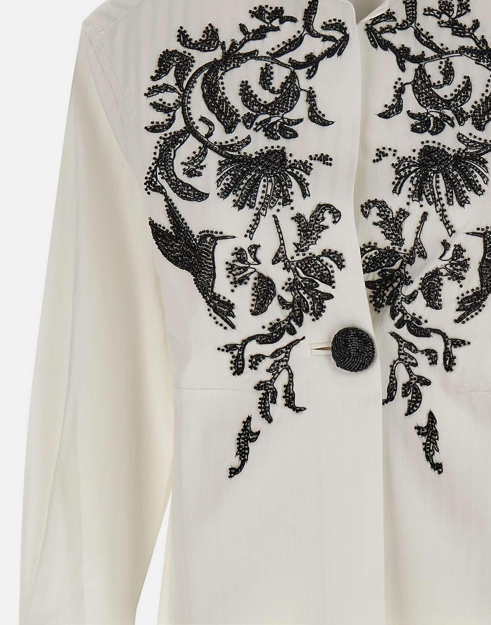 Jacques Wei women's jacket crafted in white fabric with a tone-on-tone striped pattern, a contemporary piece that combines tailored simplicity with refined decorative detailing. Black floral sequin embroidery enhances the surface with an elegant graphic and luminous contrast. The shirt-inspired design features a mandarin collar, cuffs finished with two buttons, and a single central button covered in sequins that gives the front a distinctive touch. The back yoke with central dart and rounded hems complete the construction with balance and softness. The regular fit makes this jacket versatile and sophisticated, ideal for elegant looks with a refined appeal.