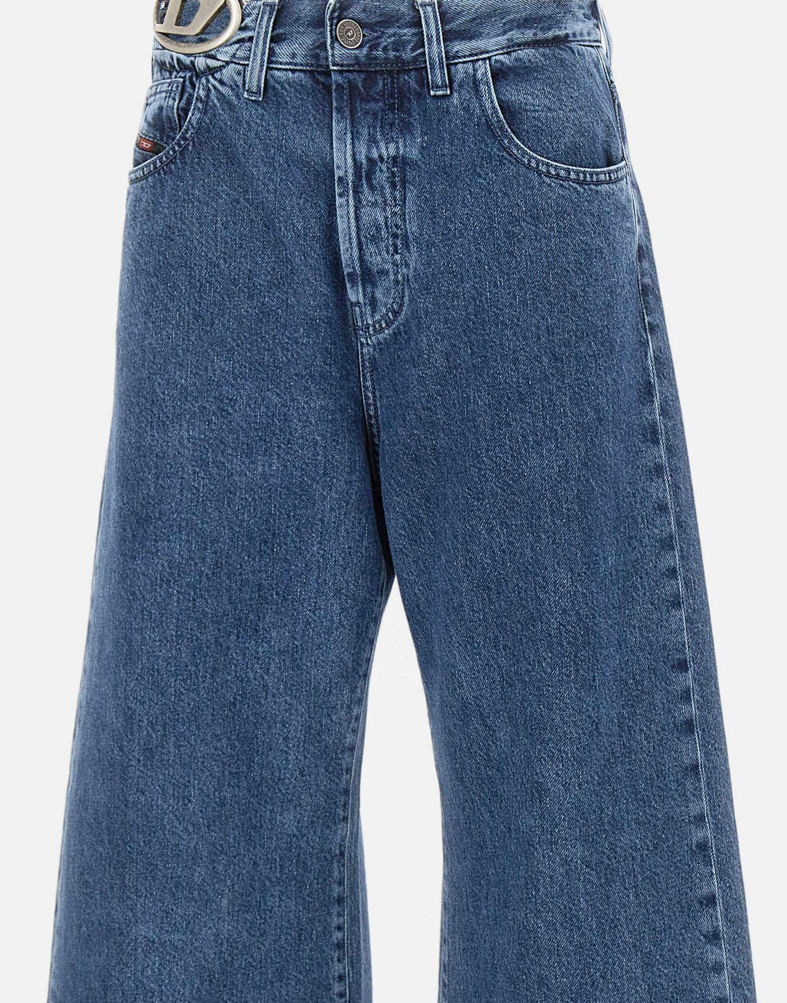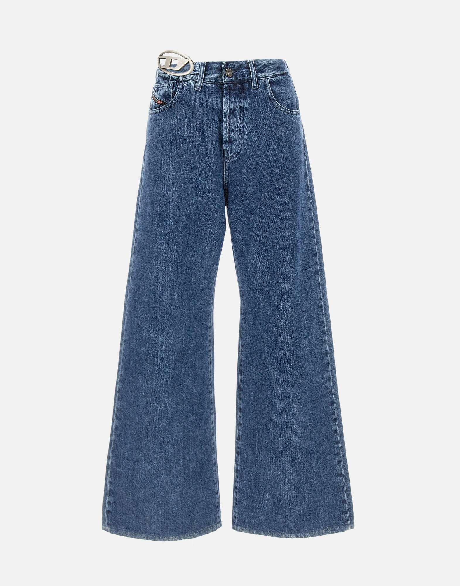 Women's Diesel "1996 D-Sire-S4" jeans crafted from blue cotton denim, designed with a bold and contemporary attitude. The classic five-pocket style features concealed button fastening, a back logo patch, and a distinctive Oval D metal plaque at the waist for an iconic finish. The palazzo cut with wide leg and a 32 cm bottom creates a striking modern silhouette. Regular fit, perfect for fashion-forward everyday looks.