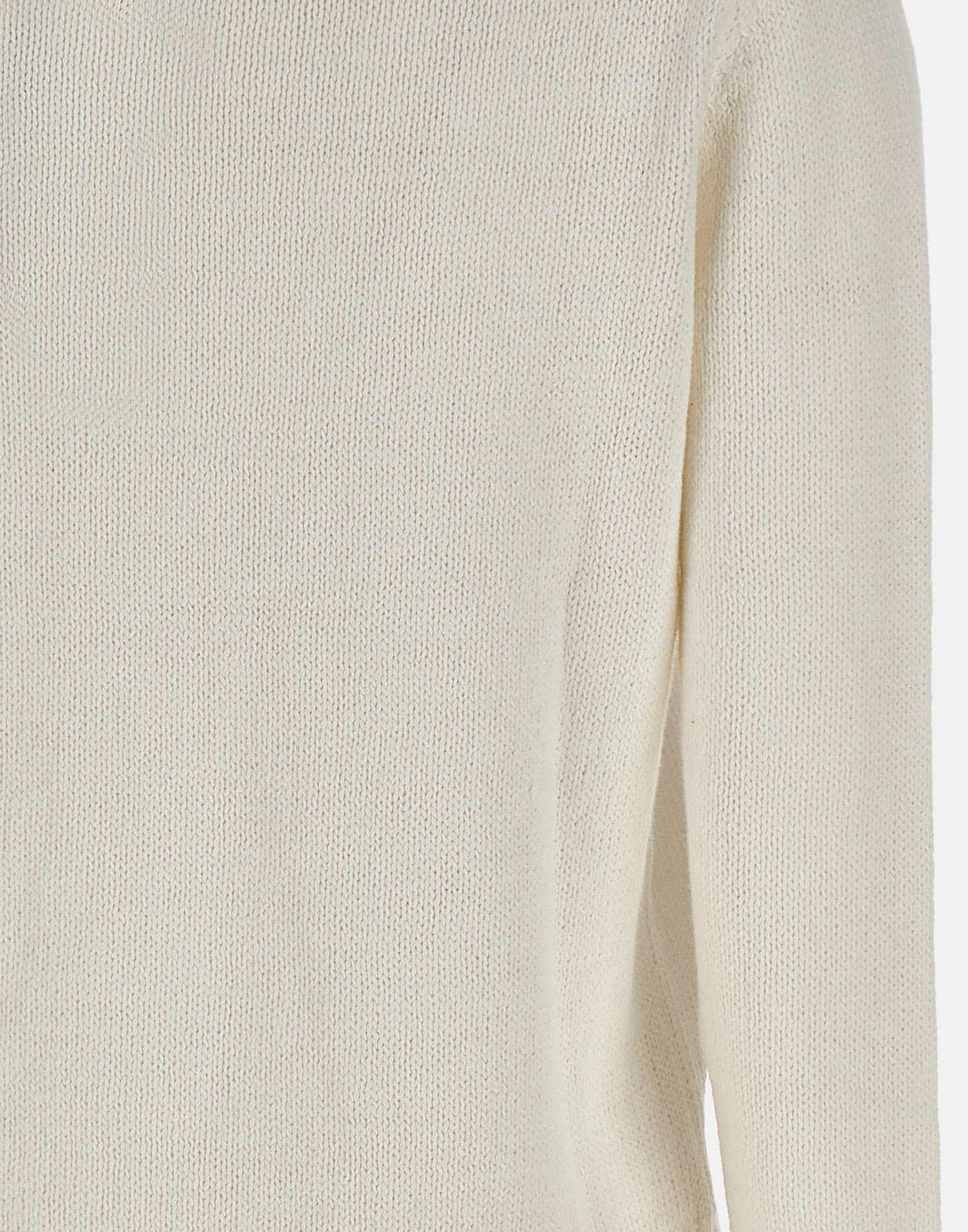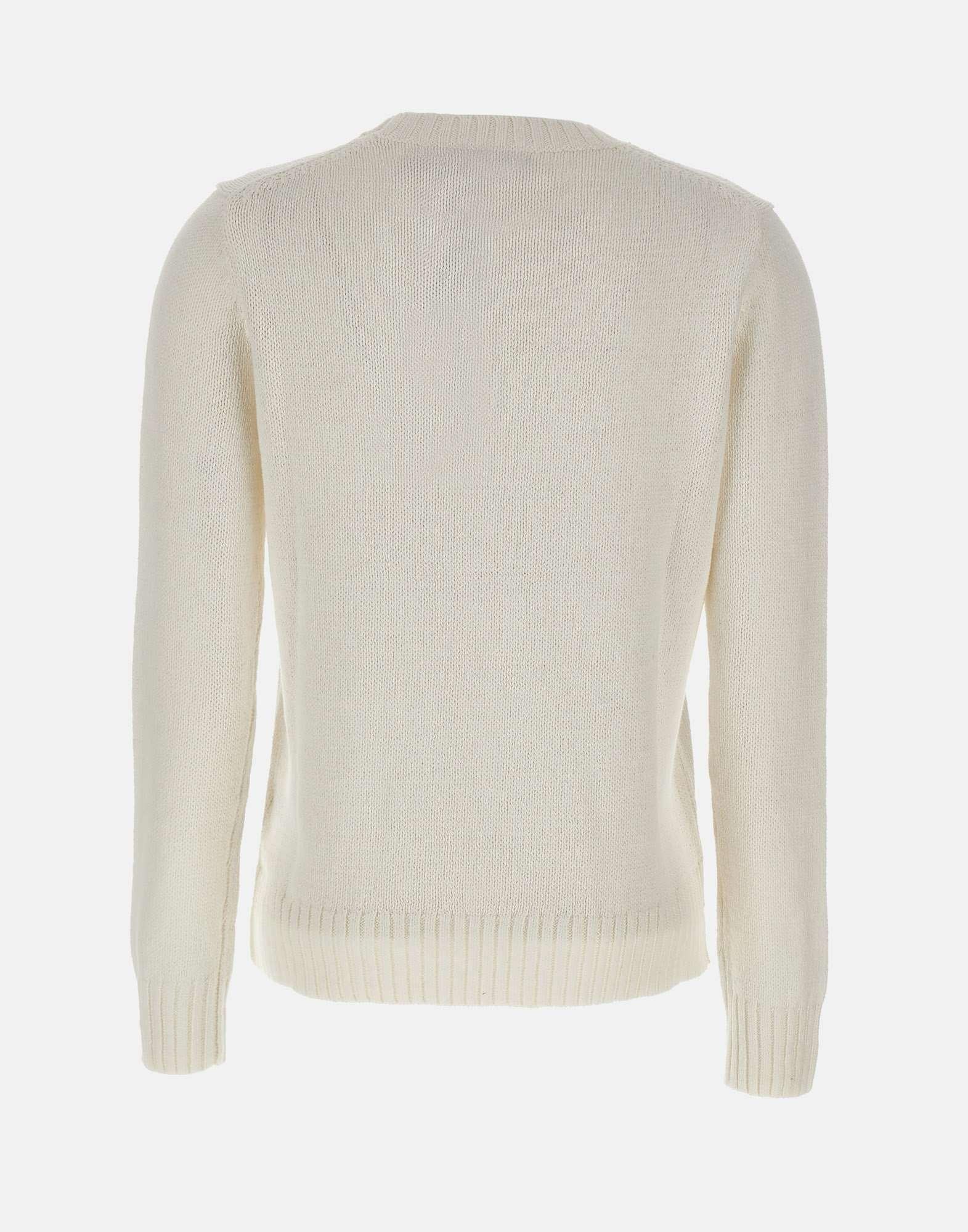 Women's Polo Ralph Lauren sweater in a white linen and cotton blend with an intarsia knit finish. Features an embroidered "Polo Bear" showcasing an exclusive Ralph Lauren look, an iconic and instantly recognizable detail. Designed with a crew neck and a soft, relaxed cut, finished with ribbed trims at the collar, cuffs, and hem. Small side slits add ease and movement, making it ideal for refined casual styling and seasonal layering.