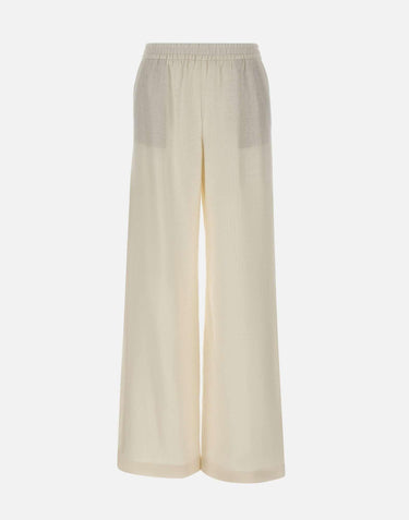 Women's Eleventy pants crafted from an ivory linen blend, enriched with subtle lurex threads that add a luminous touch to the fabric. Designed with a palazzo silhouette, they feature an elasticated waistband for effortless comfort and Italian front pockets for a clean, refined look. The regular fit ensures fluid movement and everyday versatility, making them perfect for bright, elegant summer outfits. Bottom width: 28 cm. Made in Italy.