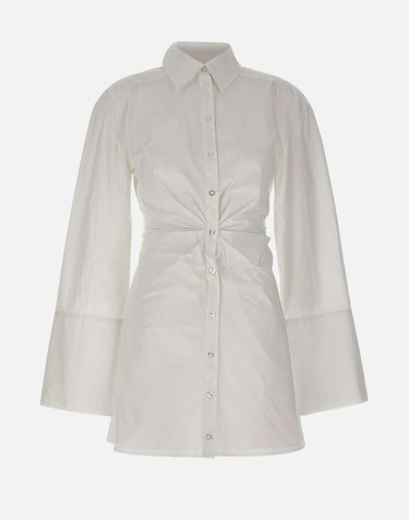 Rotate short dress in white organic cotton, designed with a shirt-inspired silhouette. Features a pointed collar, front button closure, ruched waist detailing, and long sleeves with wide buttoned cuffs. Comes with a cotton slip dress. The slim fit enhances a refined yet effortless look.