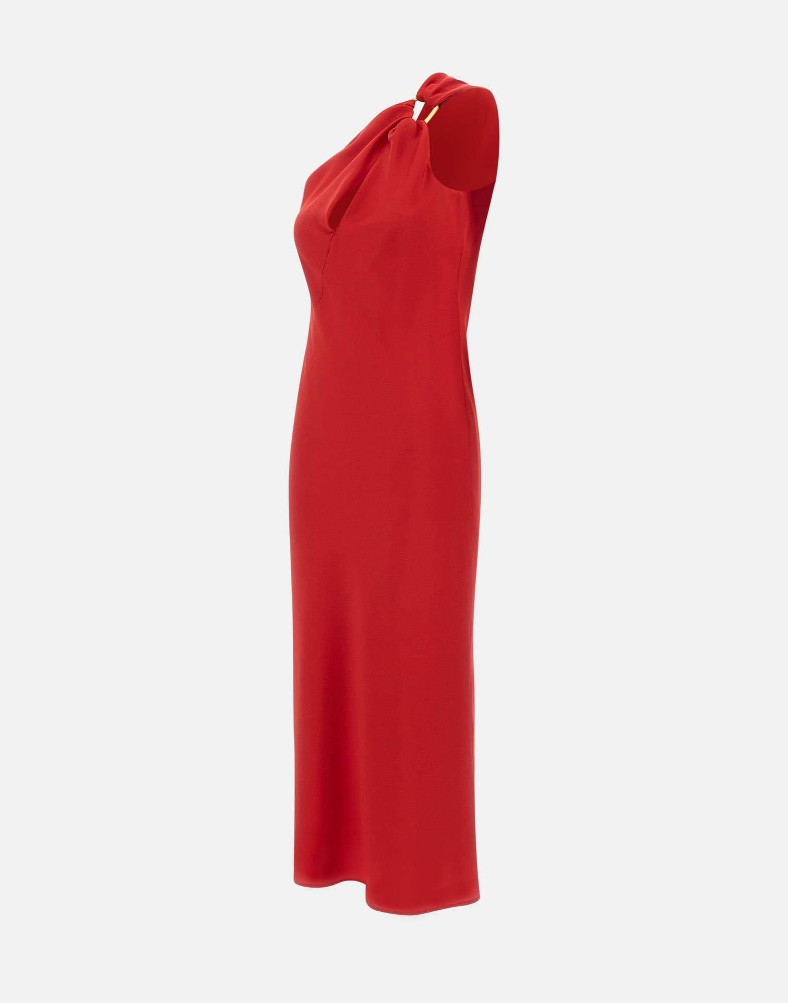 Max Mara Studio "Entrata" long dress in red satin, featuring a on-shoulder design embellished with a gold-tone metal ring. Cut on the bias to enhance the silhouette, it flows gracefully with an oblique front cut-out for a modern, feminine touch. Finished with a concealed side zip and full lining for a flawless fit. A statement piece of timeless elegance and sophistication.