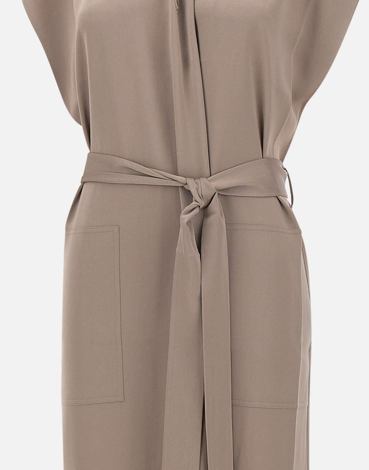 Filippa K long sleeveless dress in taupe, featuring a minimalist and refined design. It comes with a stand collar and button closure, two front pockets, and side slits for graceful movement. The matching tone-on-tone waist belt enhances the silhouette, while the regular fit ensures comfort and effortless sophistication.