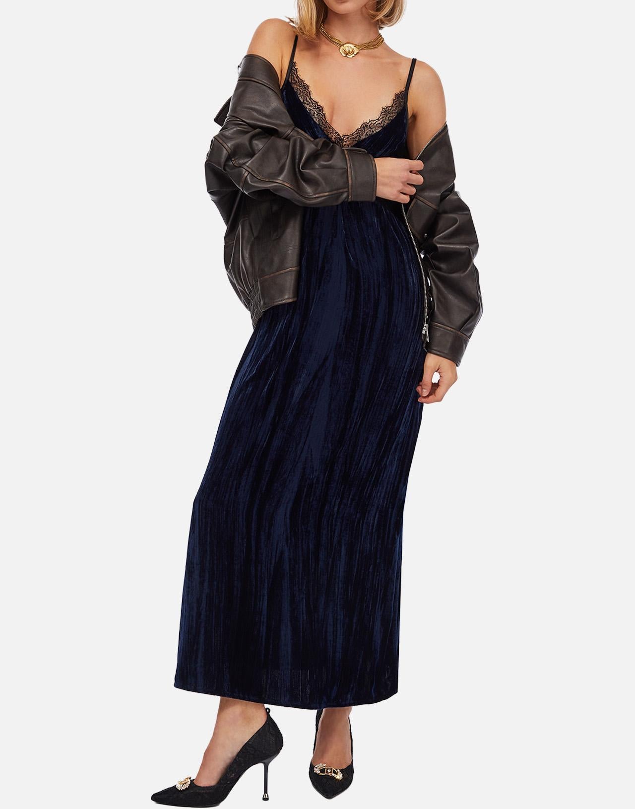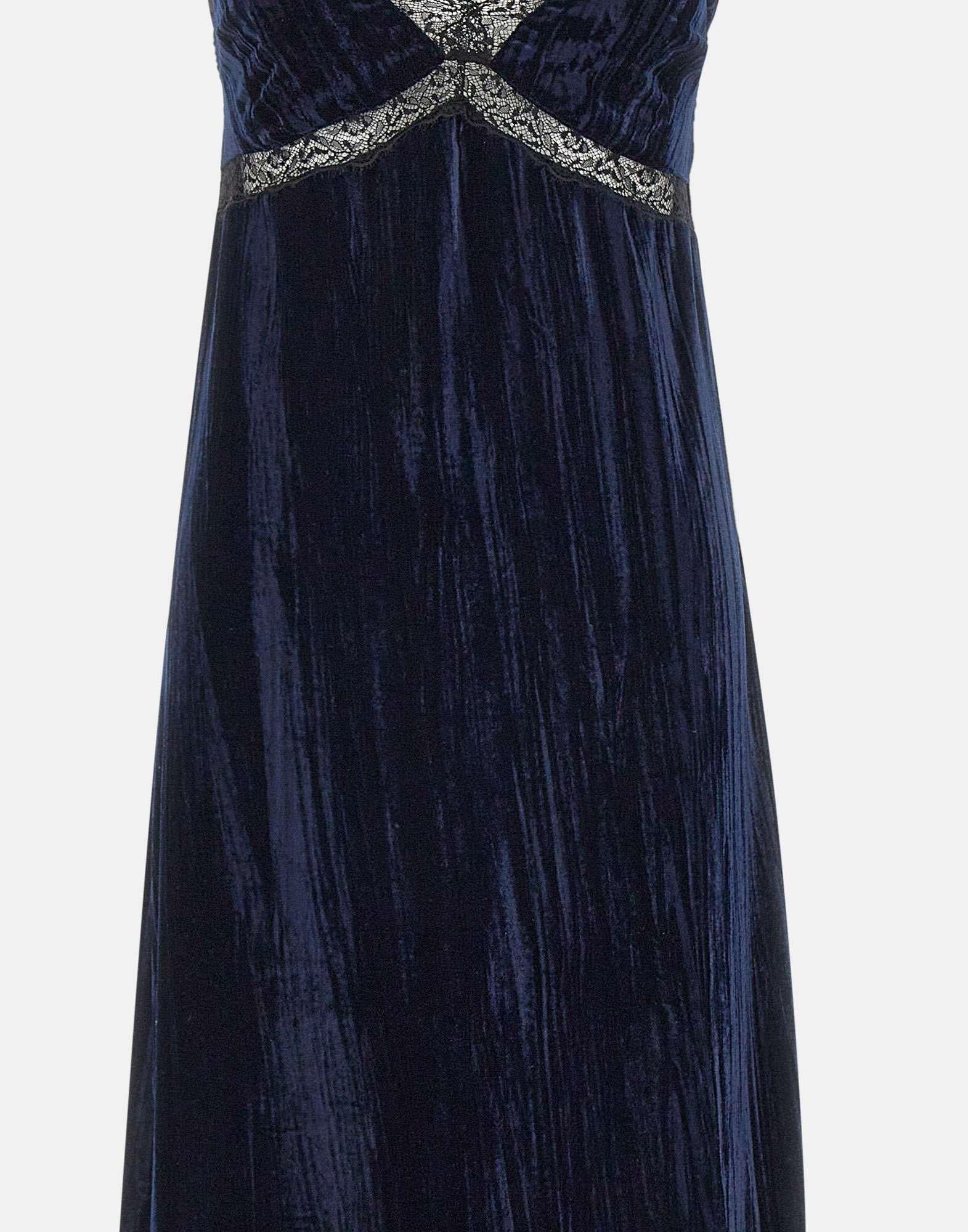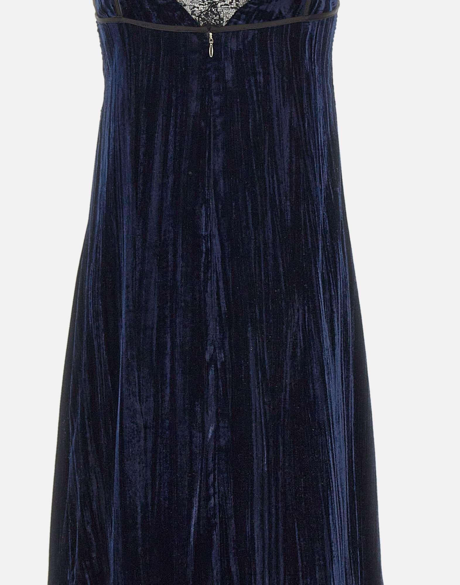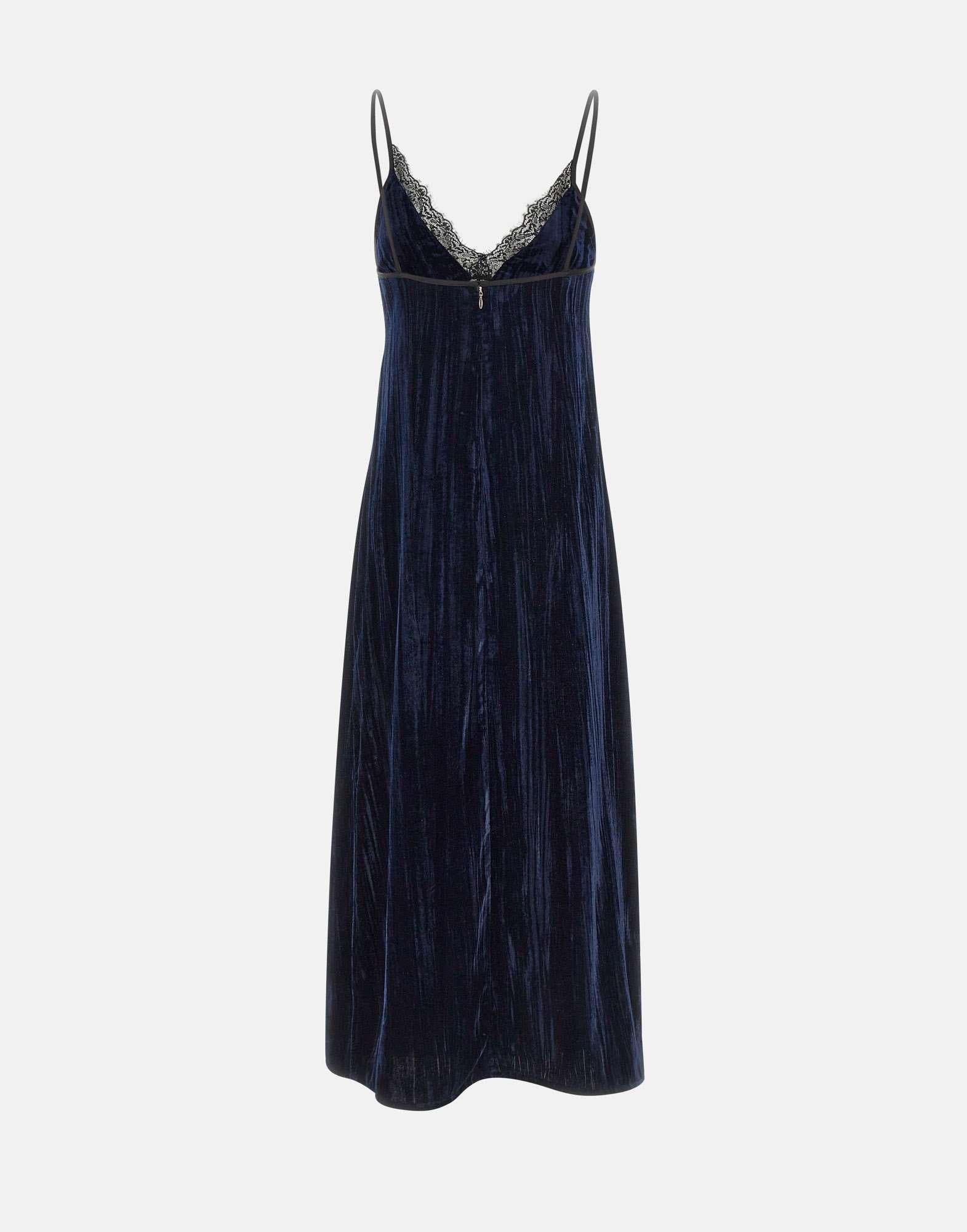 Liu Jo long dress in dark blue velvet, elegant and seductive, enriched with delicate black lace detailing. Features a deep V-neckline and thin shoulder straps that enhance the silhouette. Side slits add fluidity and allure, while the invisible back zip and inner lining ensure a perfect fit. Ideal for evening occasions and special events.
