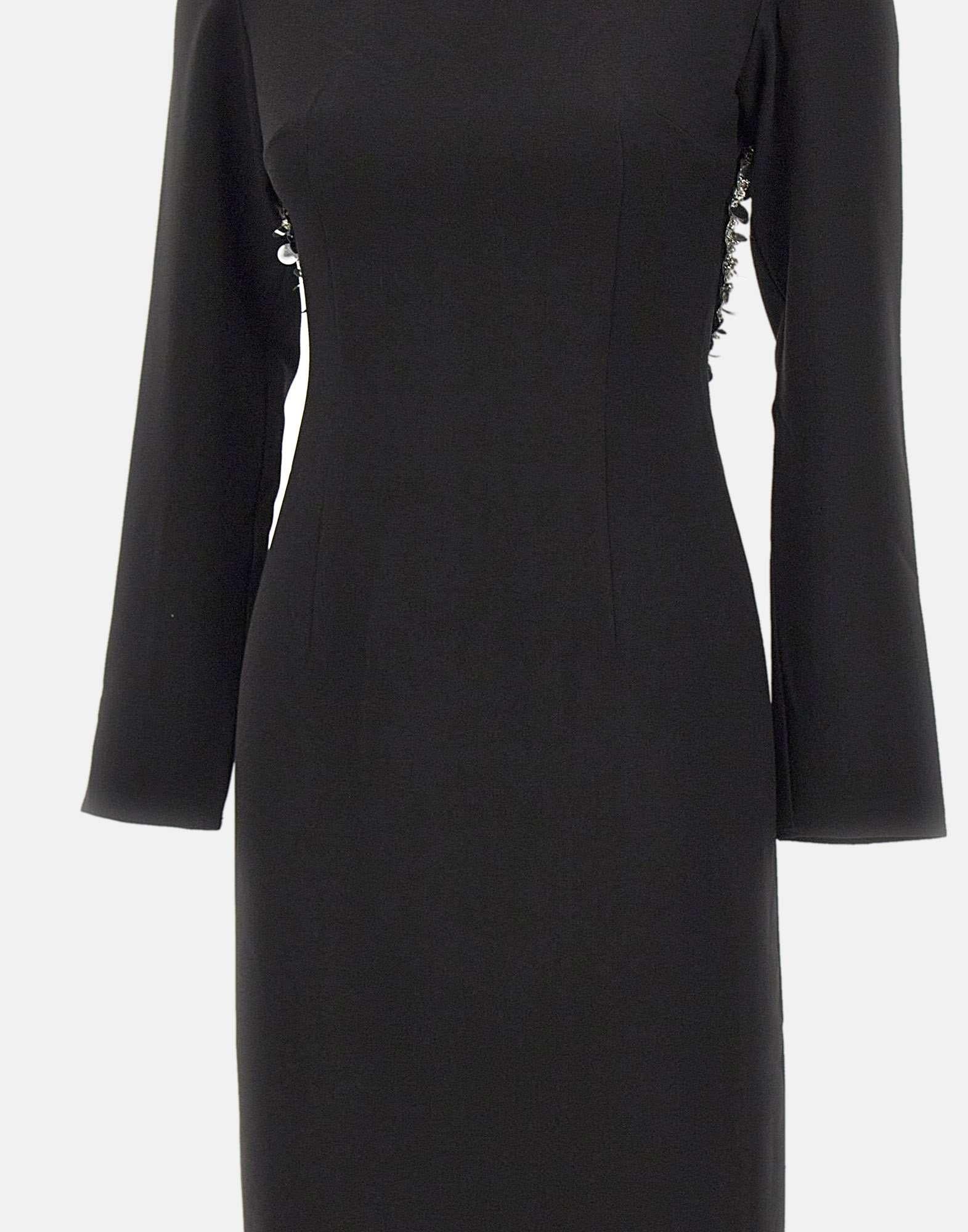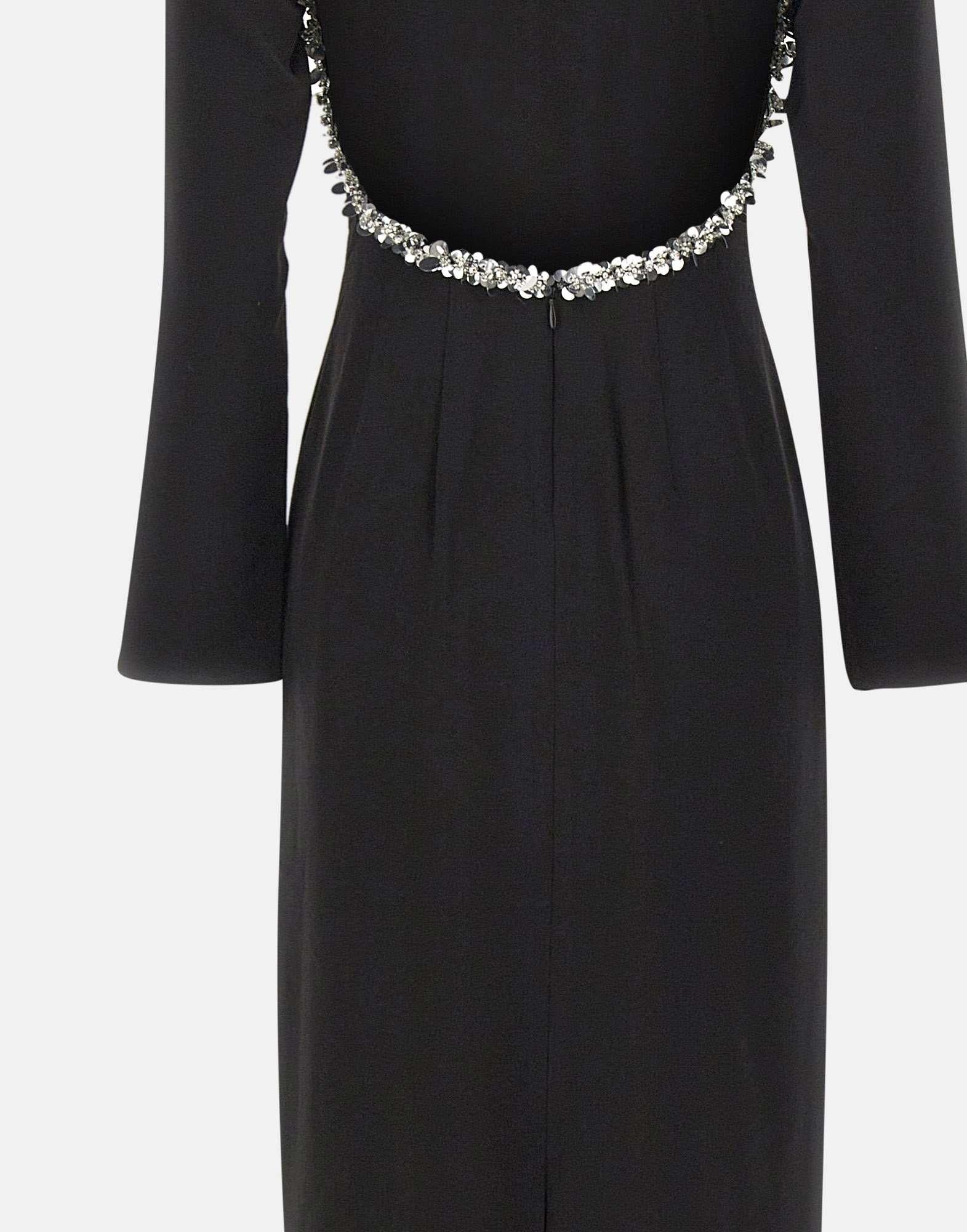 Rotate long black dress in crèpe, designed with a sleek and seductive silhouette. Features long sleeves, a crew neckline, and strong, structured shoulders. The open back is framed by shimmering sequins and crystal embellishments, secured with a delicate tie at the neck. A deep slit at the back hem adds movement, while the full lining ensures a flawless fit, perfect for striking evening occasions.