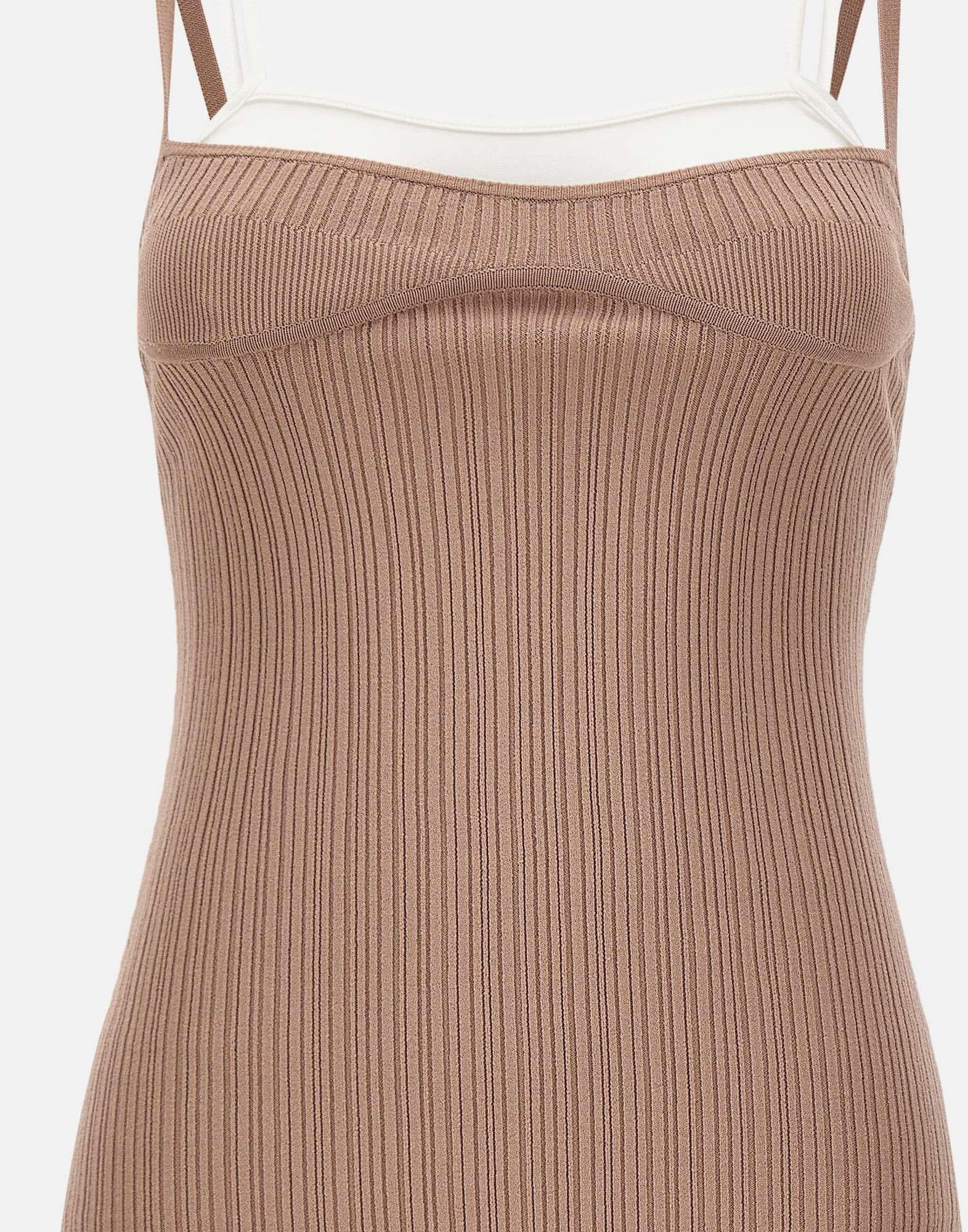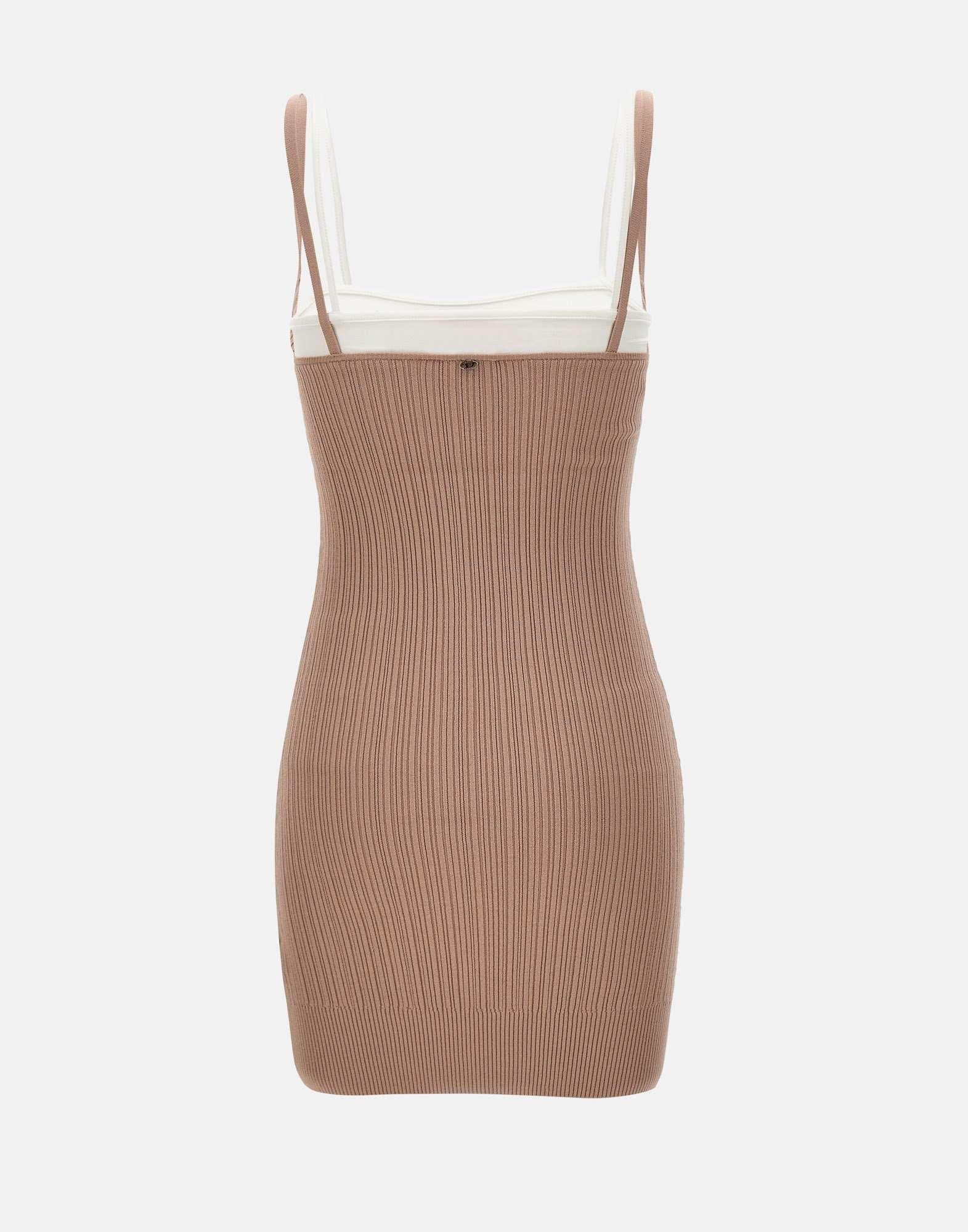 Women's Diesel "M-Zandra" short dress crafted from stretch knit fabric in a blush pink shade, designed to enhance the silhouette with a modern, feminine aesthetic. Features an underbust cut, straight neckline, and slim shoulder straps for a clean look. The design is completed by a contrasting white underlayer band, also with straps, creating a layered effect with visual contrast. The slim fit hugs the body, making it perfect for contemporary, statement styling.