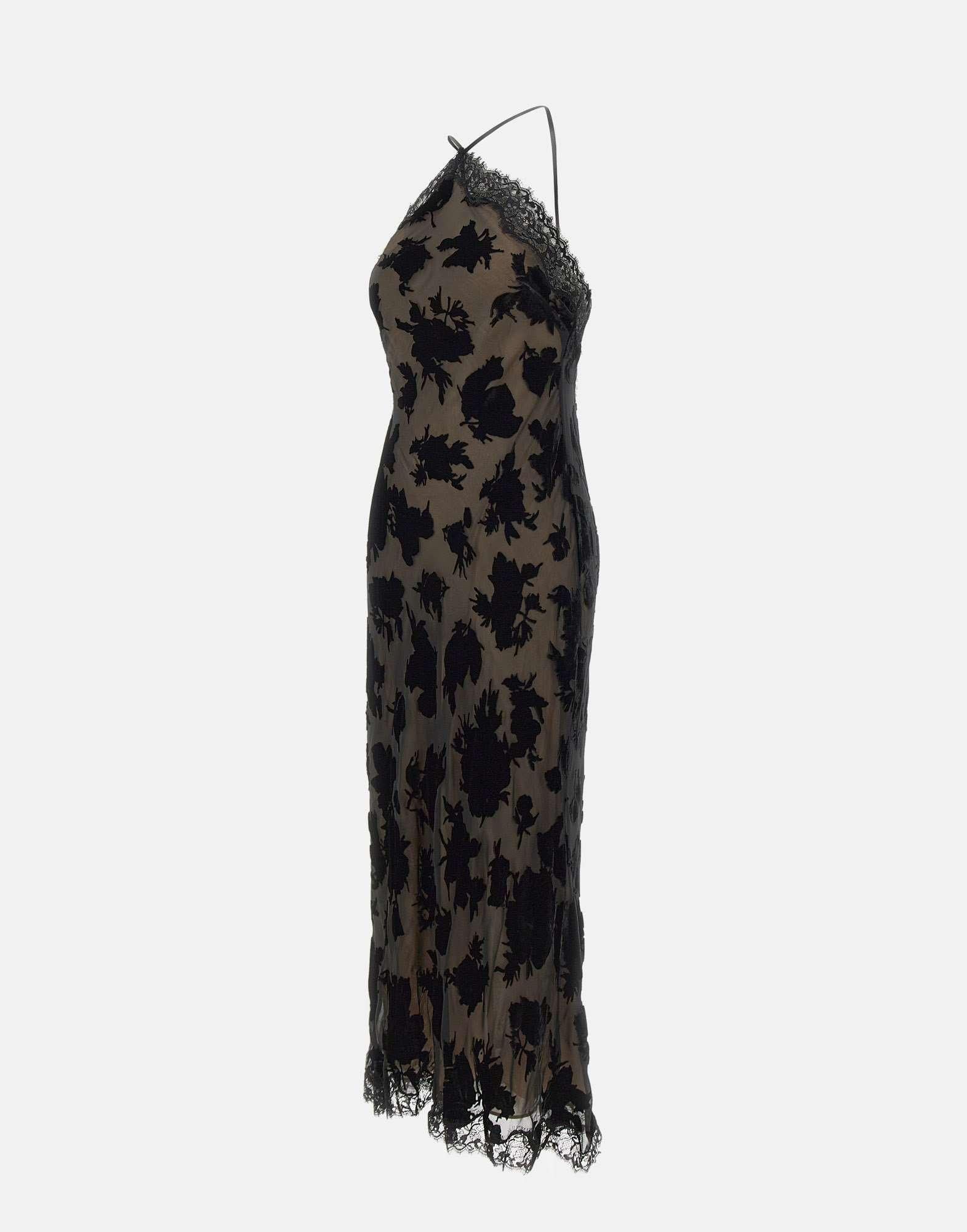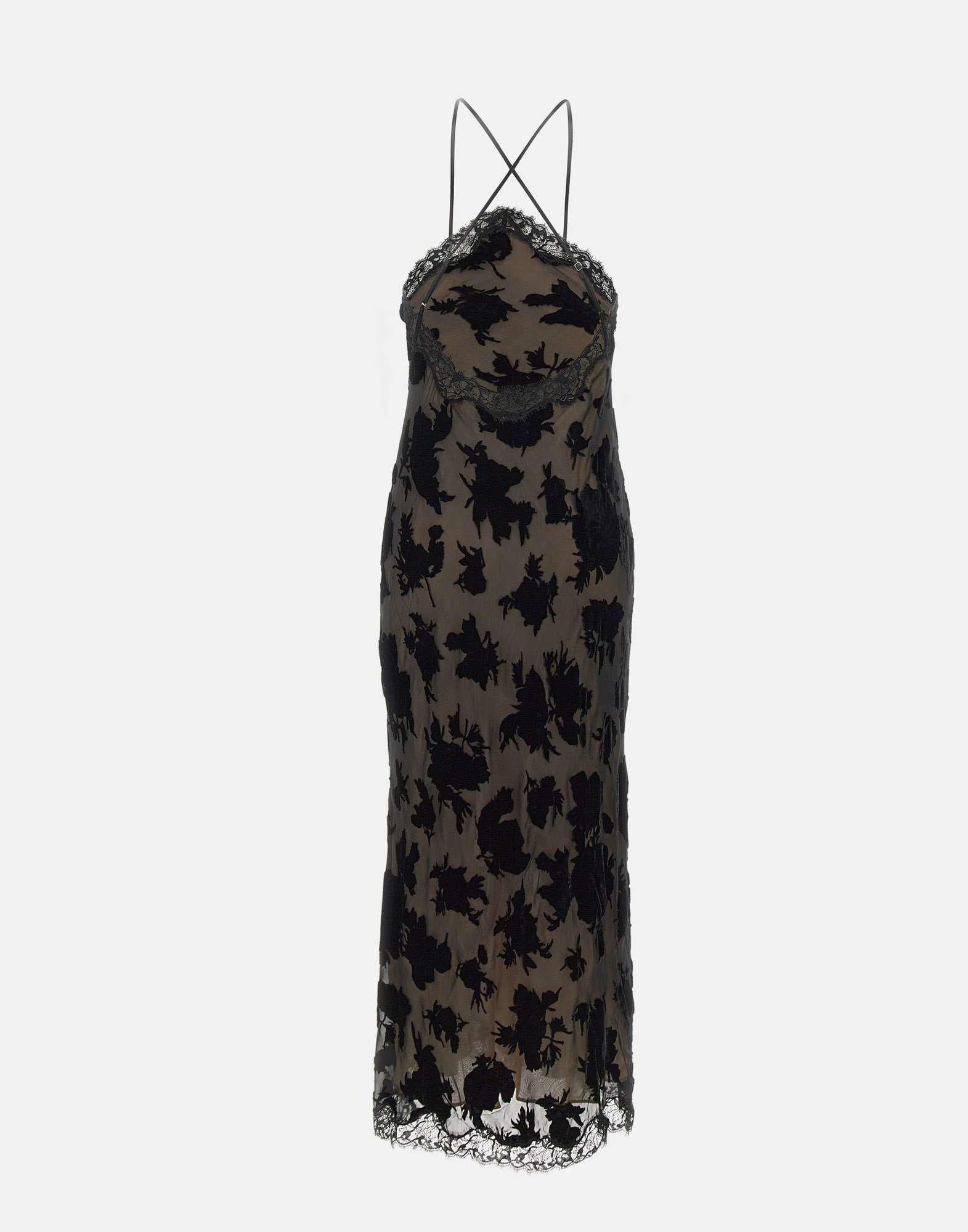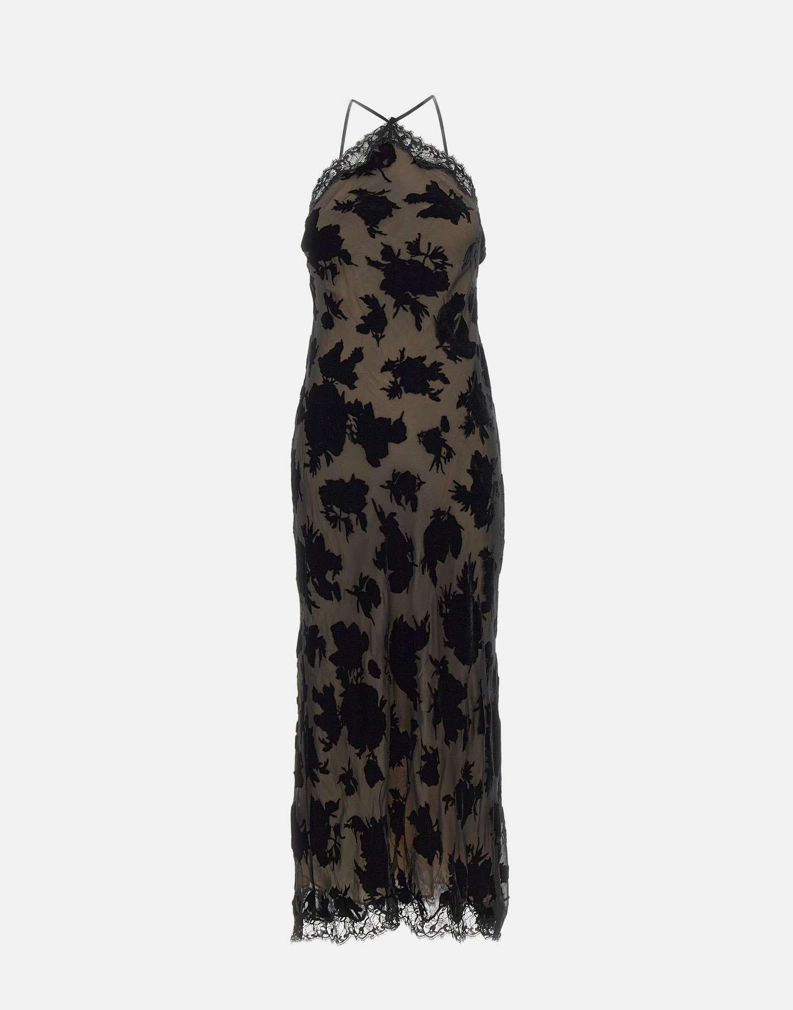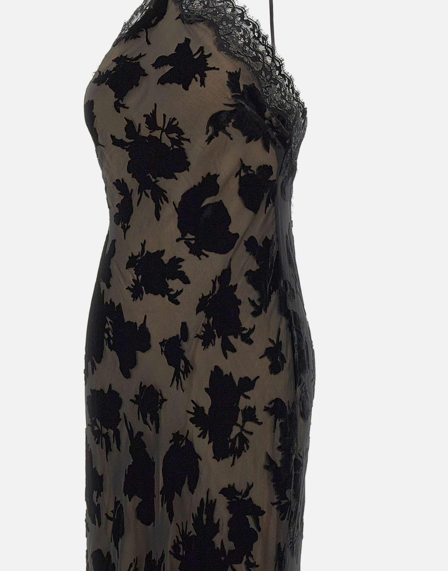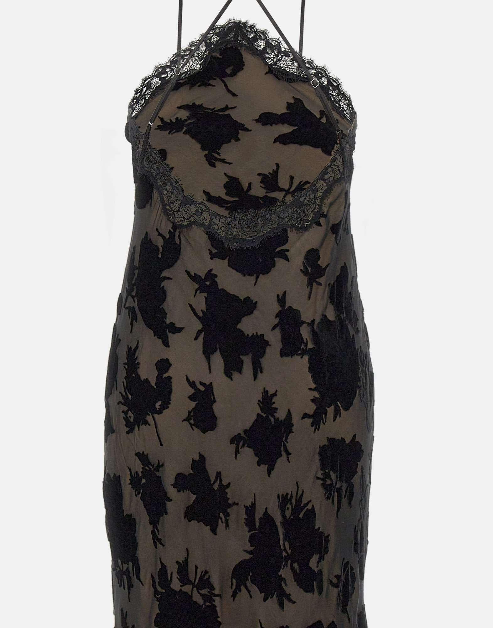 Rixo "Harlan" dress inspired by 90s, in black, crafted from devoré silk velvet with refined lace inserts. The slip design, with a unique bias cut, accentuates the silhouette in a fluid and feminine way. It features an open back and shoulders, thin adjustable straps, and a midi length. Fully lined, it offers a regular fit and timeless elegance, perfect for evening occasions or special events.