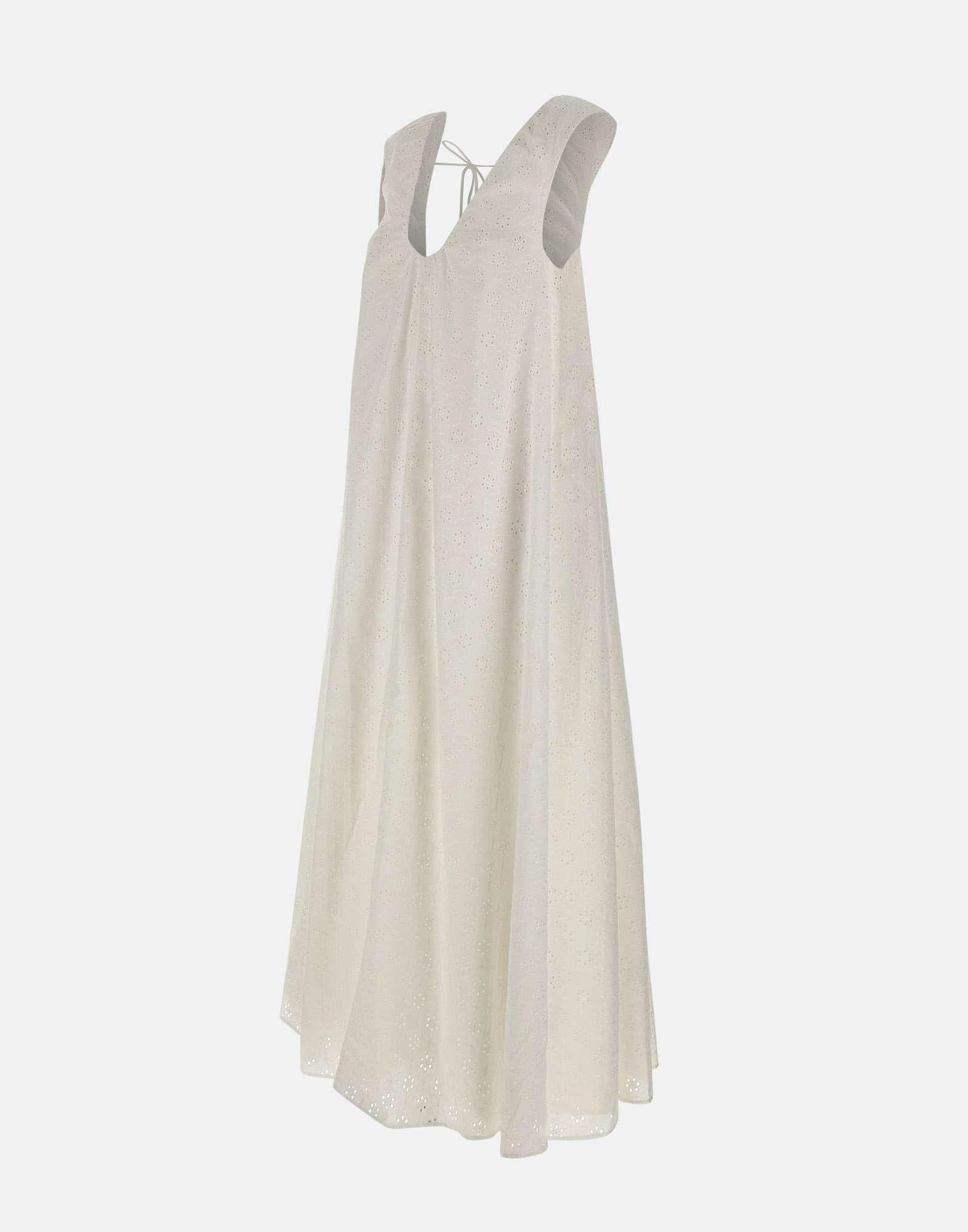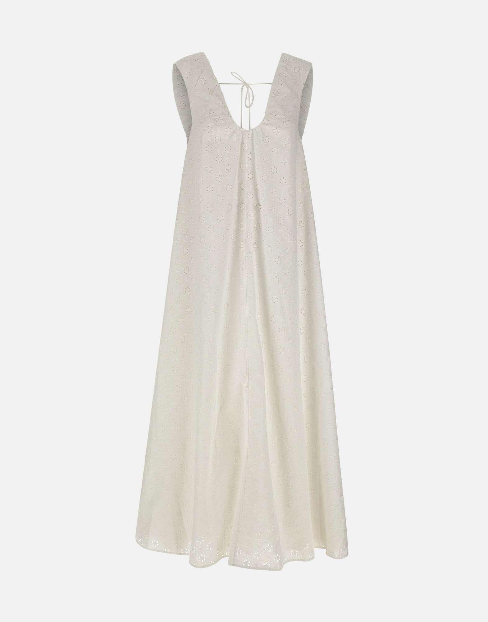 Faithfull "Juana Valentina Broderie" maxi dress in delicate white broderie anglaise, inspired by vintage elegance. Crafted in a warm off white tone, it features a relaxed A line silhouette with side pockets and a graceful boat neckline, mirrored at the back with a subtle tie and soft gathers. Designed to be slightly oversized, this dress is perfect for effortless summer occasions styled with simple sandals.