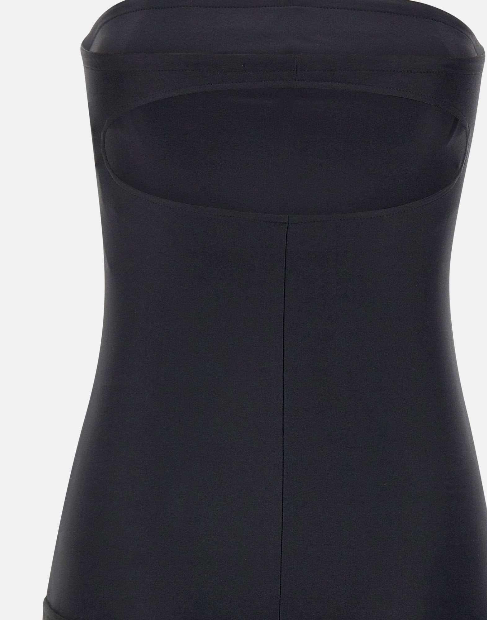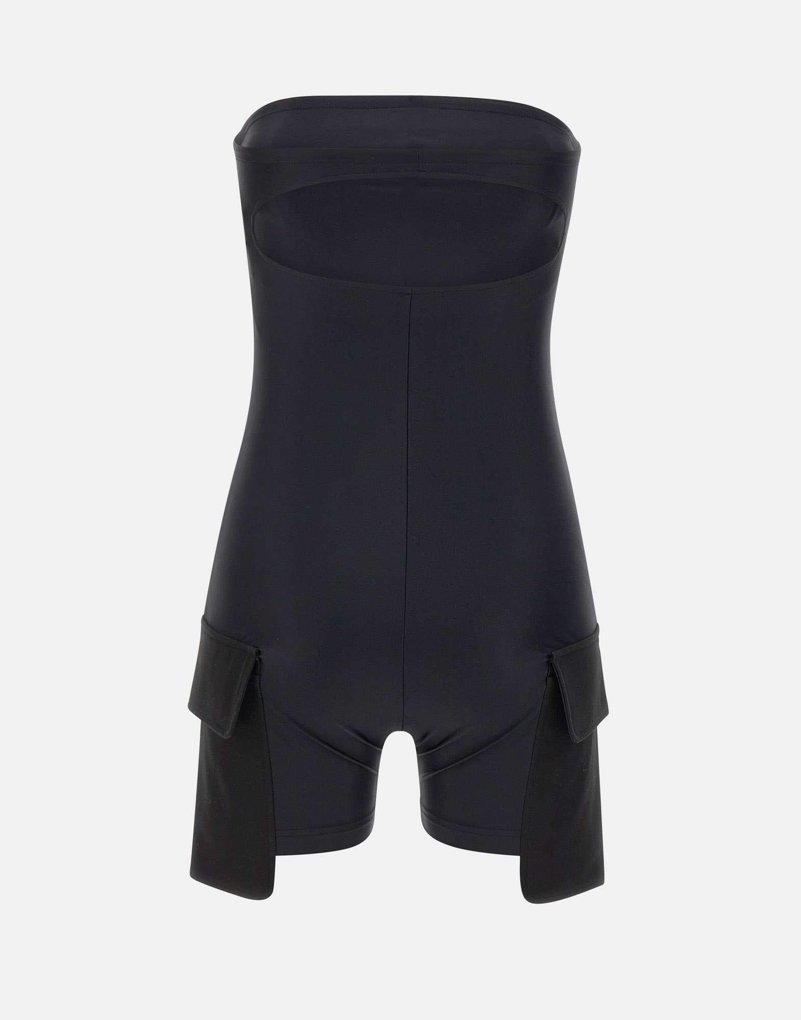 Courrèges "Tech Jersey Cargo Bodysuit" crafted from black stretch technical jersey, featuring a bold and contemporary design. The sleeveless silhouette offers a slim fit that enhances the figure. An embroidered logo on the chest adds a signature touch, while the two large side cargo pockets introduce a functional, urban element. The back cut-out detail delivers a striking accent while maintaining comfort and flexibility. A modern, performance-inspired piece for contemporary styling.