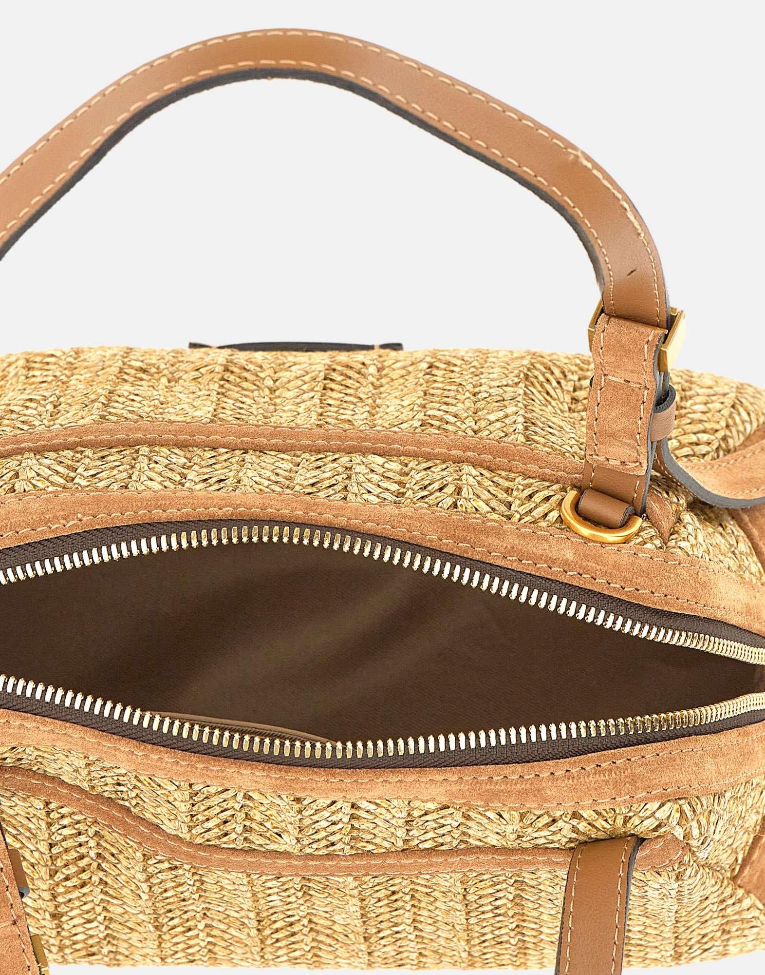 Gianni Chiarini women's handbag "Dea" crafted from dark beige woven straw with caramel suede leather trims, blending rustic-chic charm with a contemporary feel. The clean, on-trend shape is defined by geometric lines and a main compartment with a top zip closure. Branded details on the handles add character, while the adjustable, removable strap allows crossbody wear. Finished with a leather logo patch on the front and an inner slip pocket. Dust bag included. Made in Italy. Size: 26x16x14 cm.
