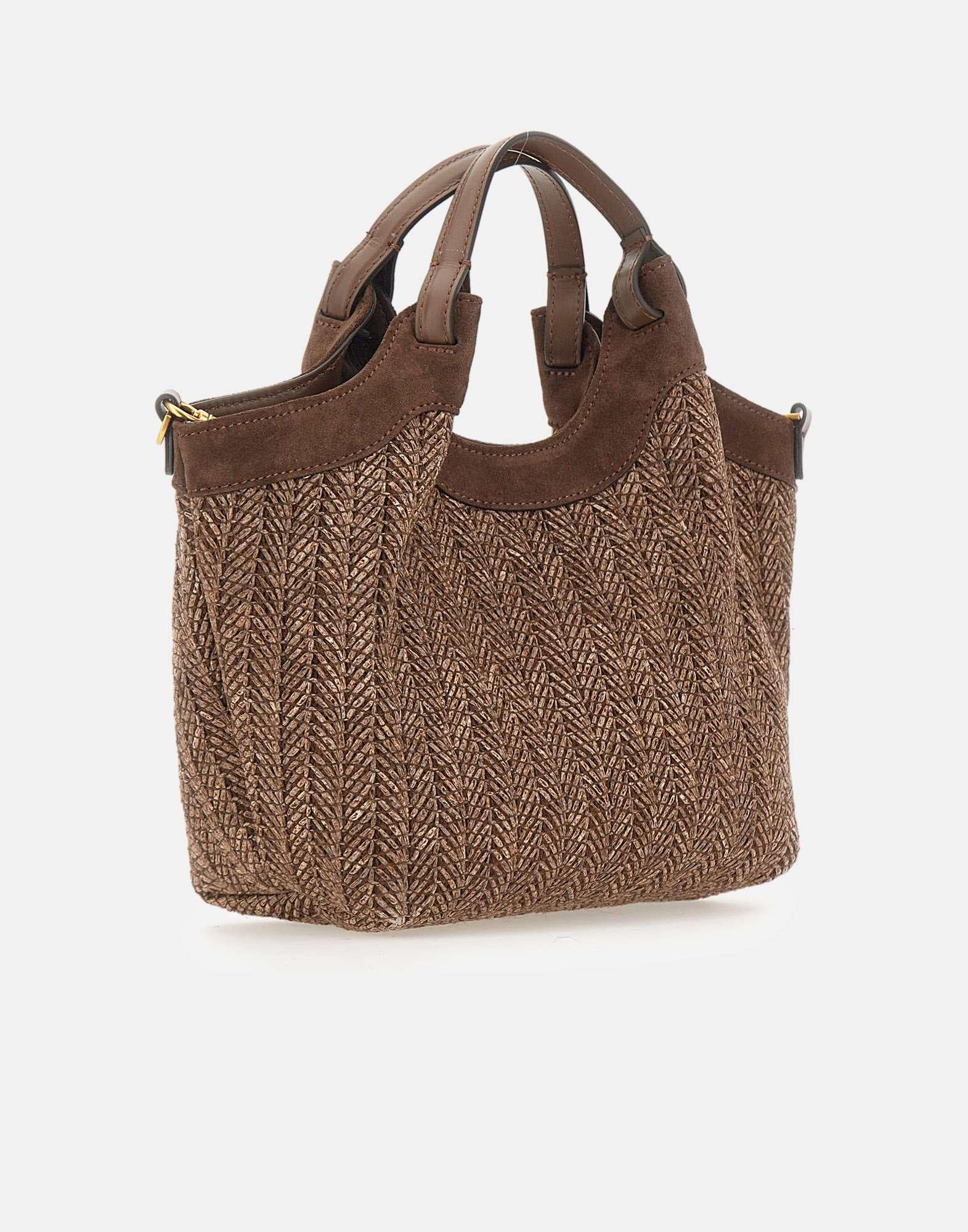 "Dua" Gianni Chiarini women's handbag crafted from chocolate woven straw with matching suede leather inserts, combining rustic-chic charm with a modern feel. Designed with a single compartment, it includes an inner leather pouch and is finished with a leather logo patch on the front. A magnetic button closure is complemented by a central hook that, when fastened, changes the shape of the bag. Carry it by hand or wear it crossbody thanks to the adjustable, removable leather strap. Dust bag included. Made in Italy. Size: 24x22x12 cm.