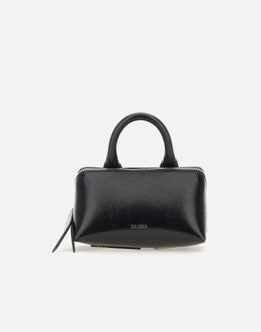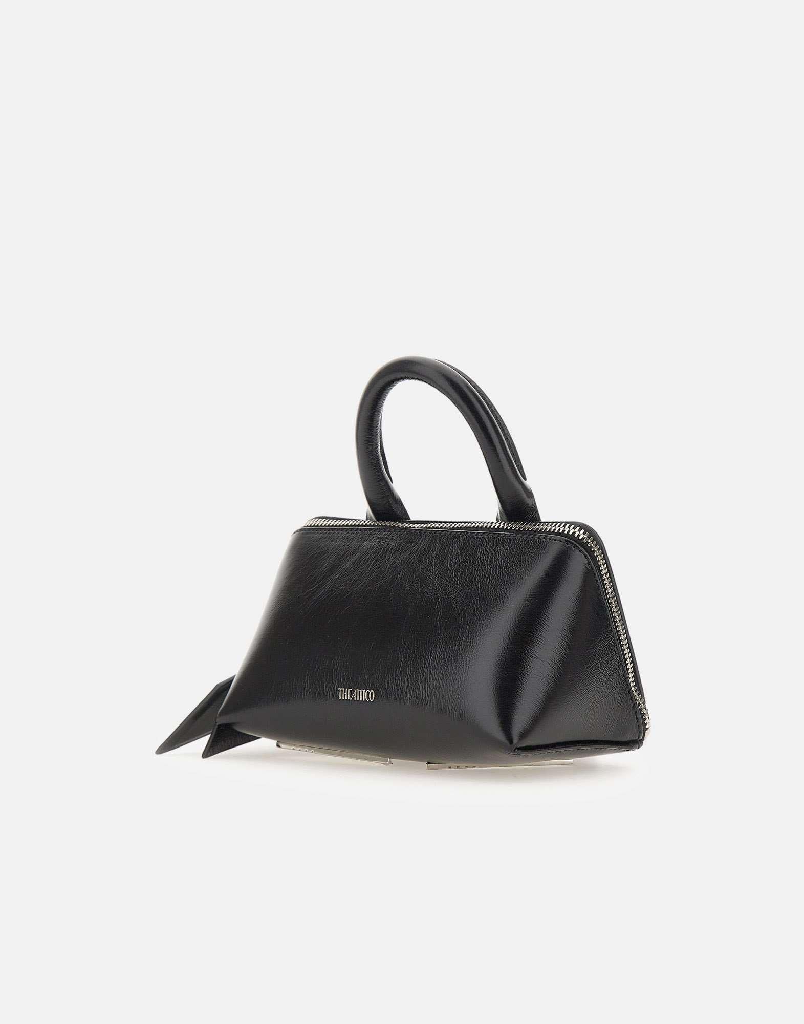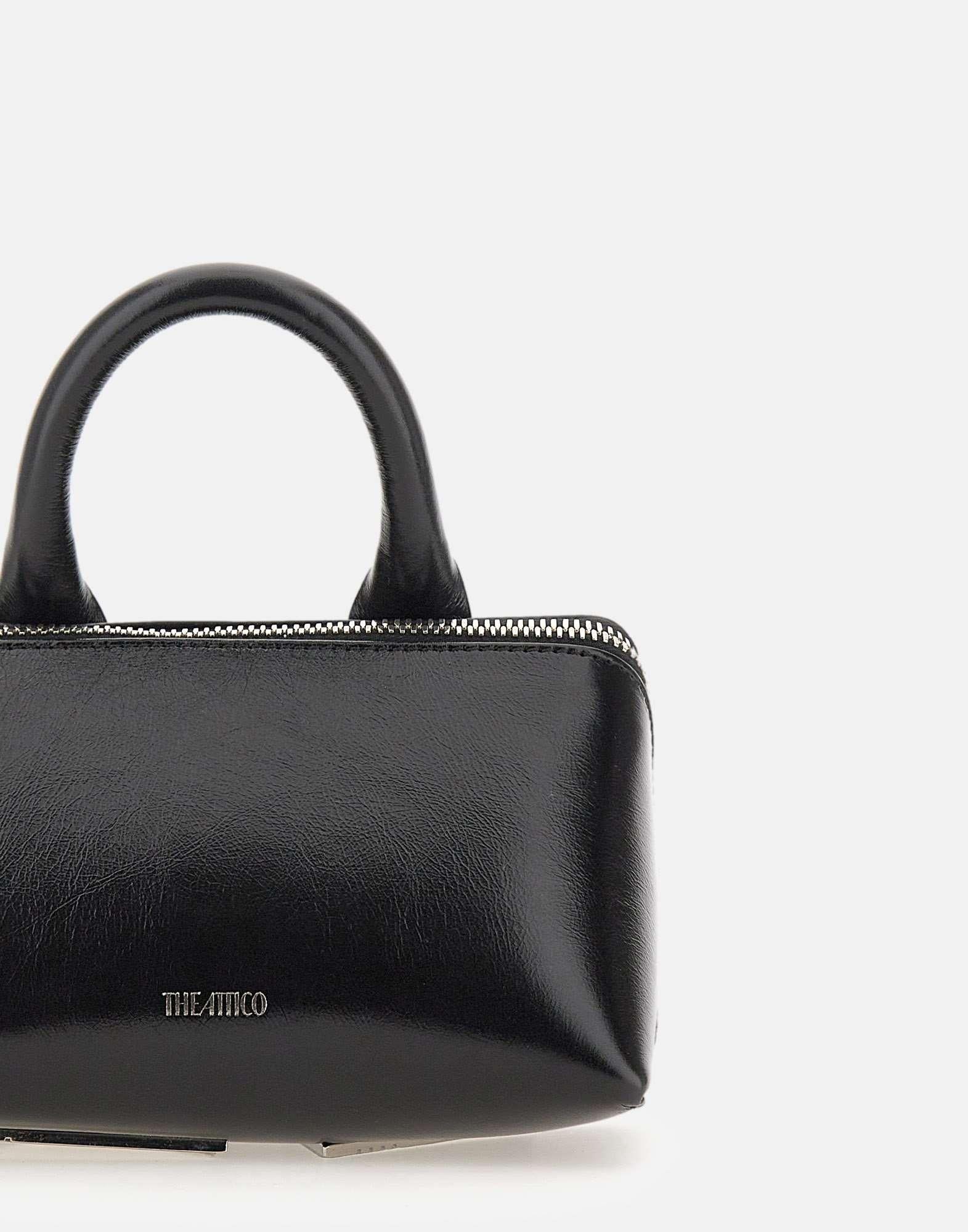 The Attico "Friday" women's bag crafted from black leather, defined by a compact and contemporary aesthetic. The trapezoidal silhouette is complemented by a top handle and an included shoulder strap, offering versatile styling options. The interior features a zippered pocket for essentials, while the silver embossed logo on the front adds a signature touch. A refined accessory designed for both day and evening wear. Dimensions: height 12 cm, width 18 cm, depth 12 cm. Made in Italy.