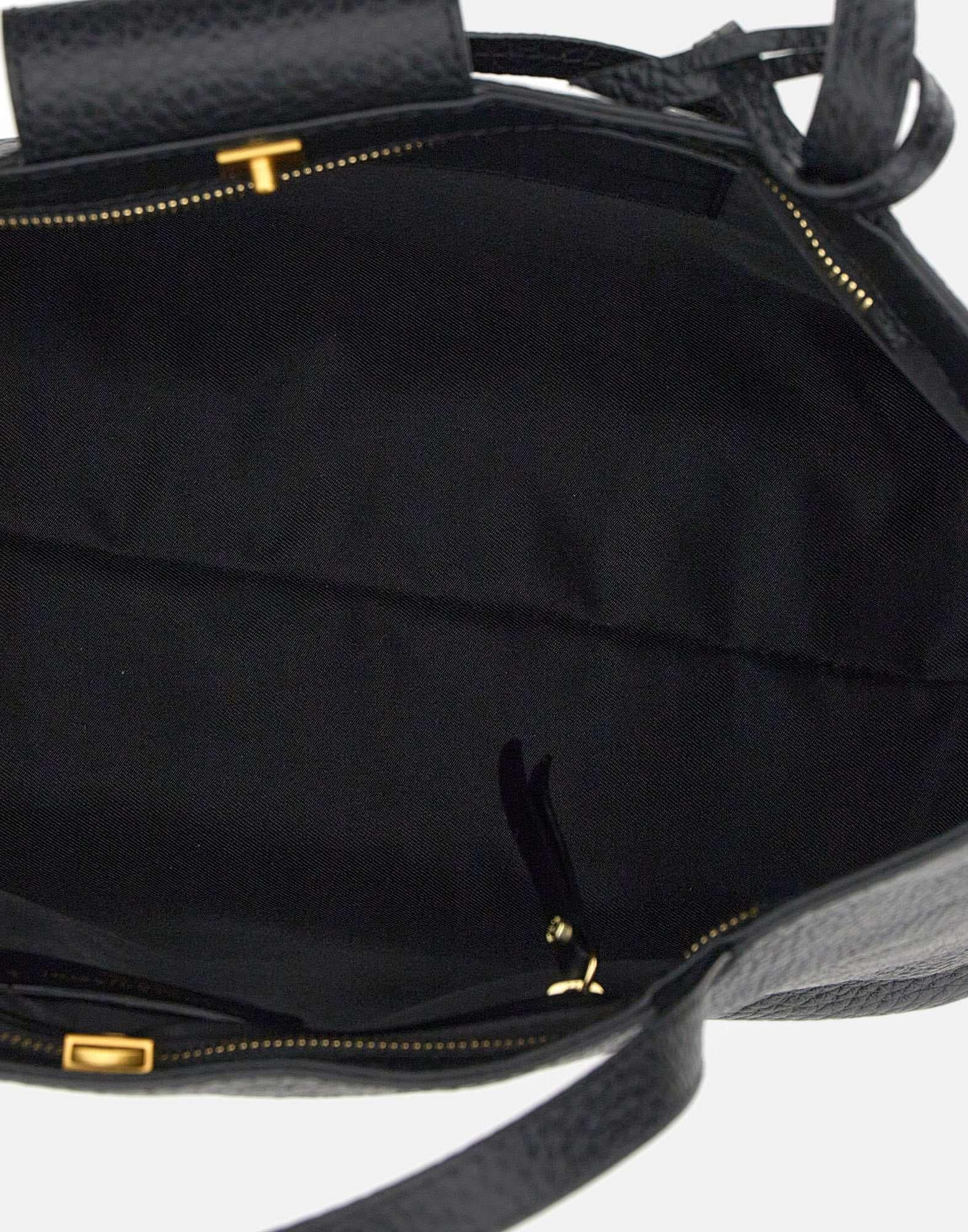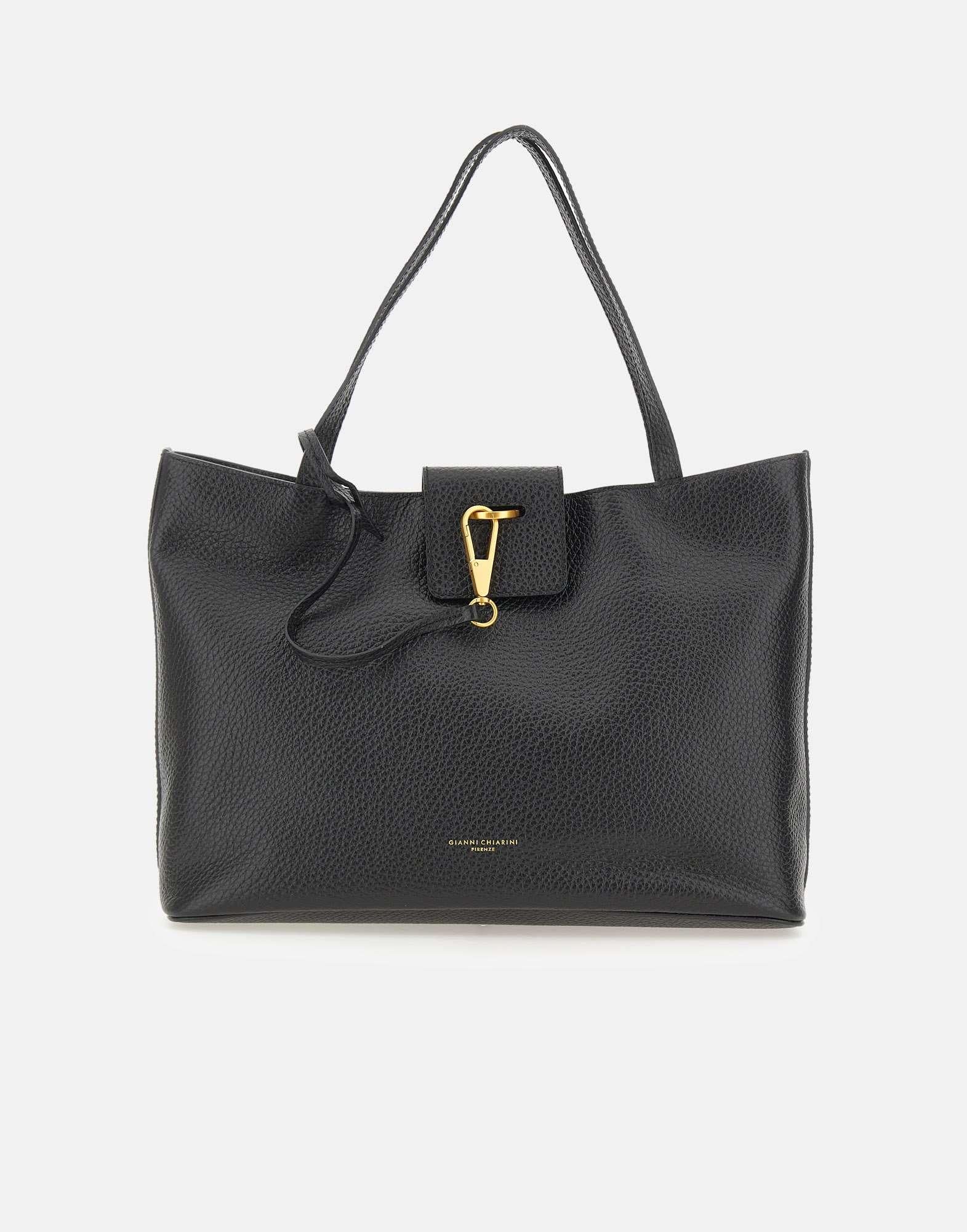 Gianni Chiarini "Marisol" shoulder bag crafted from black maxi-grain leather, featuring an elegant and functional design. It features a double top handle, a zip closure, and a gold-tone clasp for added security. The interior features multifunctional pockets, while the exposed stitching and gold plating enhance the sophisticated look. The logo embossed on the bottom, included dust bag, and dimensions: 42x18x31 cm complete the model. Made in Italy.
