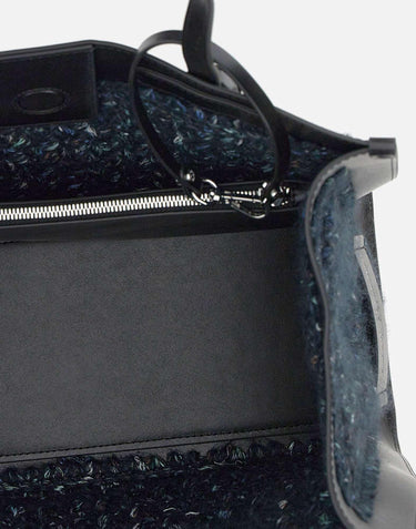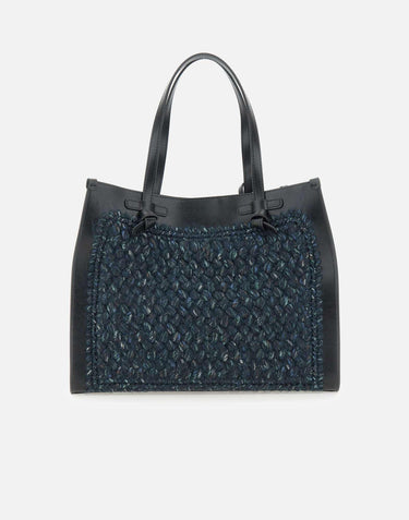 Marcella Club Gianni Chiarini "Marcella" woven wool fabric shoulder bag, black and shades of blue, smooth leather profiles, double upper handle with woven details, magnetic button closure, clutch bag included, roomy and comfortable. Dimensions: 31cm height, 38cm length, depth 16cm, dustbag included.
