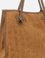 Marcella Club Gianni Chiarini "Marcella" crocodile-print suede shoulder bag, cognac color, double top handle with knot detail, contrasting stitching, removable leather pouch included, internal pockets, external side logo, magnetic button closure. Dimensions: 31cm height, 38cm length, 16m depth. Made in Italy, dustbag included