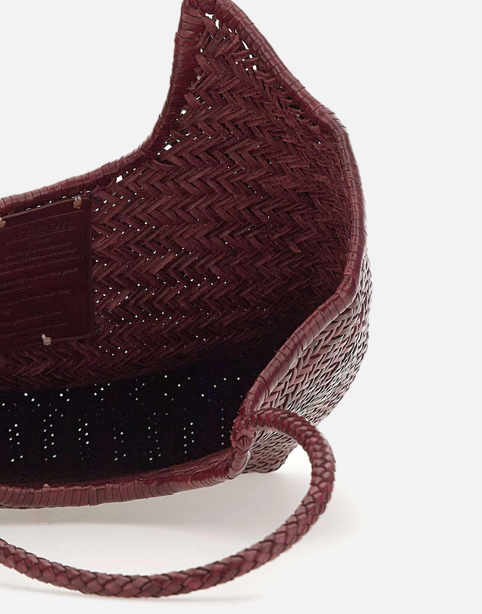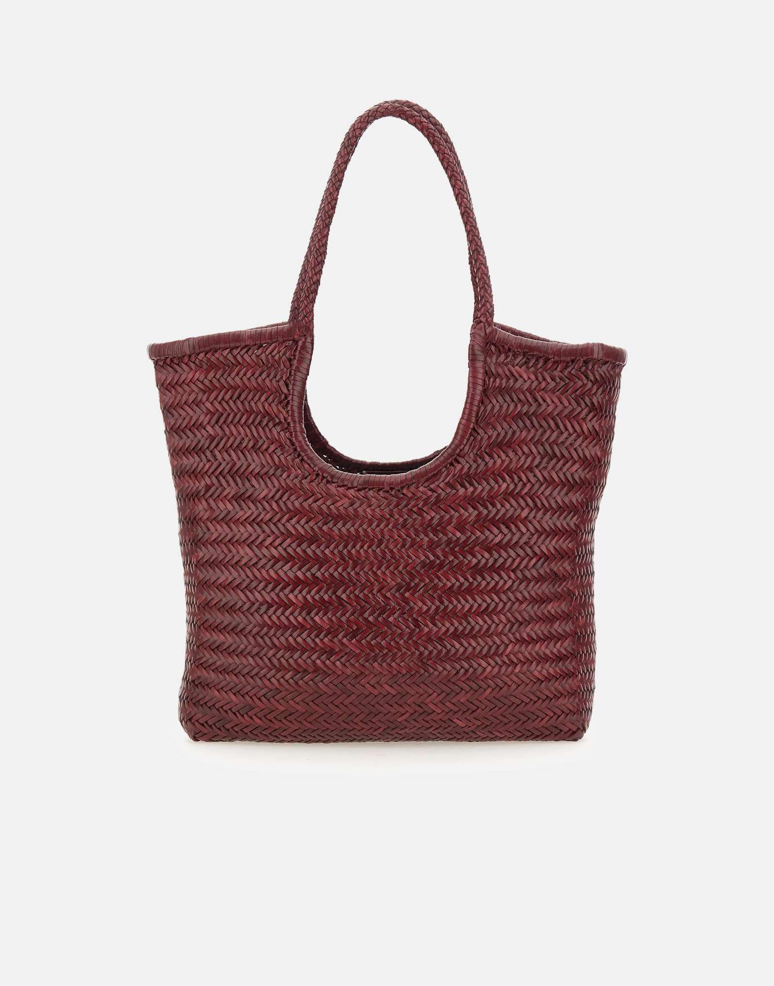 Dragon Diffusion "NS Diagonal Triple Jump" shoulder bag in dark red calf leather, hand-woven in an elegant vertical design. Deep and unlined, it features comfortable braided handles and an open top for easy access to all essentials. Each bag includes a hand-stitched Saint Christopher medal inside, the brand’s seal of authenticity and tribute to artisanal heritage. Dimensions: height 33 cm, width 30 cm, depth 7 cm.