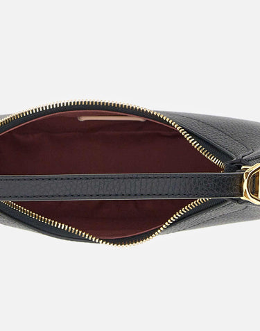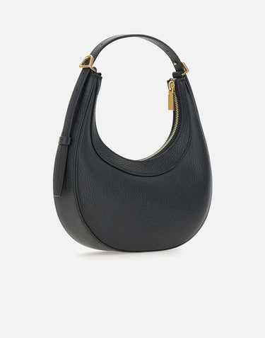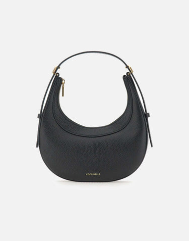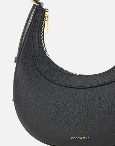 Coccinelle "Pip Coccinelle Whisper" bag, black, tumbled effect leather, crescent shape, top handle, gold plated, should strap 100cm, top zip closure, front logo, inside pocket, dustbag included, measurements: height 21cm from handle, length 23cm, depth 5cm.