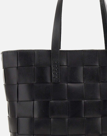 Dragon Diffusion "Japan Tote" shoulder bag in black handwoven leather, crafted using the brands signature artisanal technique. Fully lined, it features double top handles and internal pockets, including one with a zip closure. A hand-stitched St. Christopher medallion inside symbolizes protection for travelers. Includes fabric dustbag. Measurements: top width 36 cm, bottom width 32.5 cm, height 25 cm, handle drop 19 cm.