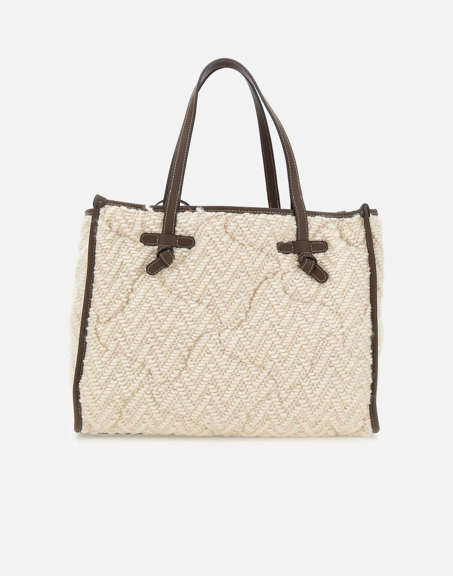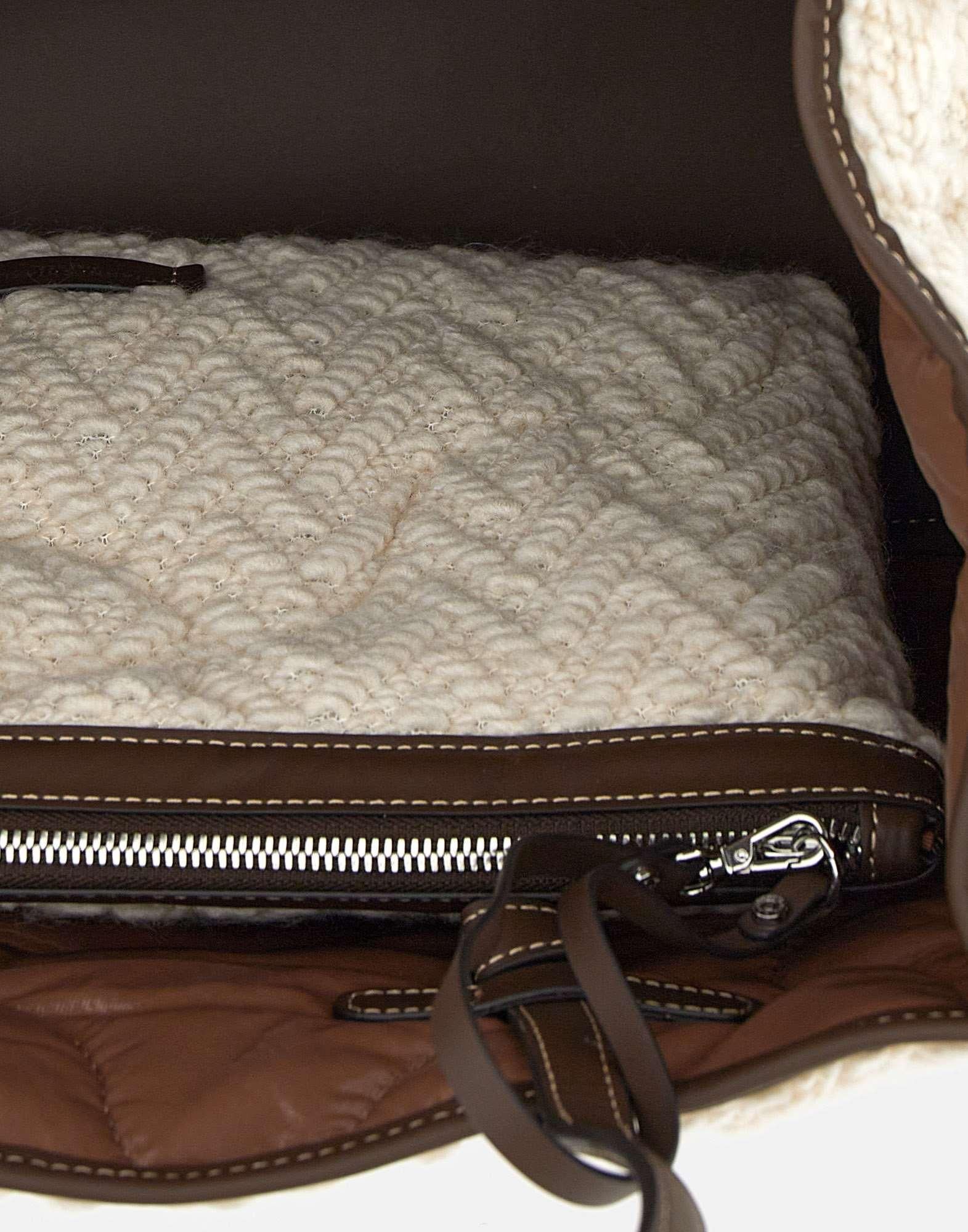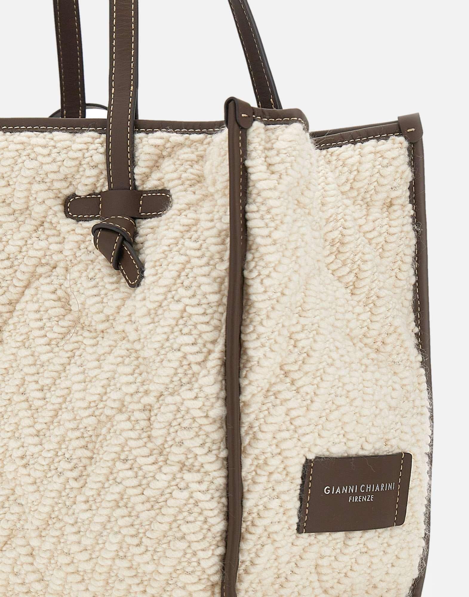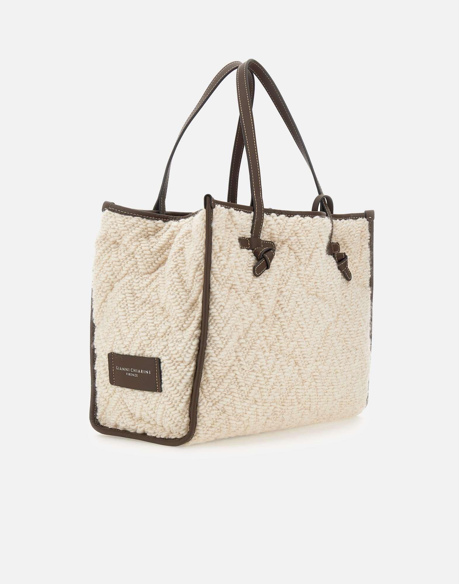 Marcella Club Gianni Chiarini "Marcella" shoulder bag, cream, in textured wool-effect fabric, dark brown leather trim, extra roomy and comfortable, quilted interior, pouch included, double top handle, external side logo, dust bag included.