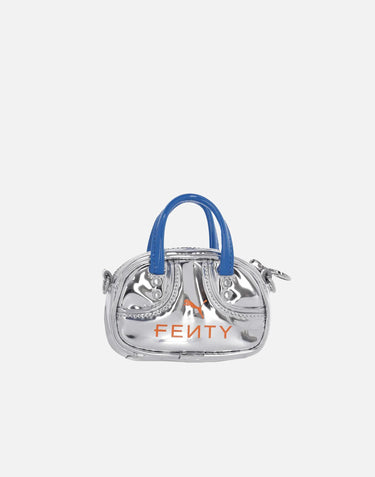 FENTY x PUMA mini bag by Rihanna, blending sports and style in a high-energy collaboration. Features a mirrored silver finish with electric blue accents, adjustable and removable shoulder strap, and orange logo zip closure on the front. Compact yet distinctive, with a 0.2 L capacity and dimensions: 15.5 x 4 x 6 cm. Perfect to add a bold, iconic touch to any outfit.
