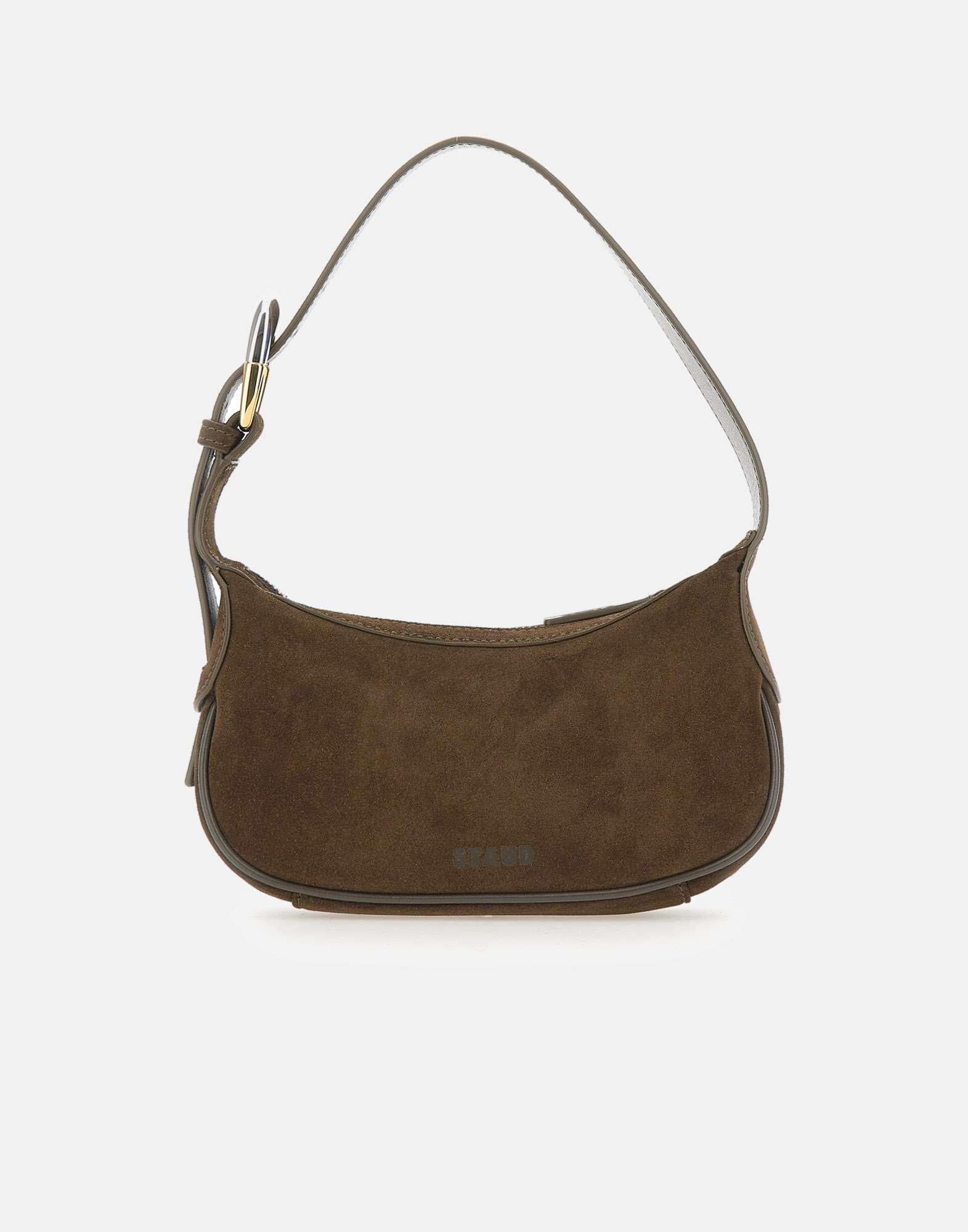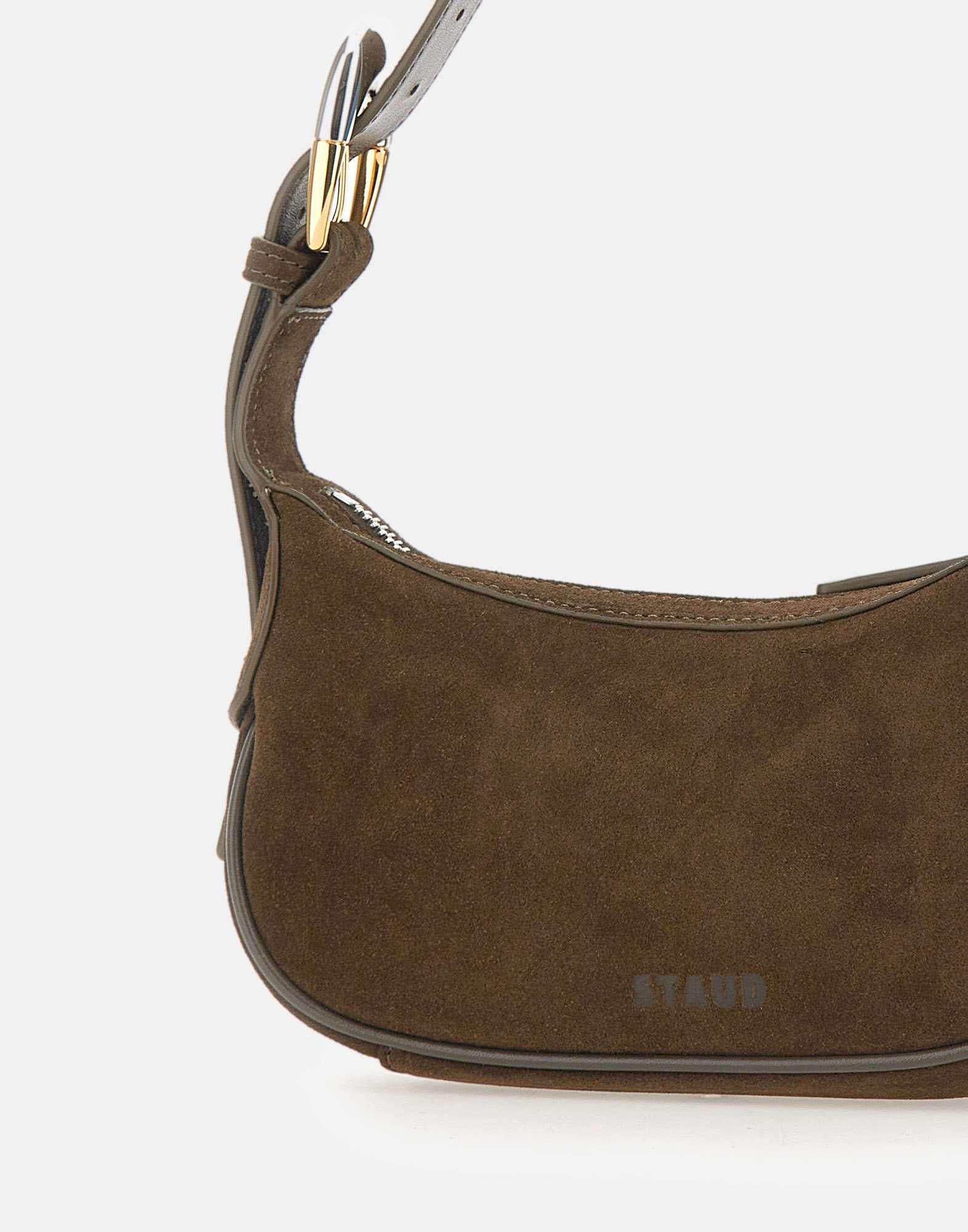 Staud "Own Bag Truffle" womens bag in dark brown suede, featuring an oversized side buckle in silver and gold tones. Includes a zip closure, embossed front logo, leather trims, and an adjustable handle for versatile wear. Dimensions: height 10 cm, width 21 cm, depth 5 cm. An elegant, contemporary accessory ideal for sophisticated outfits.