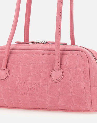 Margesherwood "Soft Boston Bag," pink, crafted from 100% Italian crocodile-effect suede cowhide. The compact and refined design features a double top handle, a two-way zip closure, and silver hardware. The lined interior features a zip pocket for added convenience. Dimensions: 29 x 12 x 7 cm; strap: 24 cm; weight: 340 g. Complete with dust bag, this exclusive accessory combines craftsmanship and contemporary style.