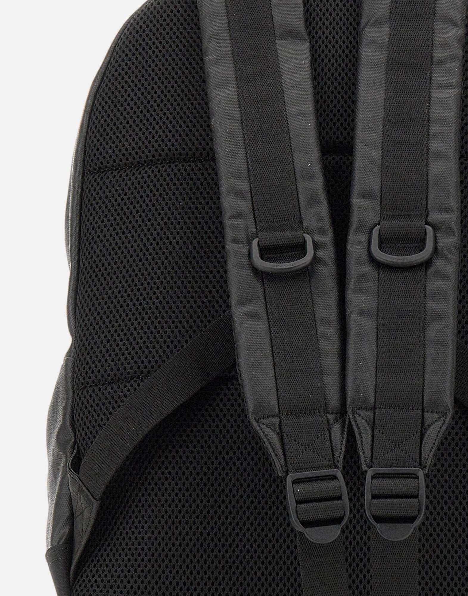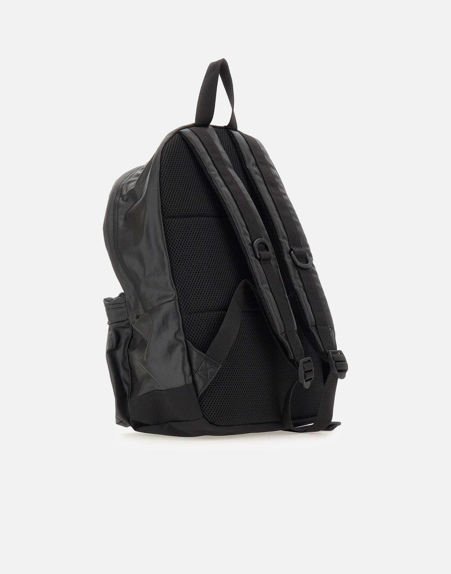 Carhartt WIP "Dean Backpack", crafted in durable coated fabric and presented in black. The design features a two-way top zip closure, front pockets with square logo label, and silver-tone hardware. The interior includes a pocket and divider, while the mesh back panel and padded adjustable shoulder straps ensure comfort and practicality. Dimensions: 28x14x40 cm.