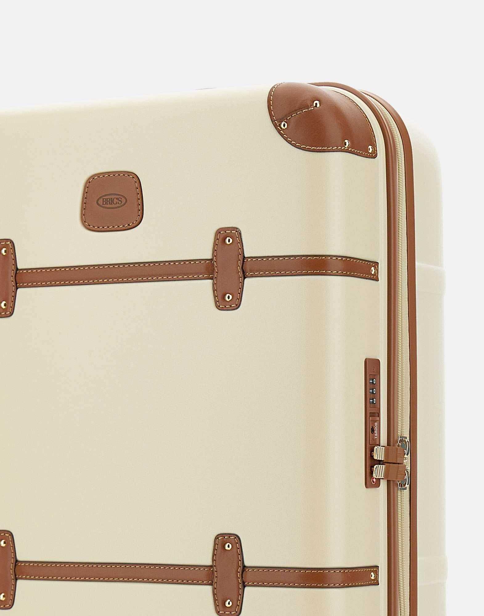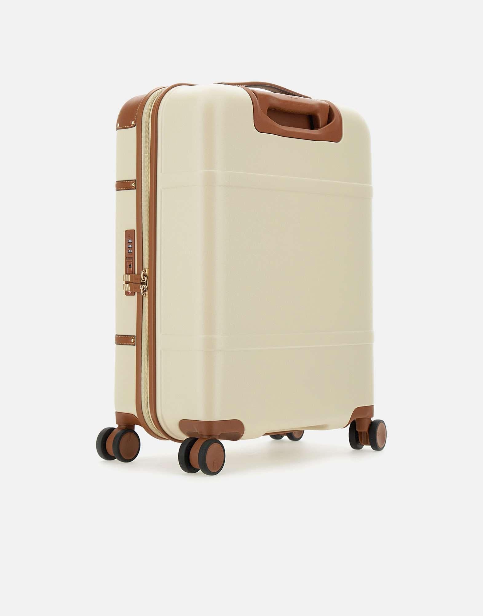 Bric s Bellagio trolley bag cream-coloured with leather piping, made of recycled polycarbonate, light and flexible, ultra-resistant and shockproof, TSA lock, zip with tamper-proof system, interior with compression system, divided into two compartments, removable retractable handle made of sturdy, strong aluminium tubing with intermediate stop positions to adjust the height as required, ergonomic handle, four double 360° swivel wheels, distinctive Bric's leather details, leather address holder, measures height 55cm, length 38cm, depth 23cm, transparent cover included.