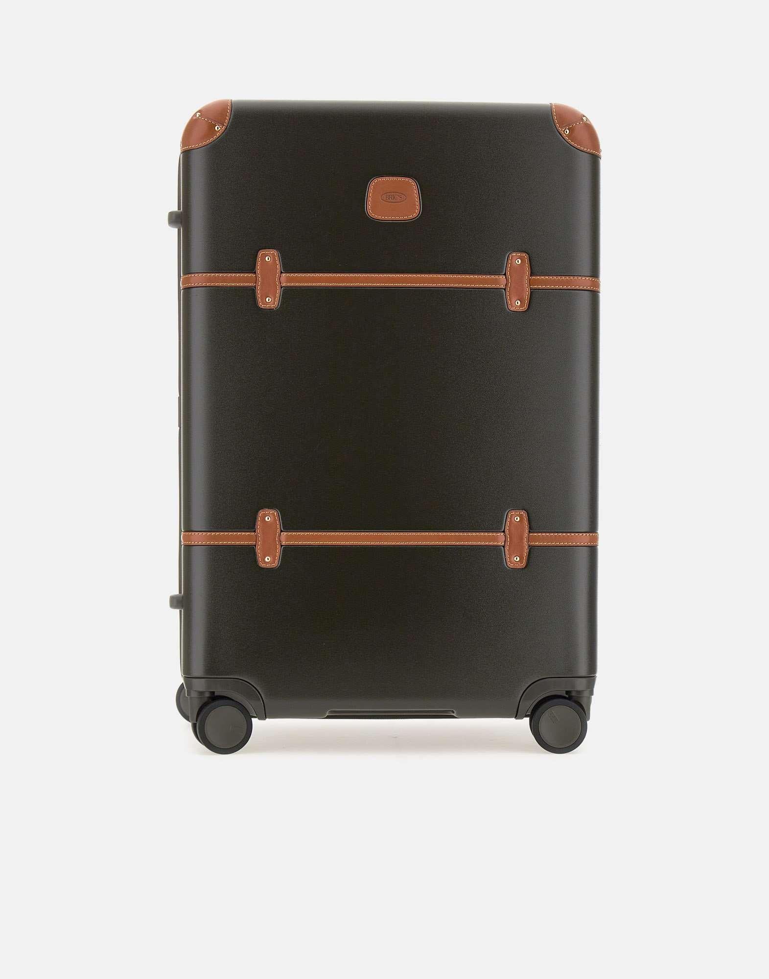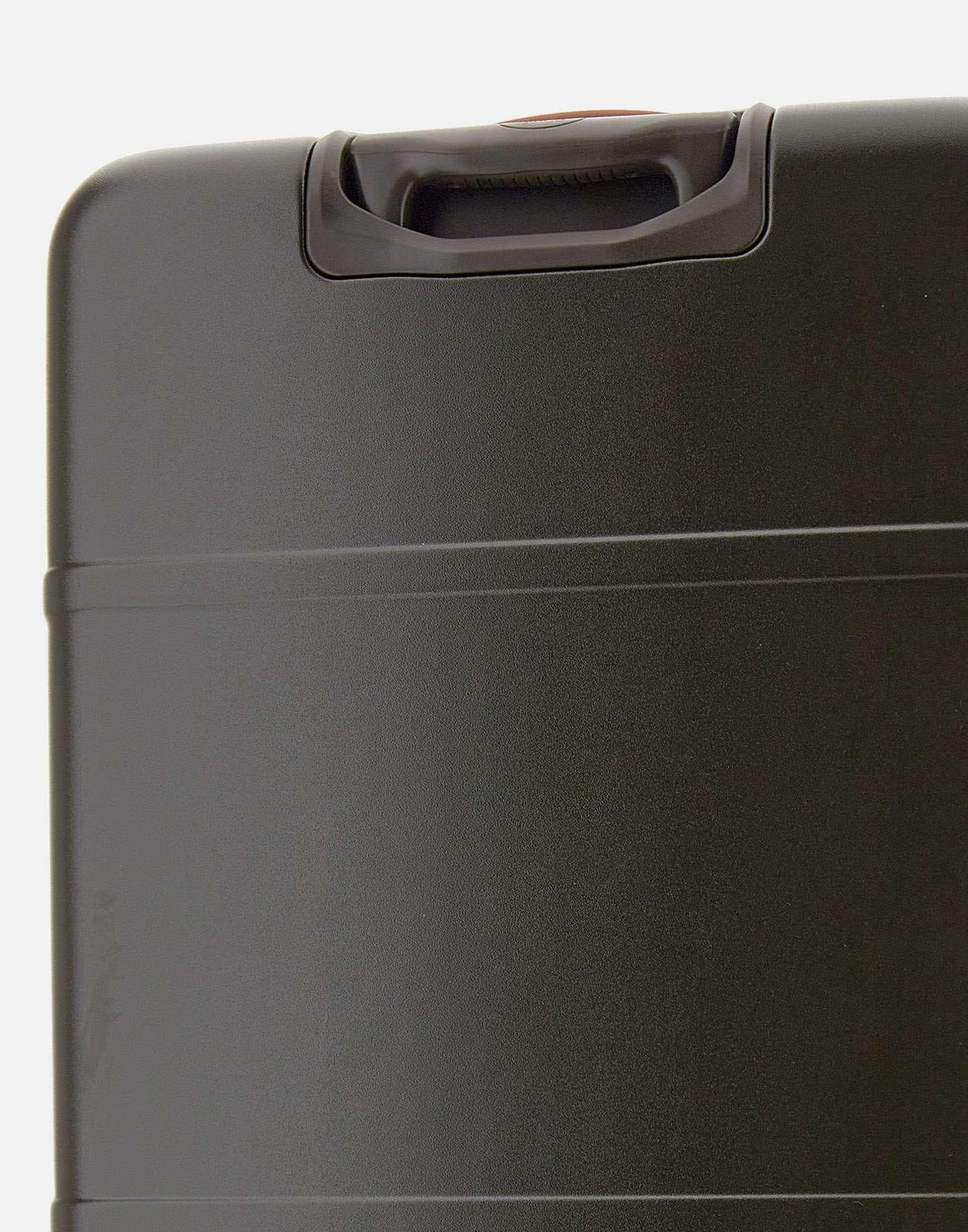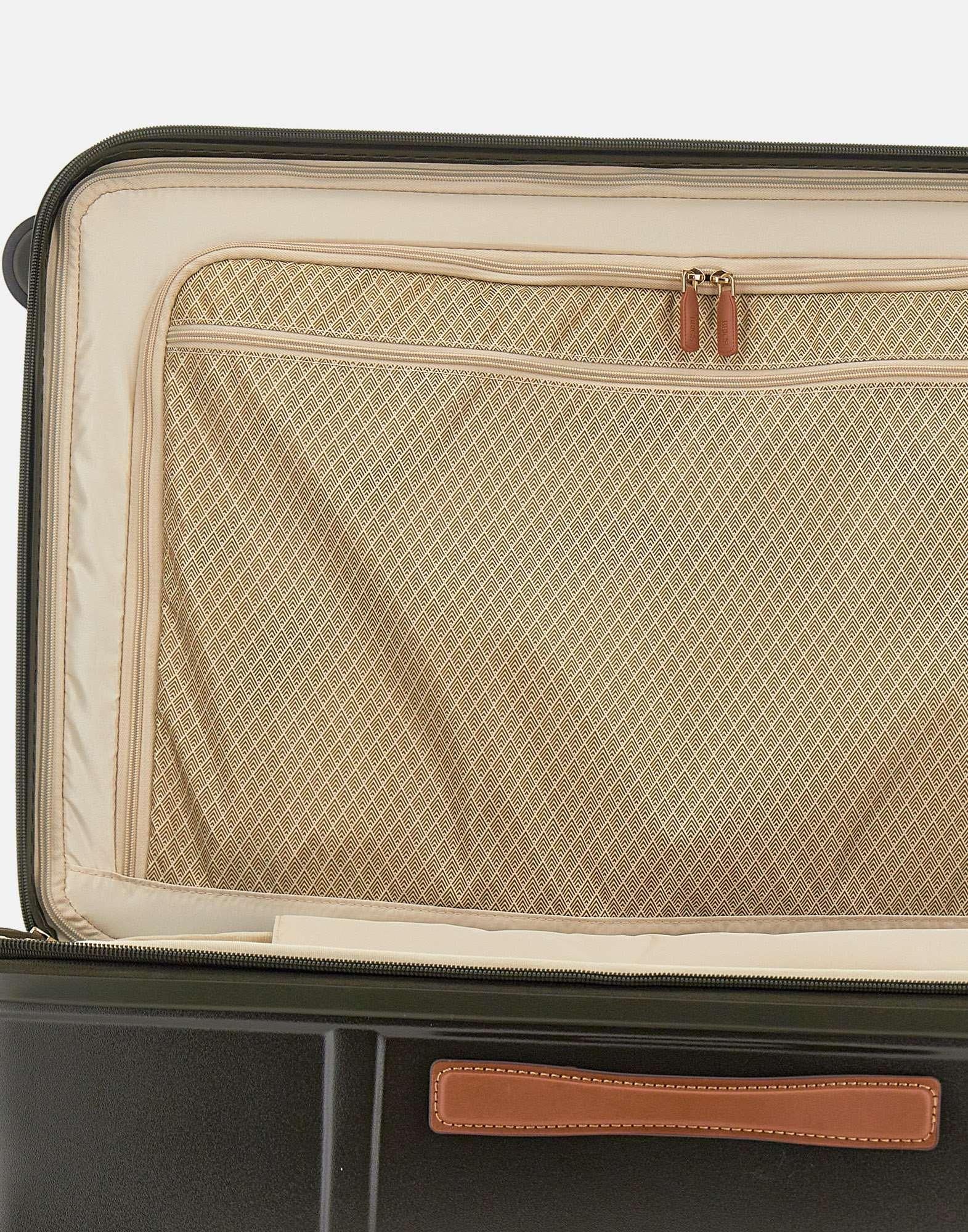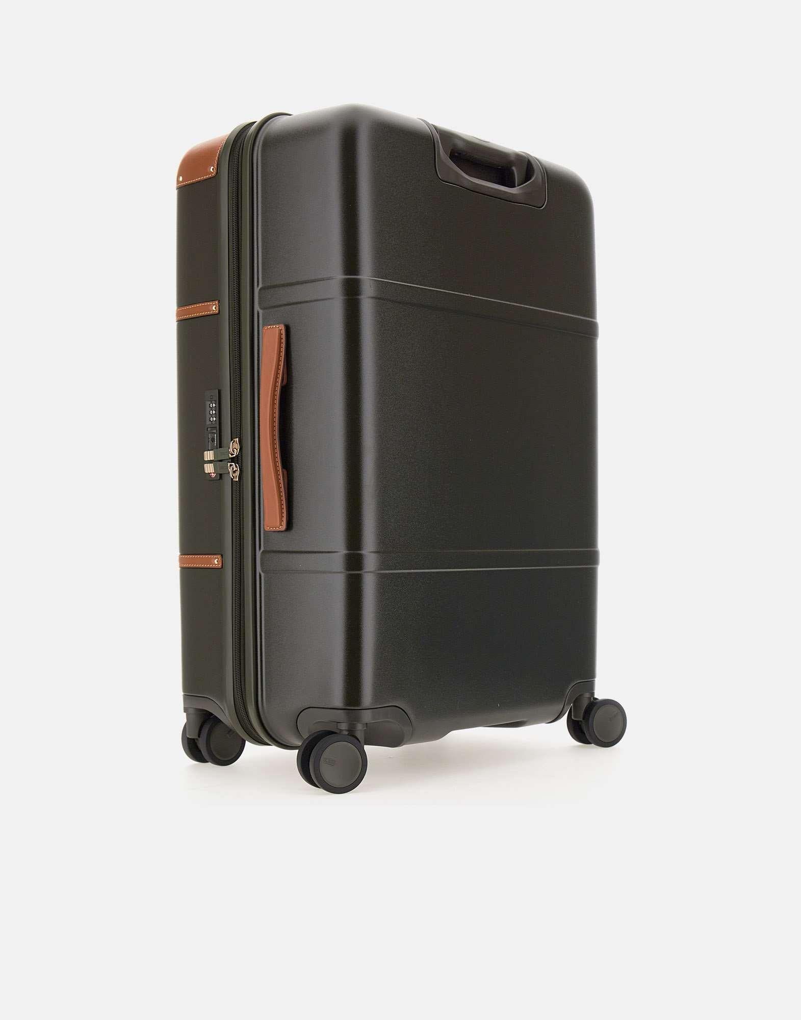 Bric's "Bellagio" trolley , olive color, Tuscan leather inserts, high-tech shell made of Makrolon® polycarbonate, an innovative material that provides maximum impact resistance, protective feet, four 360° swivel wheels, front logo, two-way front zipper closure (lockable and waterproof), side and top handles, TSA combination lock.