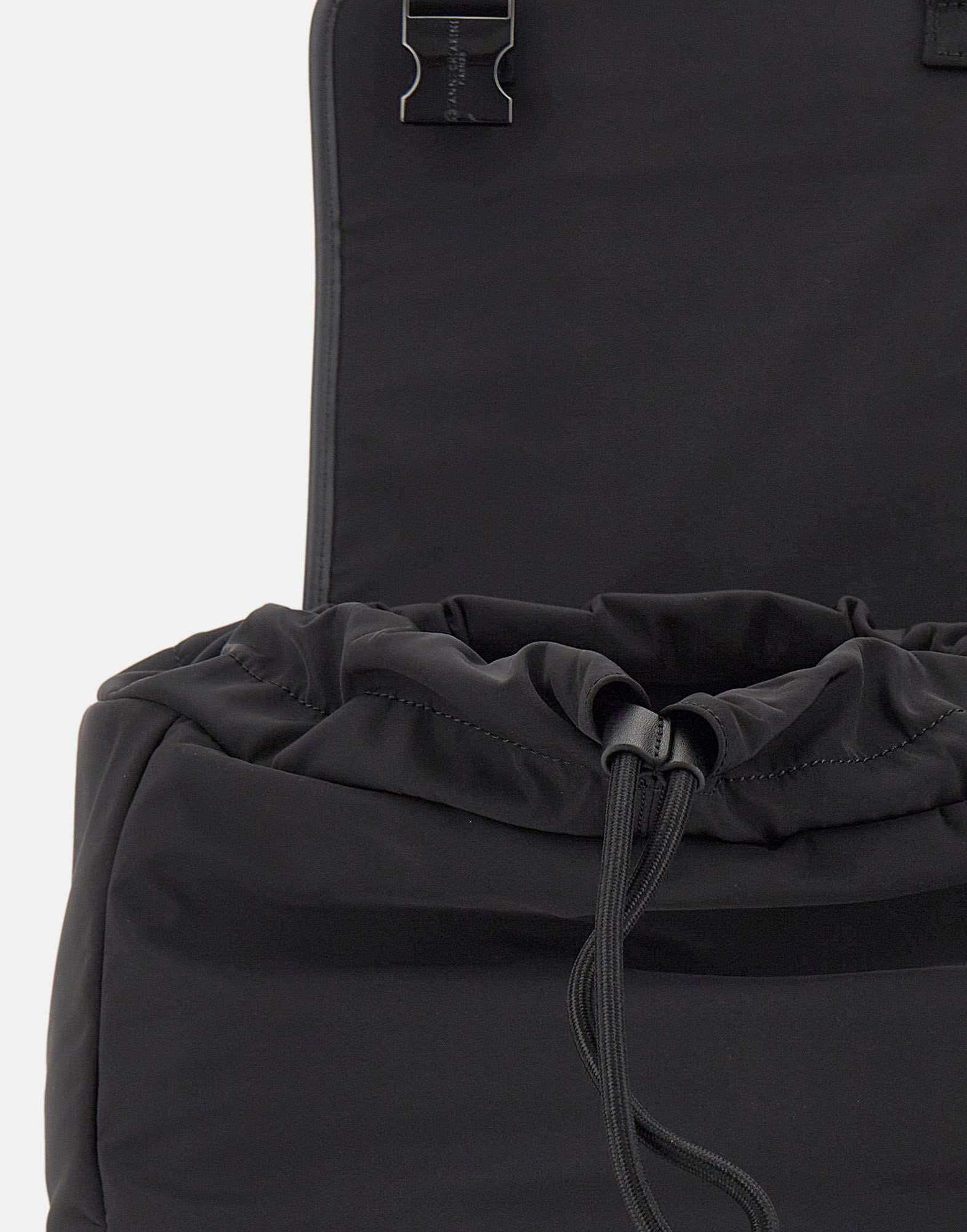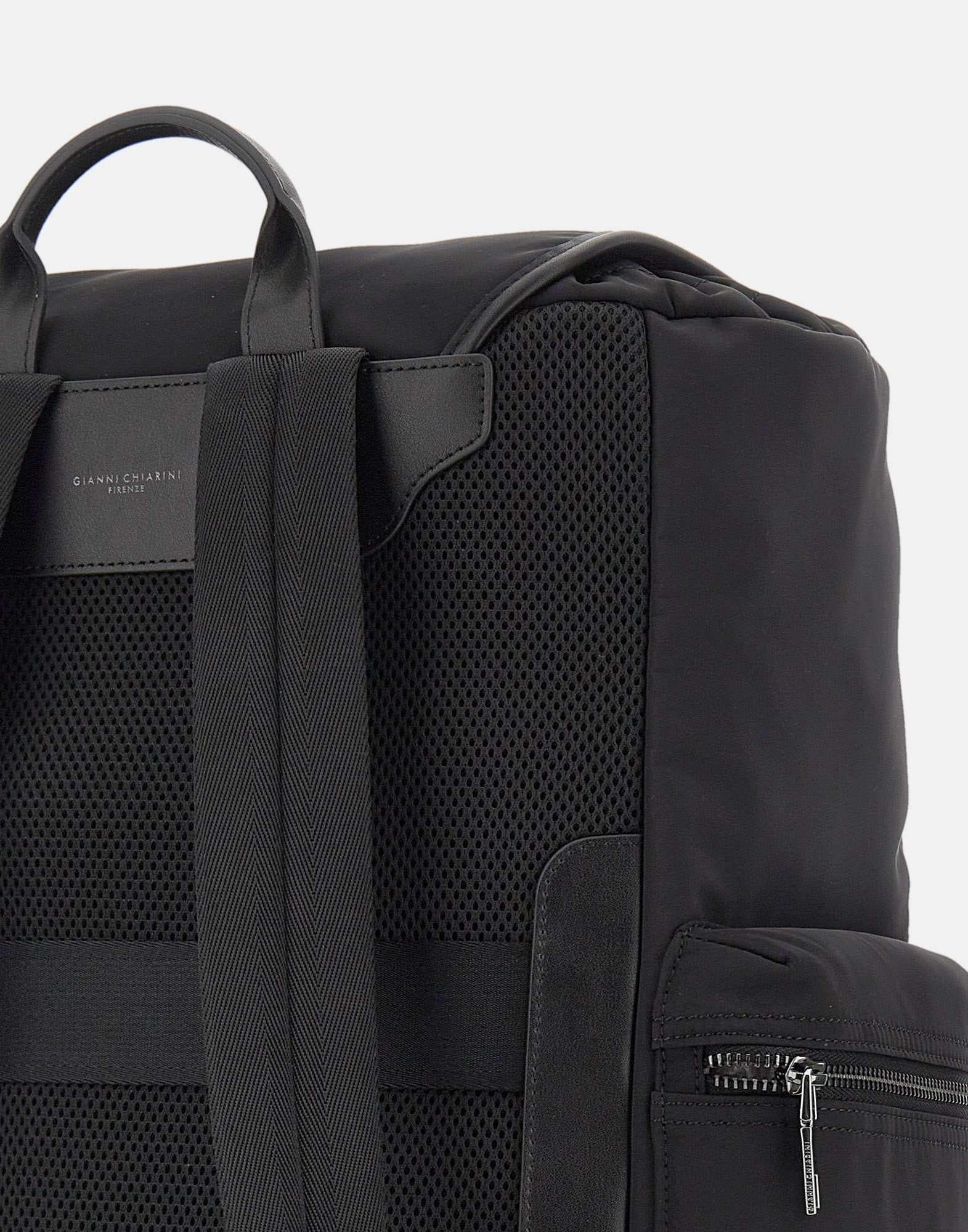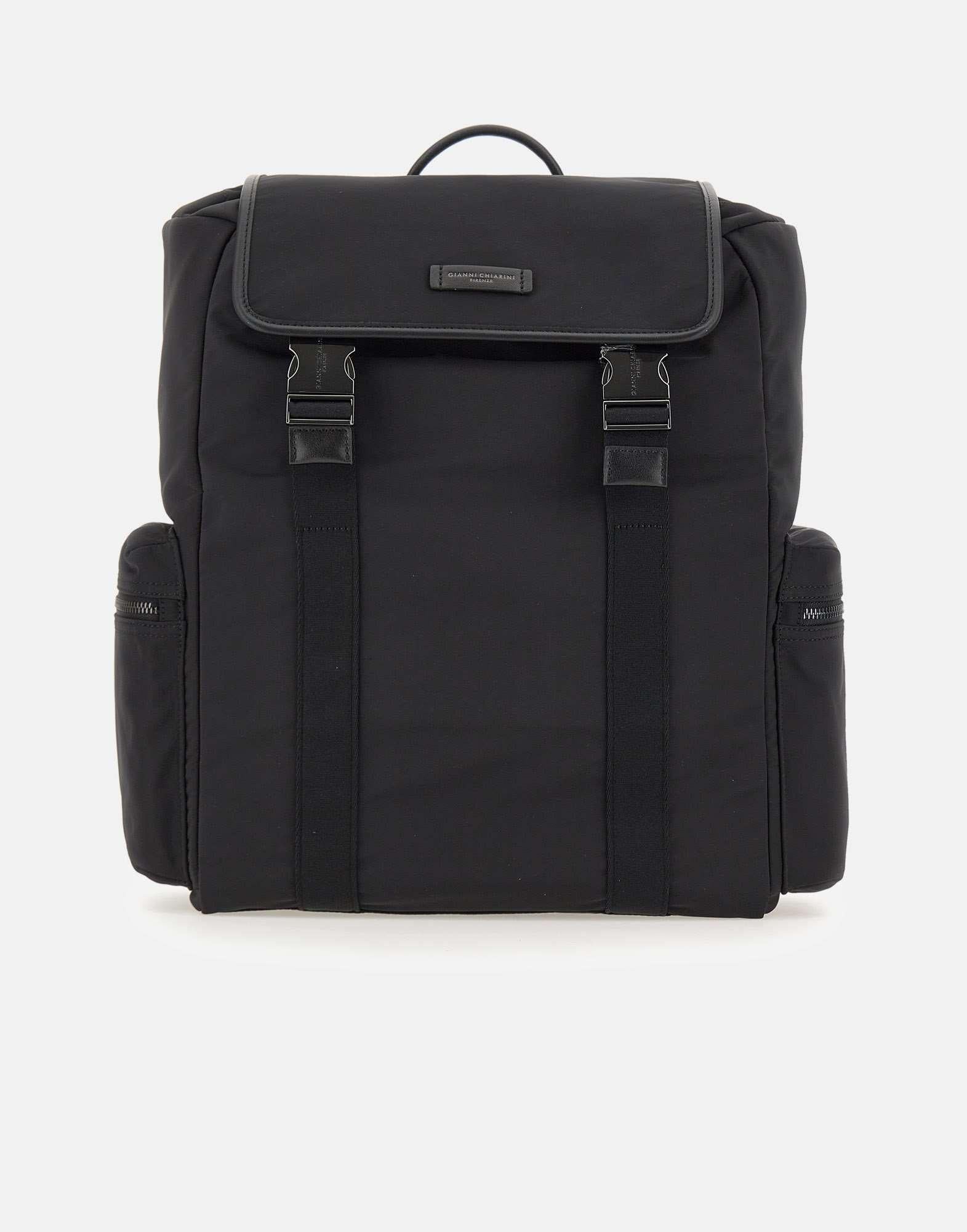 Gianni Chiarini "Oslo" backpack, crafted from black nylon with leather trim, features clean lines and a minimalist design. Featuring a large main compartment with a drawstring closure and double metal snap hooks, it offers functionality and contemporary style.