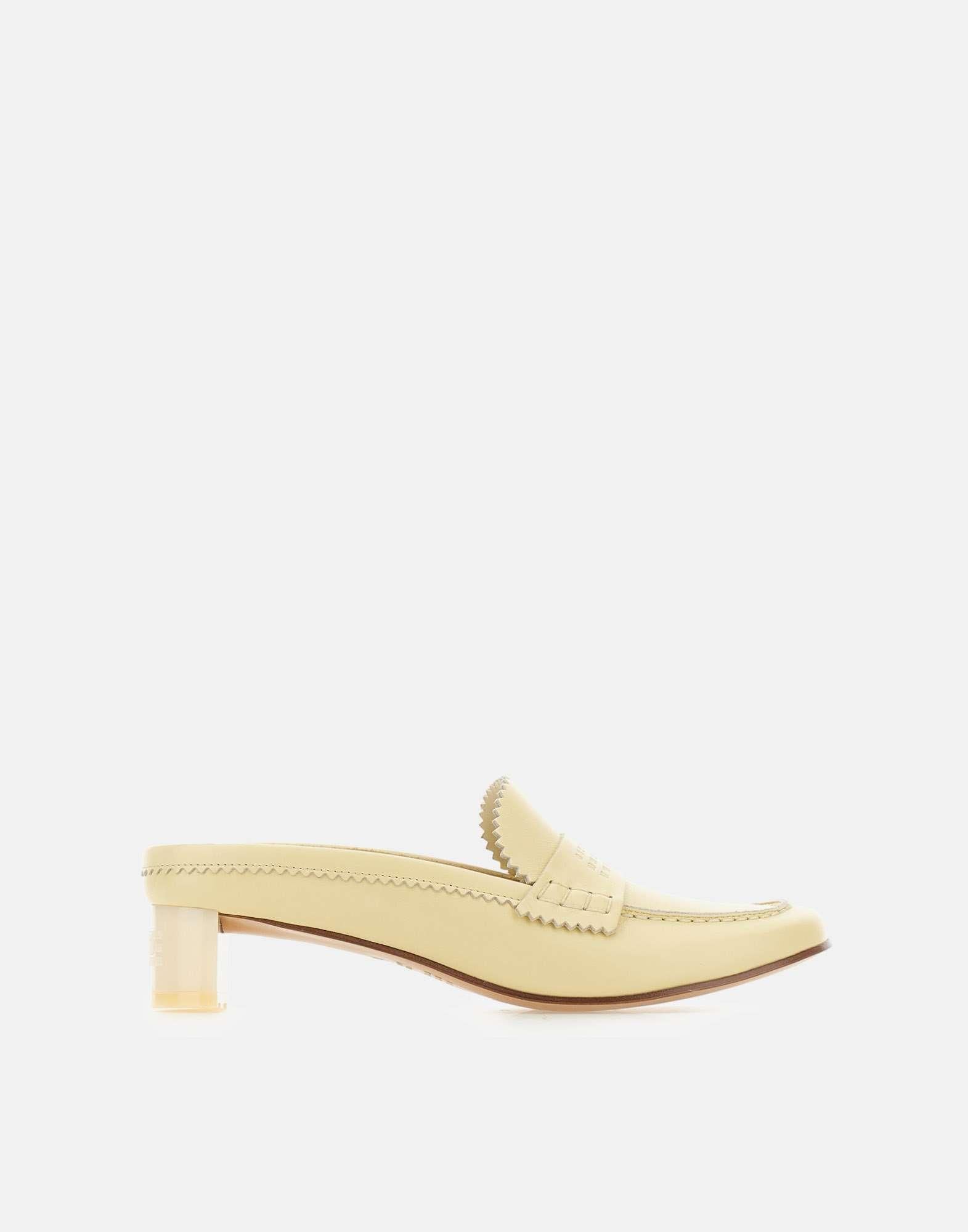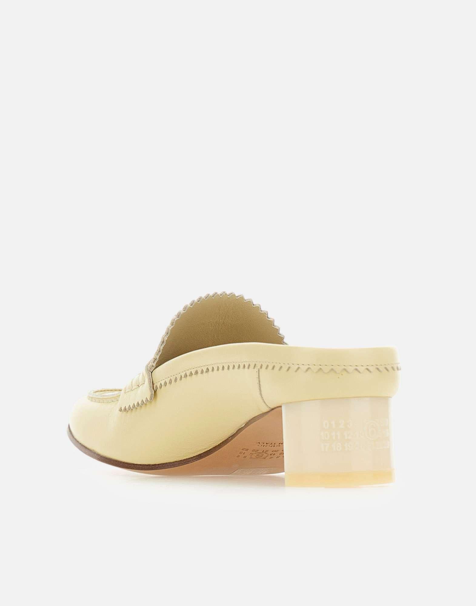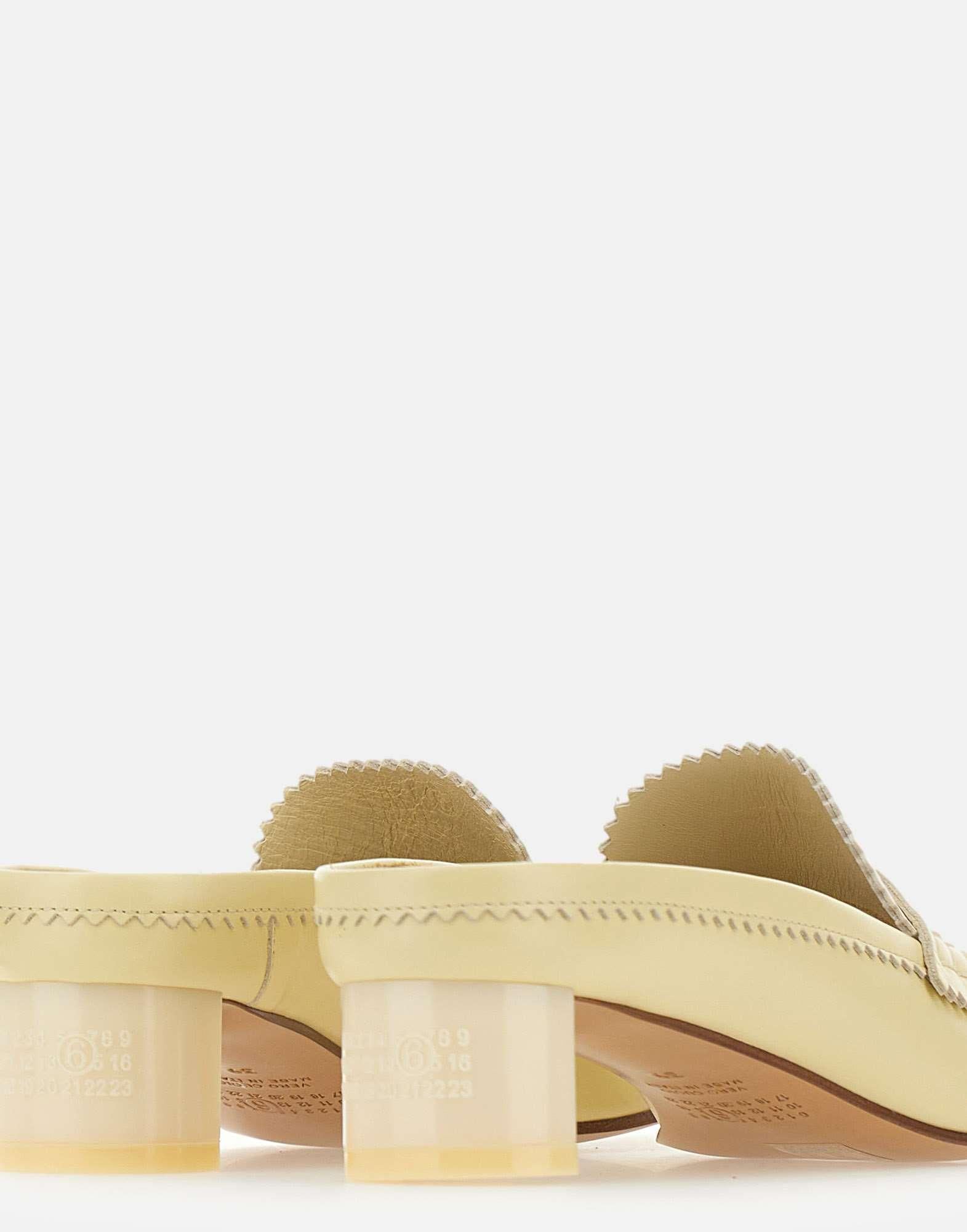 MM6 Maison Margiela women's loafers crafted in pale yellow leather, defined by a sleek silhouette that reinterprets classic elegance through a contemporary lens. The style features a semi-covered heel, a penny strap with embossed numeric logo and serrated edges that add a distinctive touch to the essential design. The 4 cm heel, finished with the numeric logo, completes the shape with a refined and recognisable detail. Comes with a dust bag. Made in Italy.