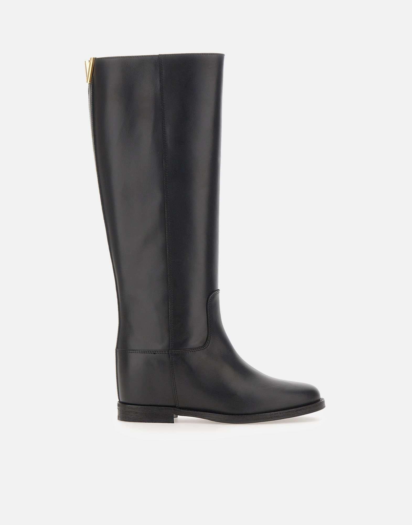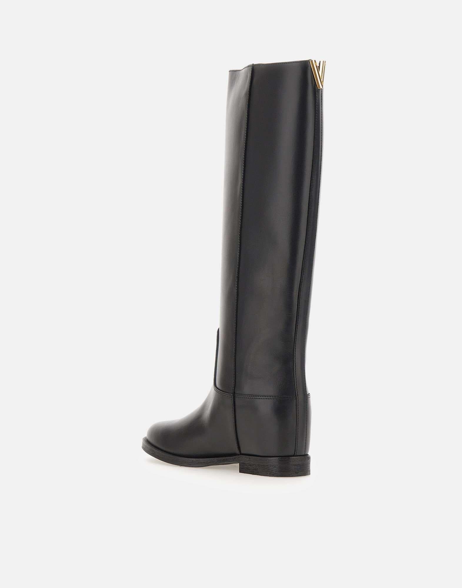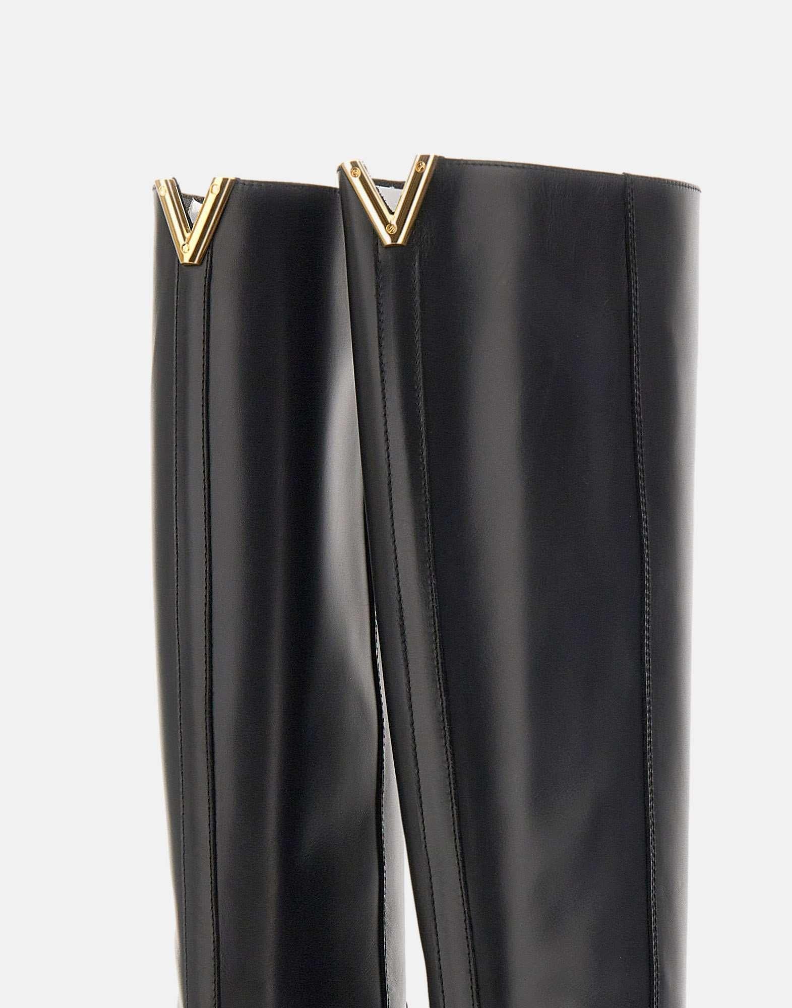 Via Roma 15 "Santa Monica" tube boots, crafted from soft black leather with a gold-tone metal V-shaped decoration on back, brand's iconic symbol. They feature a pointed toe, a full leather lining, and a 4 cm internal wedge for comfort and a natural fit. The shaft measures 44 cm (size 37), while leather and rubber sole ensures stability and durability. Made in Italy. Slightly narrow fit. Cloth case included.
