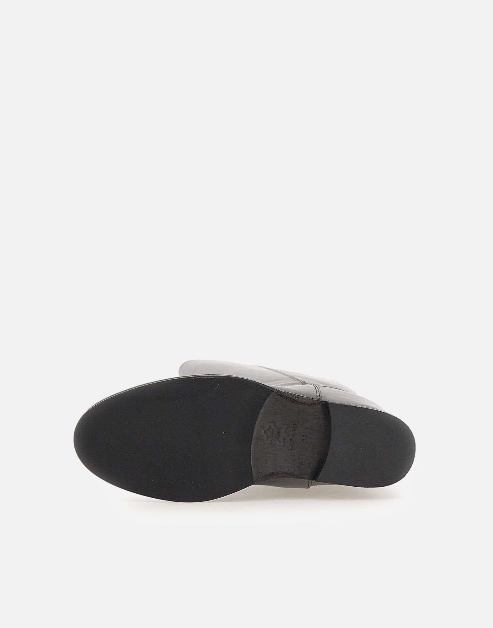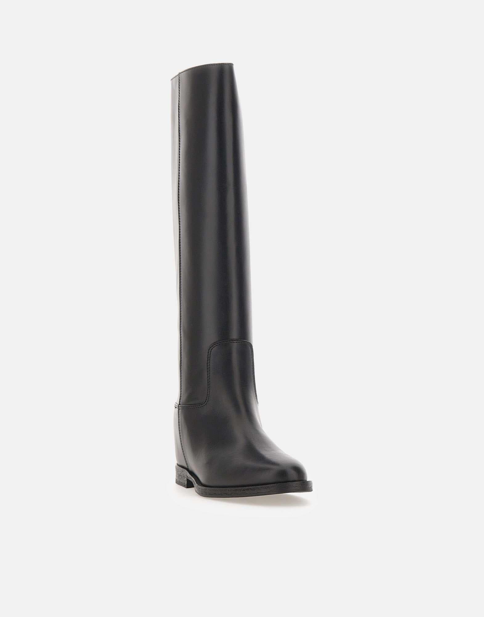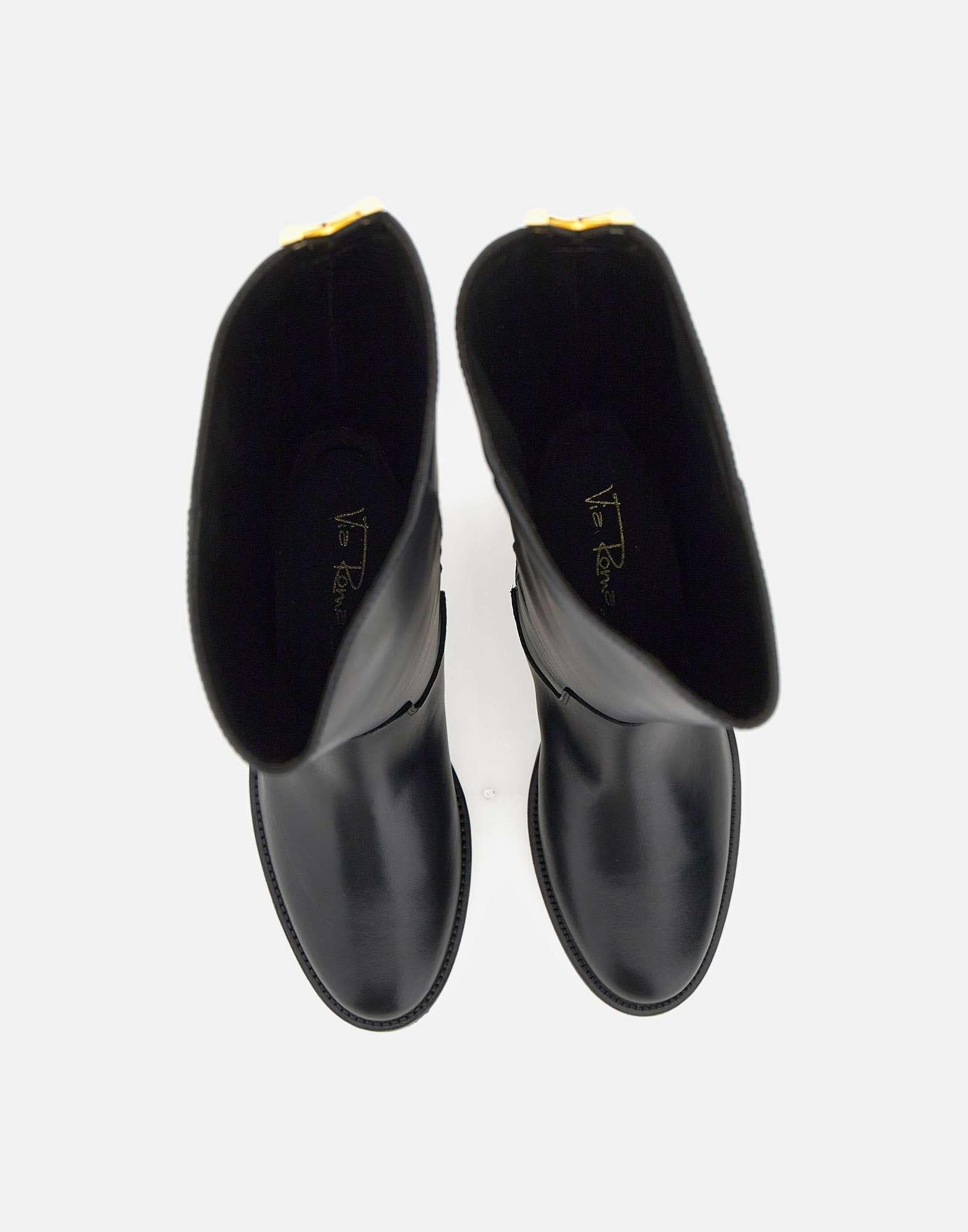 Via Roma 15 "Santa Monica" tube boots, crafted from soft black leather with a gold-tone metal V-shaped decoration on back, brand's iconic symbol. They feature a pointed toe, a full leather lining, and a 4 cm internal wedge for comfort and a natural fit. The shaft measures 44 cm (size 37), while leather and rubber sole ensures stability and durability. Made in Italy. Slightly narrow fit. Cloth case included.