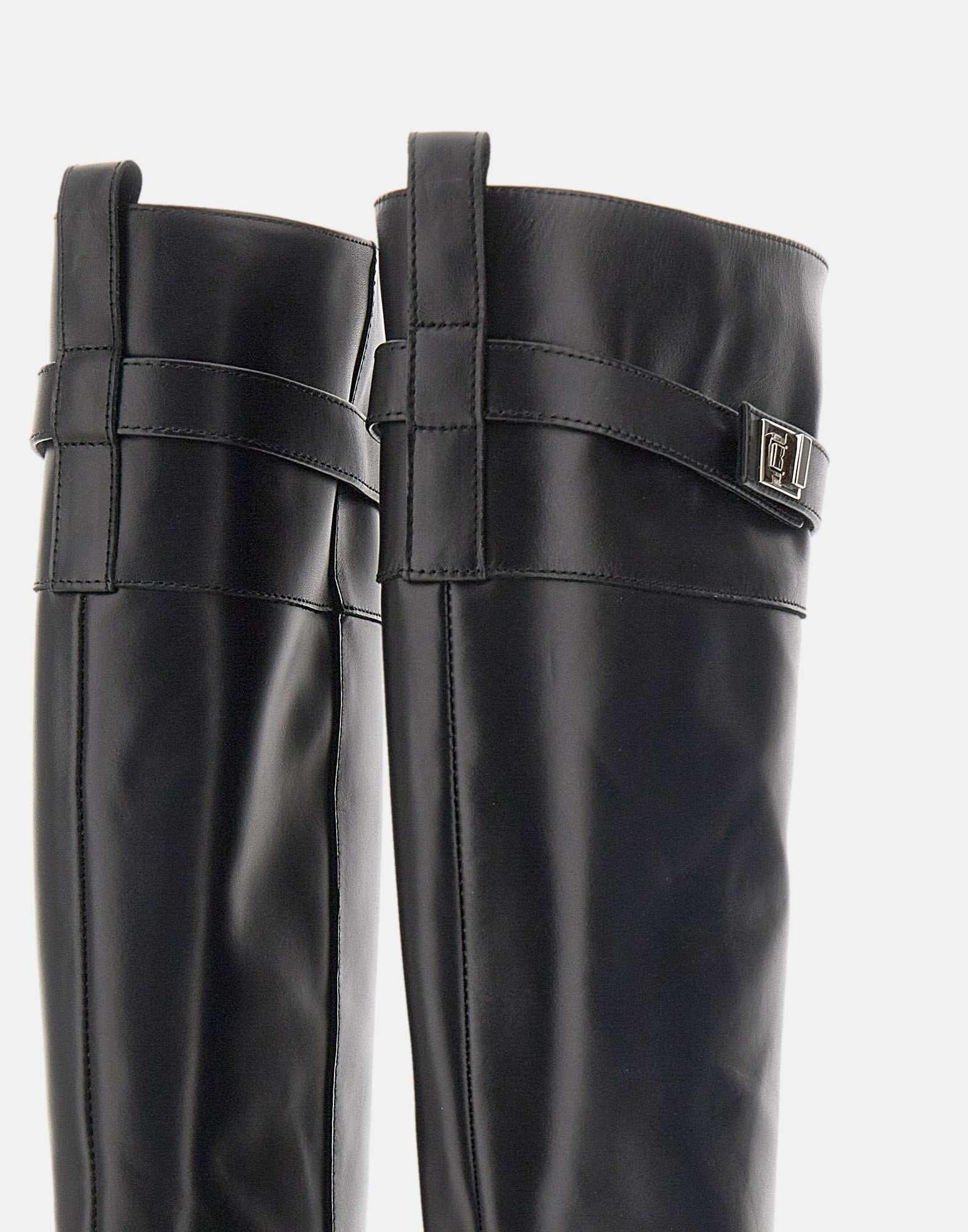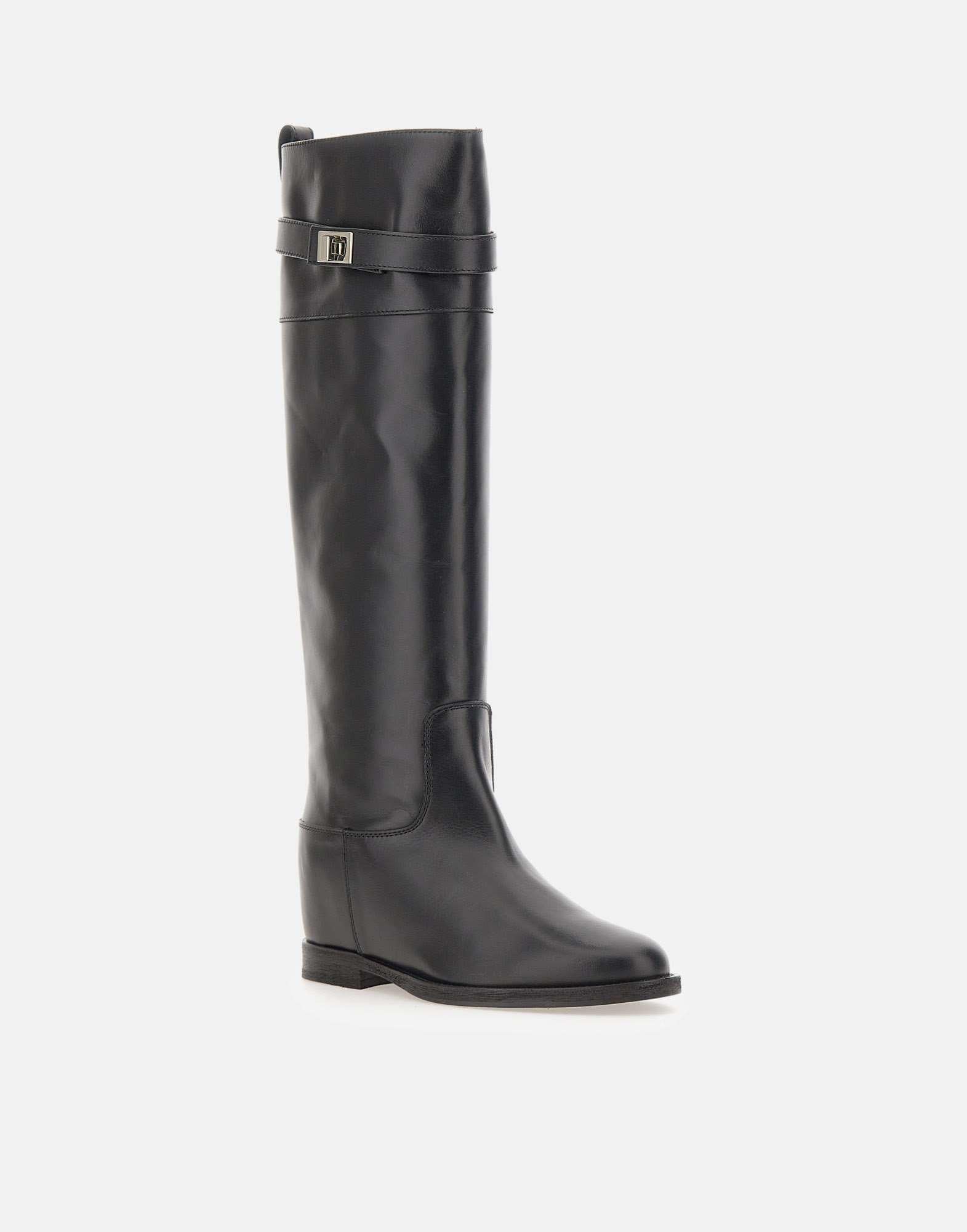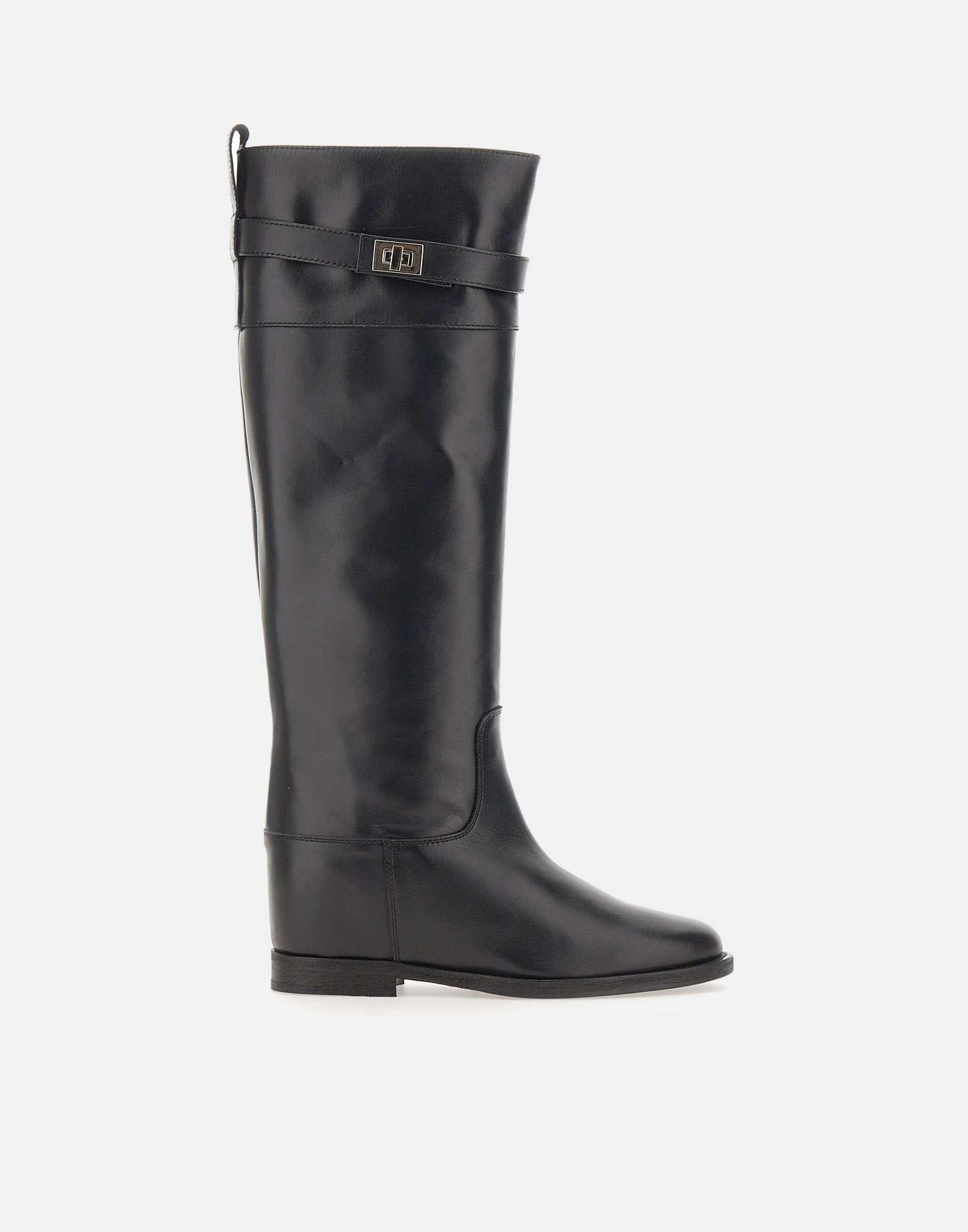 Via Roma 15 "Santa Monica" boots crafted from black leather with a tubular construction and bold details. The design is embellished with a shiny silver padlock and a rear pull tab for easy on and off. They feature a 3.5 cm internal wedge, a 2 cm external heel, and a rubber and leather sole for long-lasting comfort. Shaft height: 44 cm (size 38). Made in Italy. Slightly narrow fit. Fabric case included