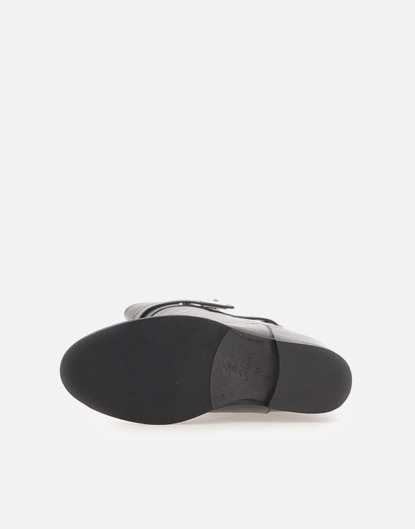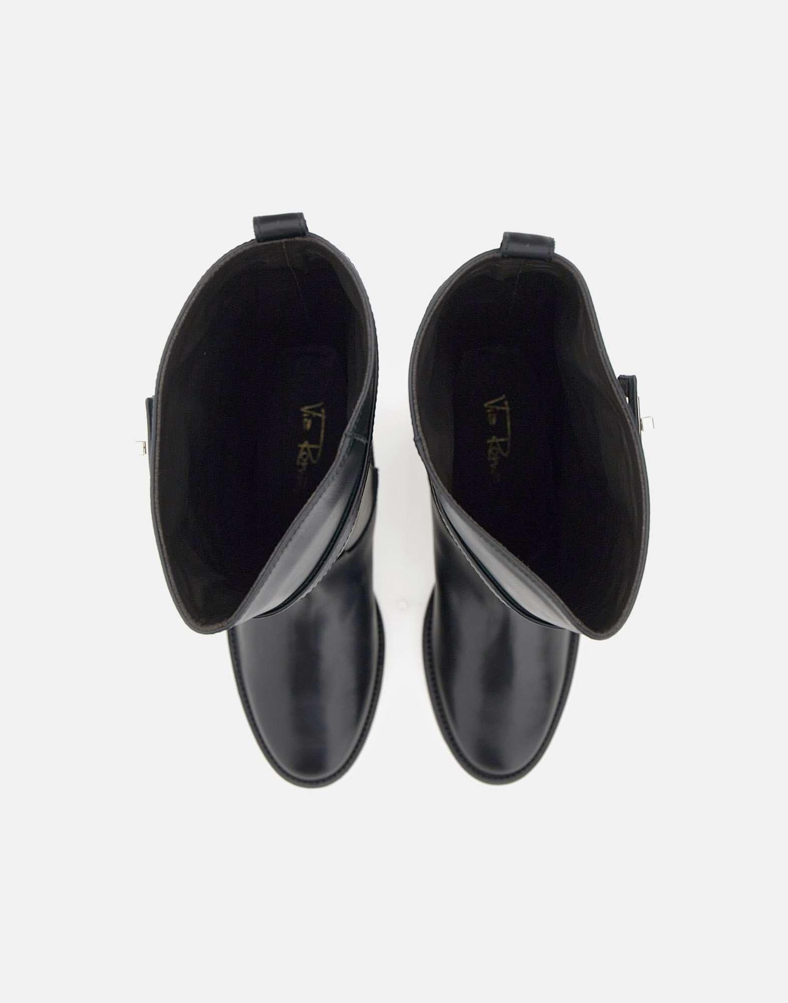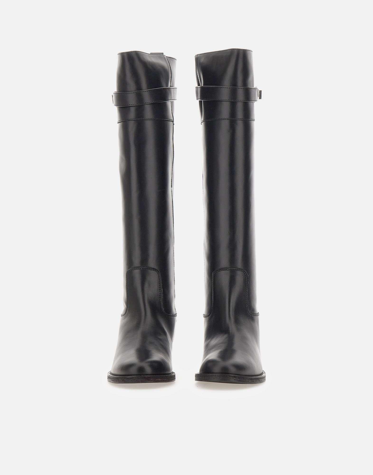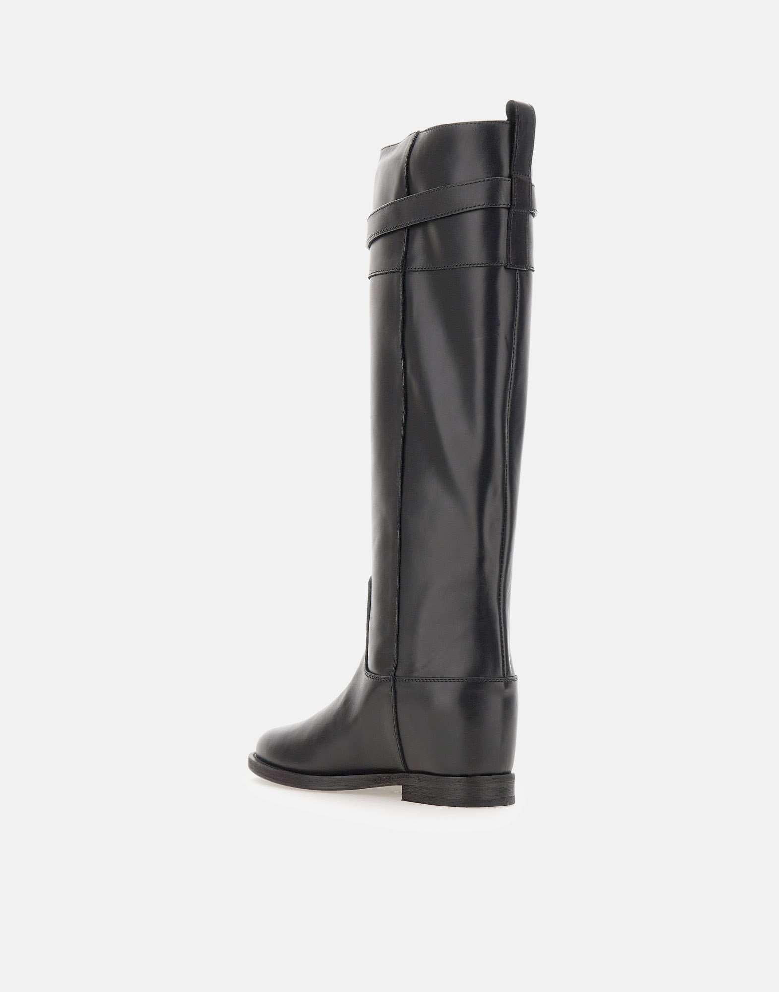Via Roma 15 "Santa Monica" boots crafted from black leather with a tubular construction and bold details. The design is embellished with a shiny silver padlock and a rear pull tab for easy on and off. They feature a 3.5 cm internal wedge, a 2 cm external heel, and a rubber and leather sole for long-lasting comfort. Shaft height: 44 cm (size 38). Made in Italy. Slightly narrow fit. Fabric case included