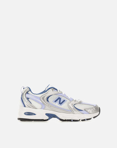 New Balance "530" sneakers featuring a white mesh upper with silver and light blue leather inserts. The design stands out for its wide curves and angles, creating a distinctive high-tech aesthetic. The ABZORB midsole provides excellent impact absorption through a balanced combination of cushioning and compression resistance, ensuring lasting comfort. Finished with the iconic lateral N logo, white laces, branded tongue, rear pull tab, and a 4 cm rubber sole. The fit runs slightly small; sizing up by half a size is recommended. Refer to the UNISEX USA footwear size conversion chart.