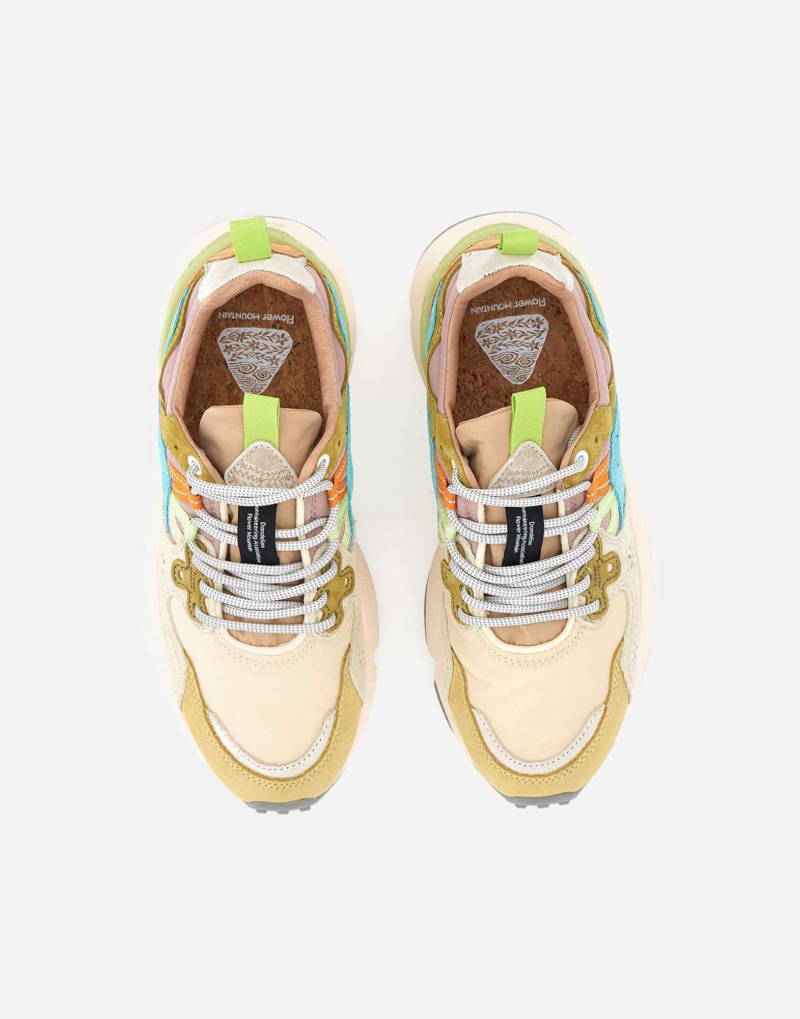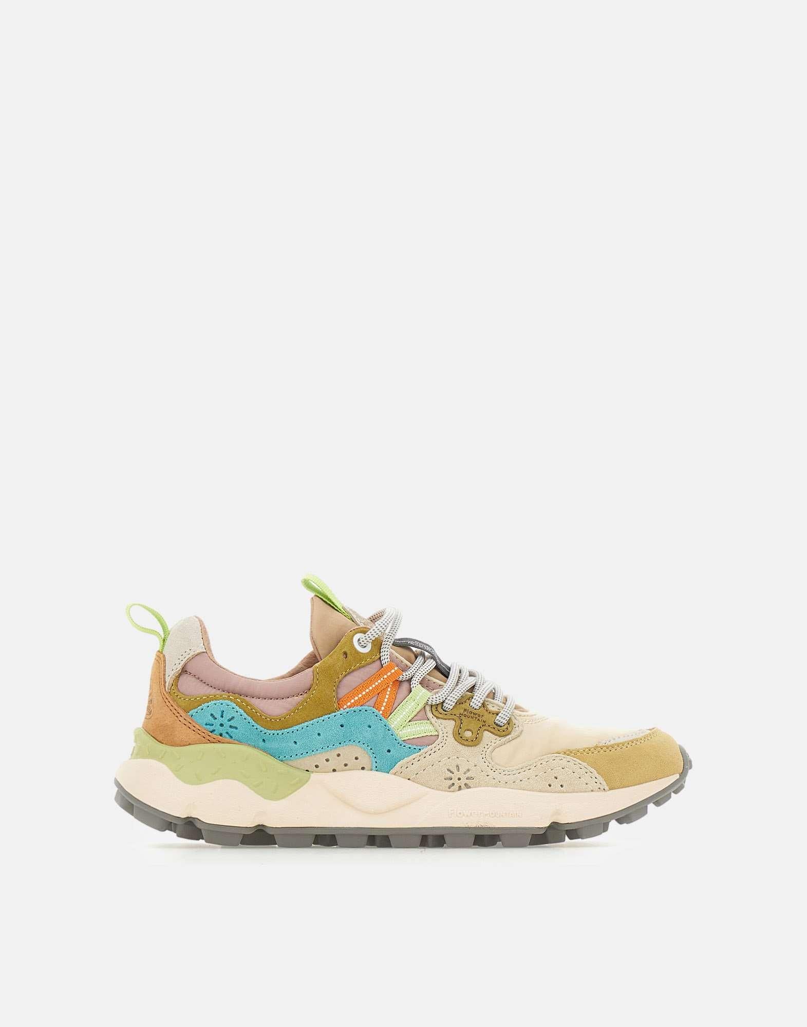 Flower Mountain "Yamano 3 Woman" women's sneakers featuring a pink and cream technical fabric upper with multicolor suede inserts, designed to combine dynamic style with everyday comfort. The style features trekking laces, a custom-shaped eyelet, logo on the outer side and pull tabs on the tongue and heel, details that define its technical and contemporary identity. The leather lining and natural antibacterial cork insole ensure lasting comfort, while the ultra-light 4 cm rubber sole with sculpted lines and serrated tread completes the design with stability and character.