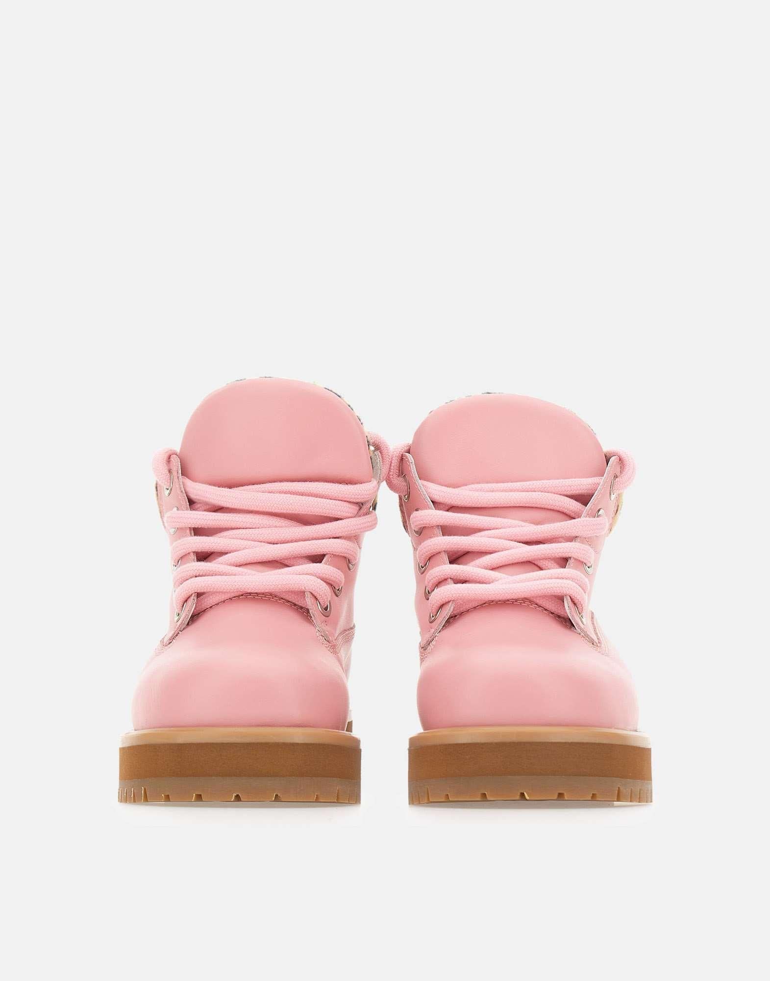 PDF "Strada Low Cheetah" boots crafted in pink leather, defined by bold details that enhance their contemporary aesthetic. The style features leopard pony hair on the collar and inner tongue, an internal sock construction, pink tubular laces with an additional white pair included, a bandage patch on the inner tongue and an embroidered logo on the back. The 5 cm lug rubber sole completes the design with a strong and structured finish. Luxury streetwear boots with a large fit; sizing down is recommended.