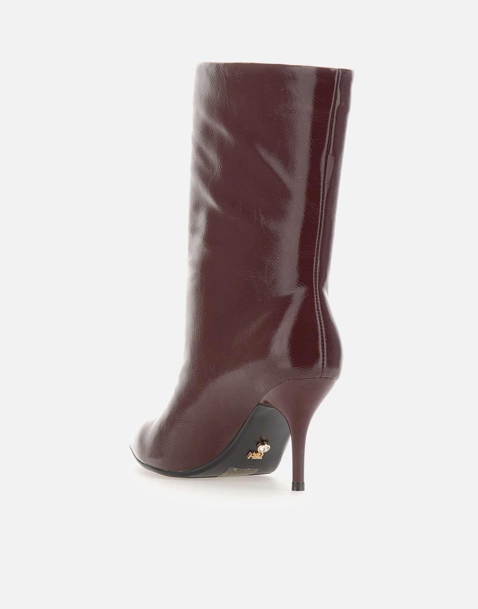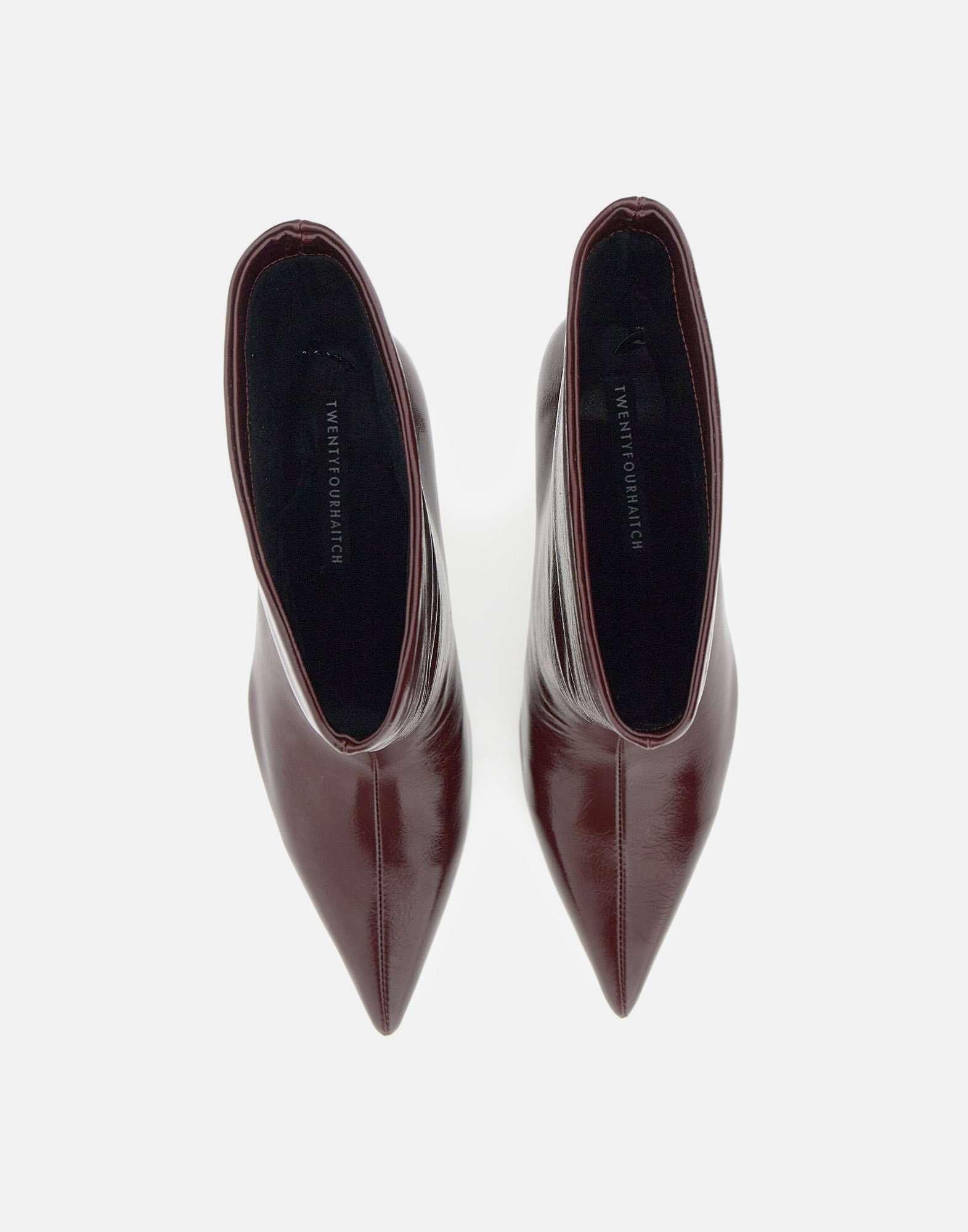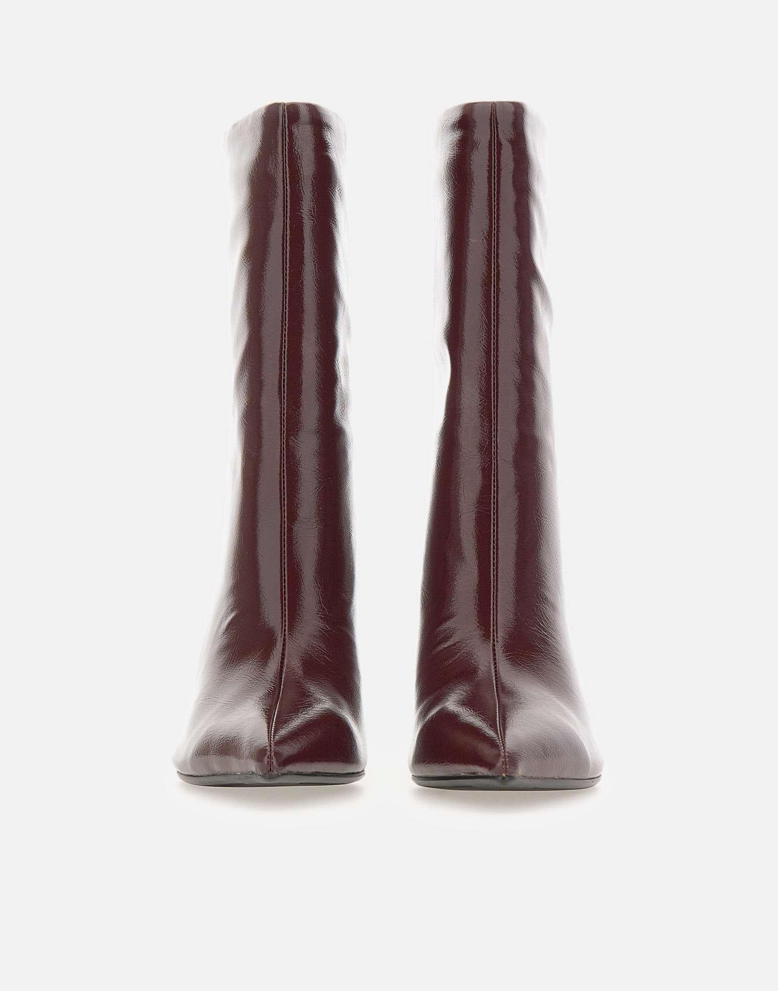 Twentyfourhaitch "Unuk" ankle boots in plum faux leather with a wrinkled patent leather effect, featuring a sophisticated and modern design. They feature a pointed toe, an 8 cm heel, and a mini gold metal logo on sole. The fit is slightly small; we recommend purchasing one size up for optimal comfort.