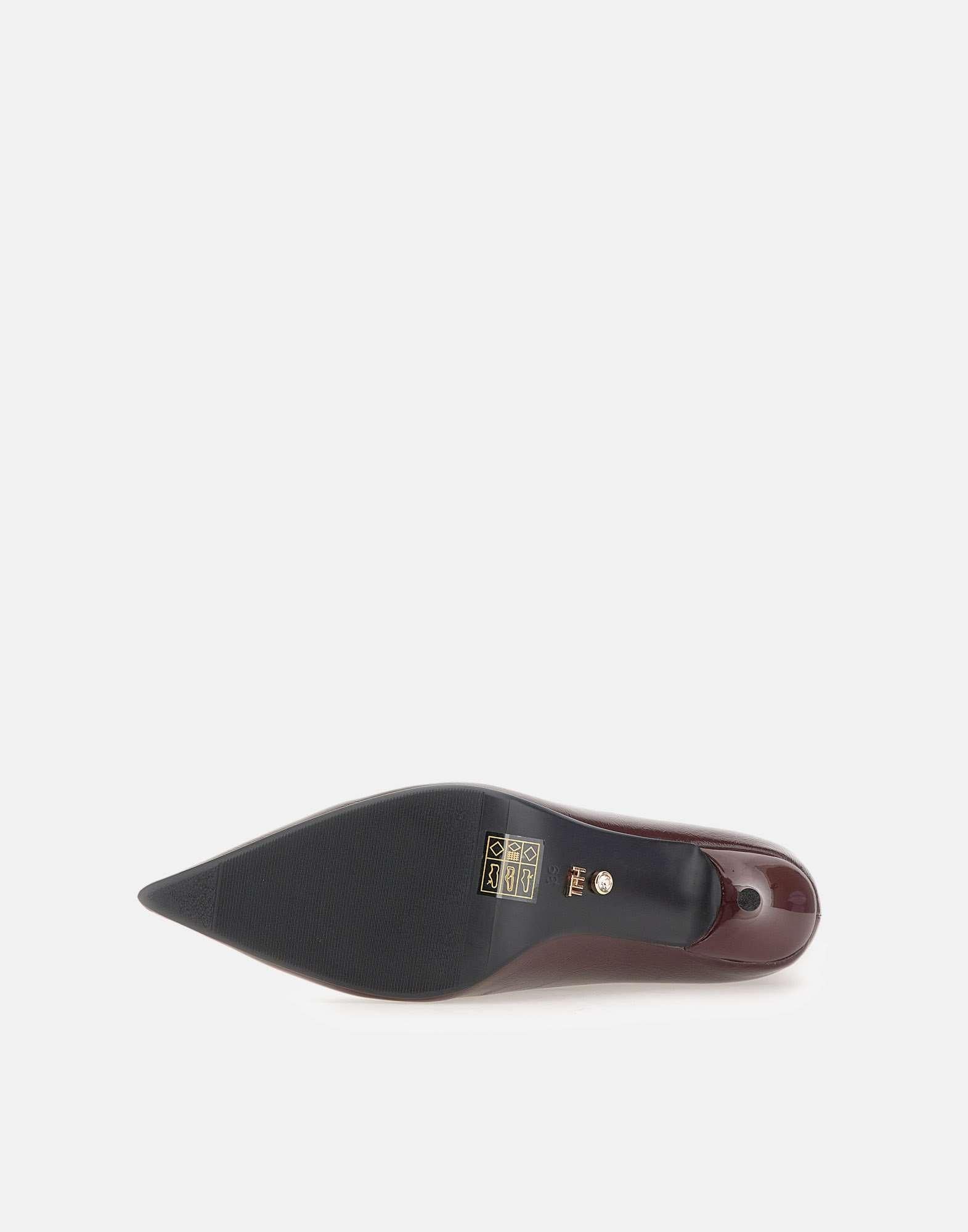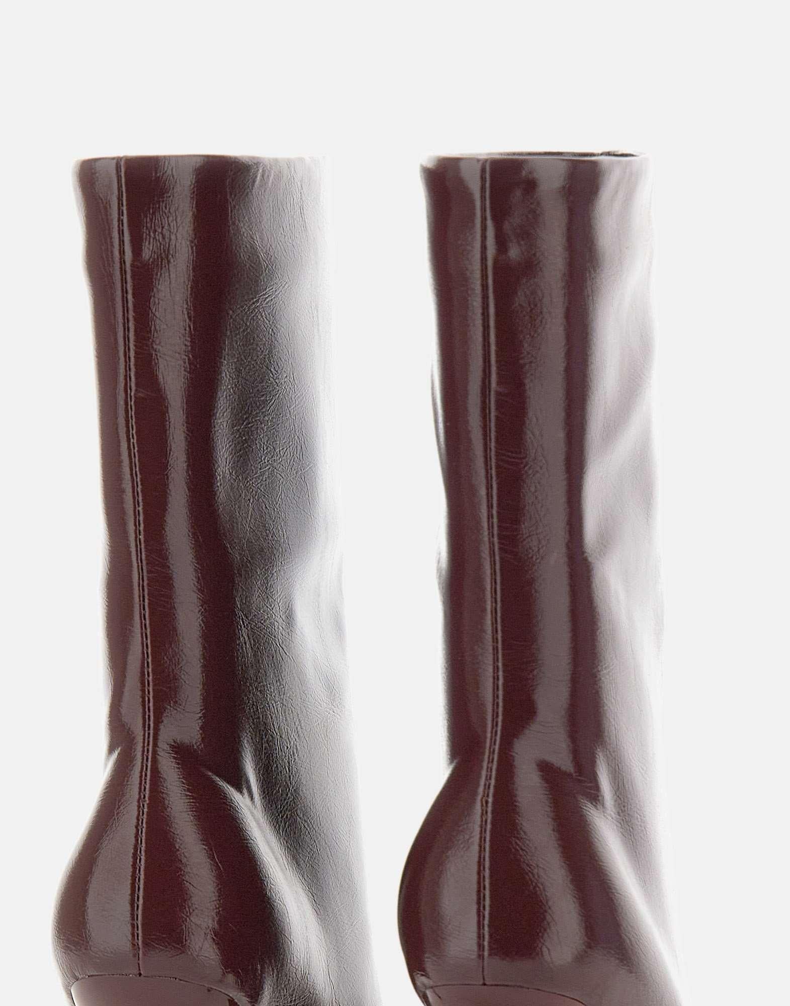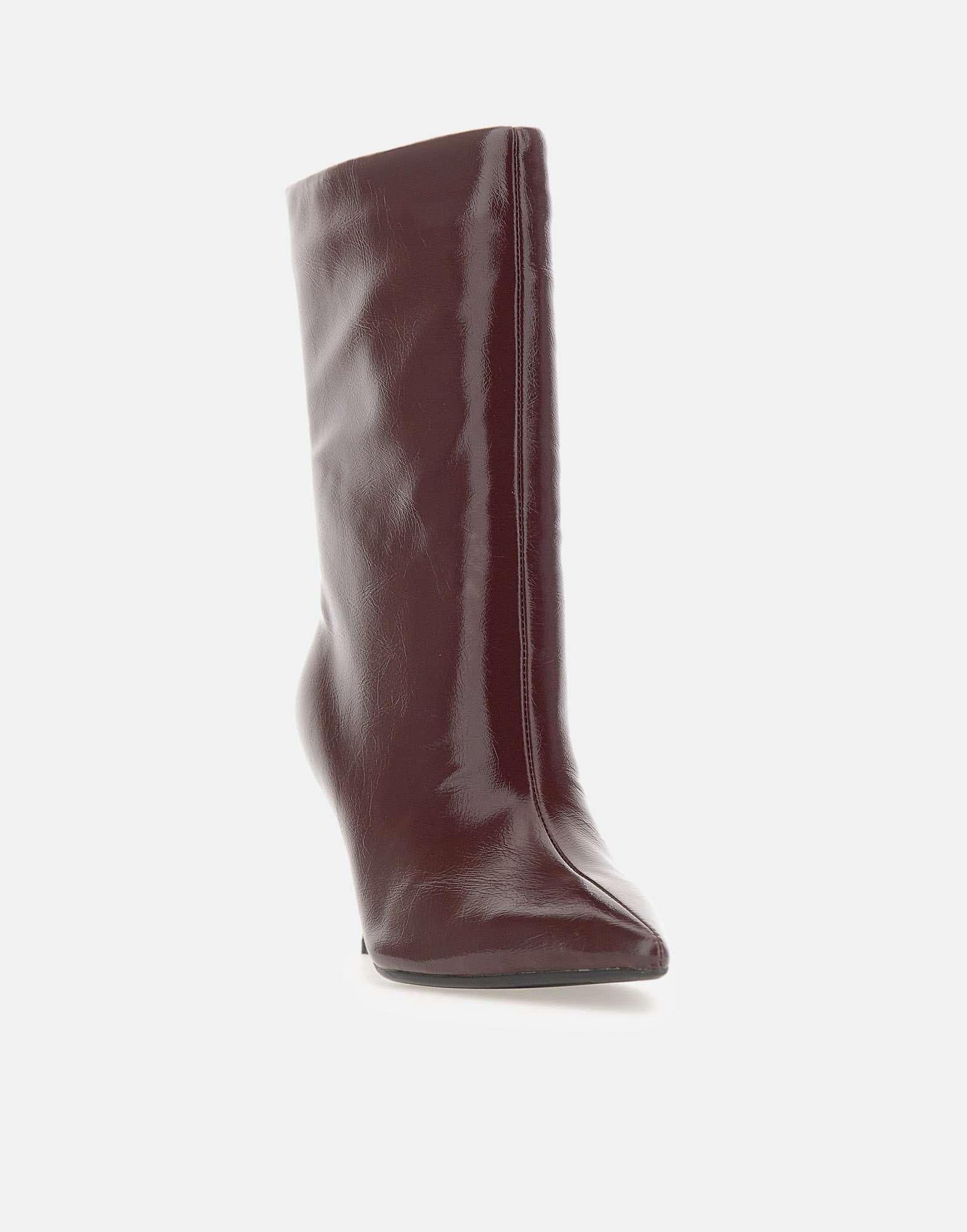 Twentyfourhaitch "Unuk" ankle boots in plum faux leather with a wrinkled patent leather effect, featuring a sophisticated and modern design. They feature a pointed toe, an 8 cm heel, and a mini gold metal logo on sole. The fit is slightly small; we recommend purchasing one size up for optimal comfort.
