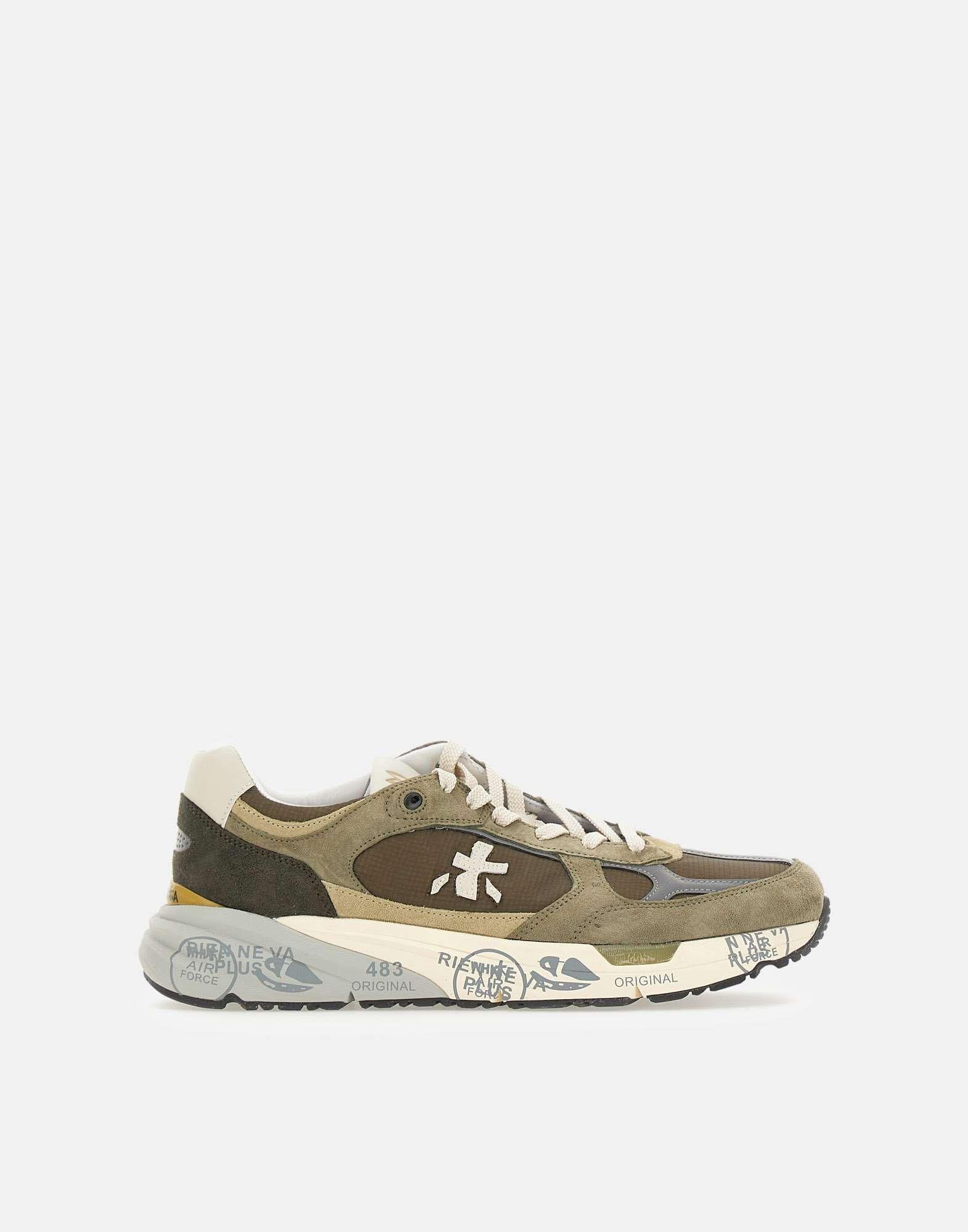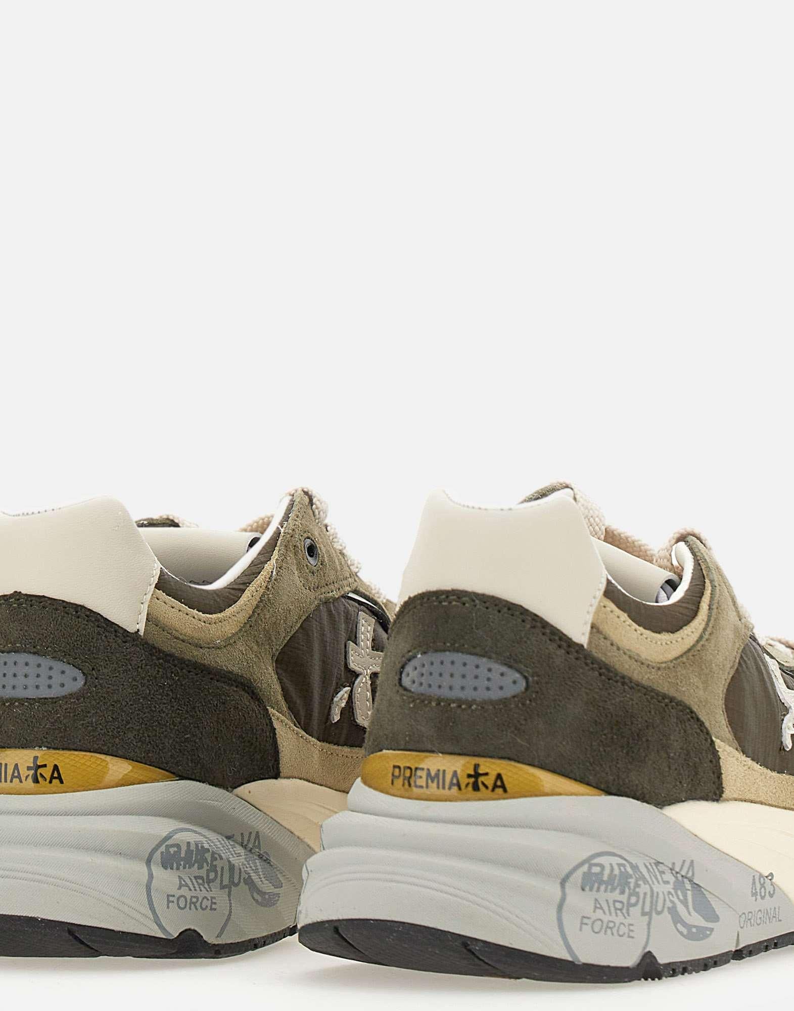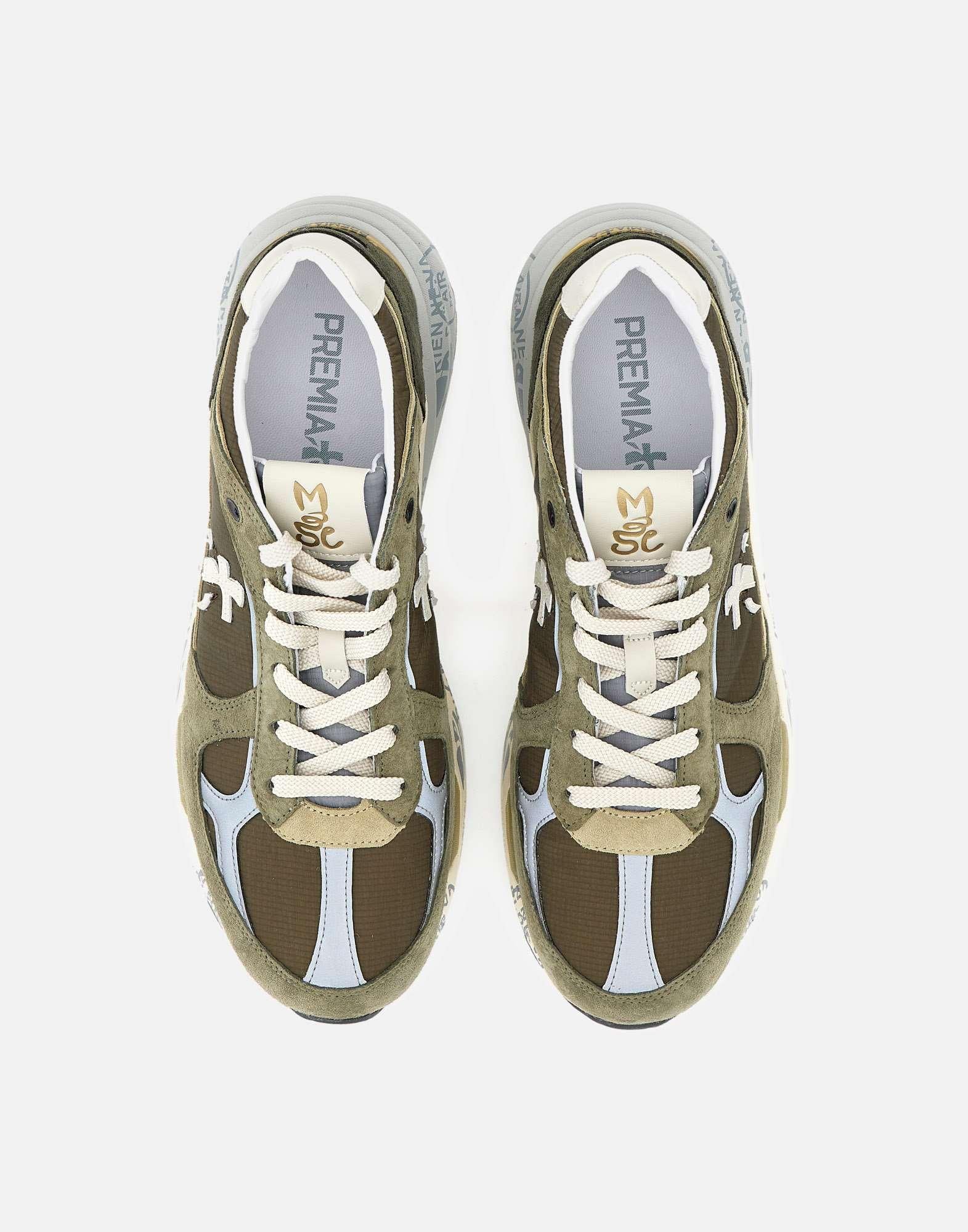 Premiata "Mase8022" men's sneakers inspired by a nineties mood, combining a modern silhouette with premium materials and contrast details for a contemporary casual style. Crafted in brown nylon and suede in military green and brown tones, they feature a contrasting heel tab and flat contrasting laces that enhance the design. The leather lining ensures comfort, while the rubber sole with Premiata screen print, 4 cm high, finishes the style with a distinctive brand signature. True to Premiata design codes, they show the side logo and the MASE lettering on the tongue label, with vivid treatments and contrast accents that highlight the identity. Regular fit.