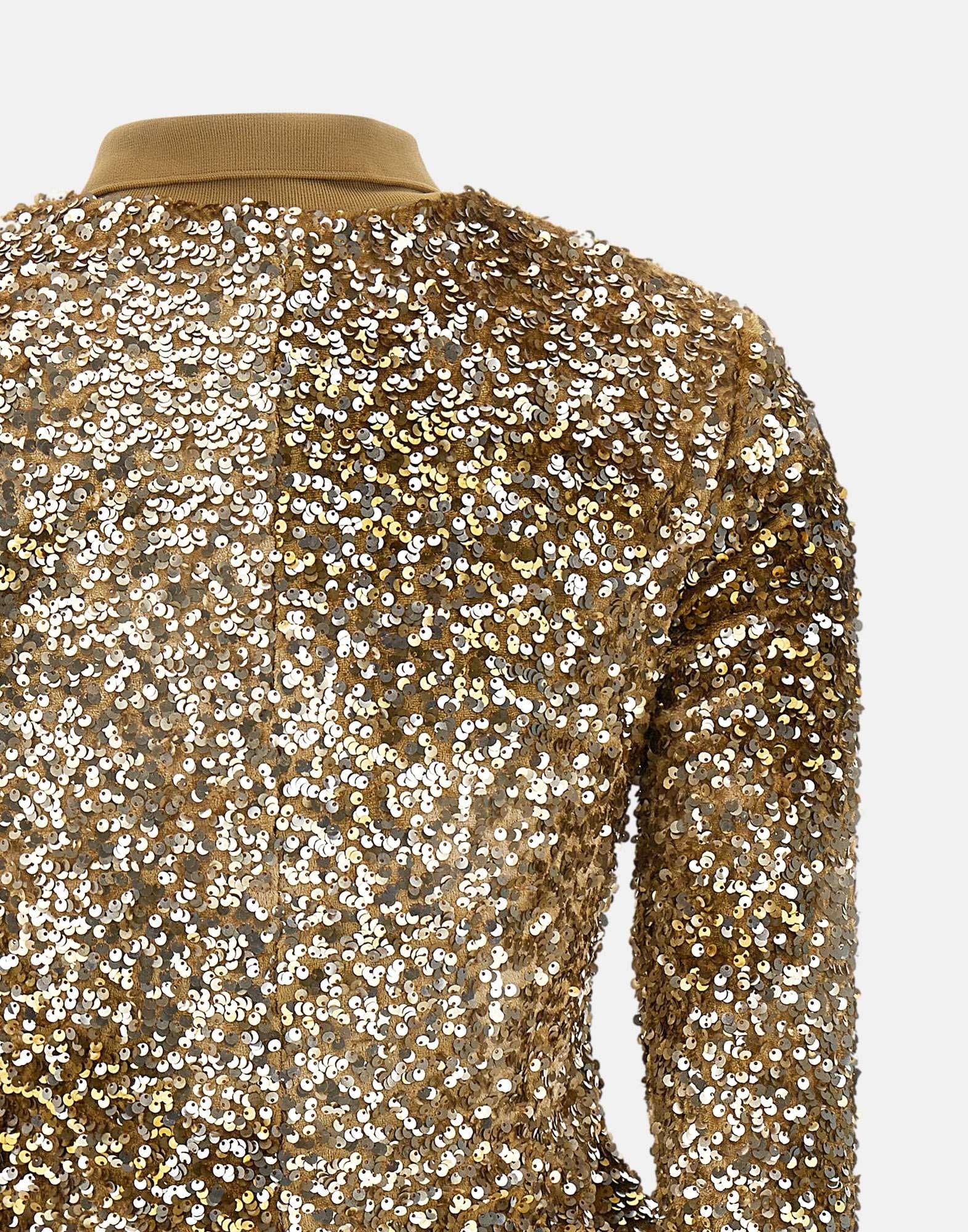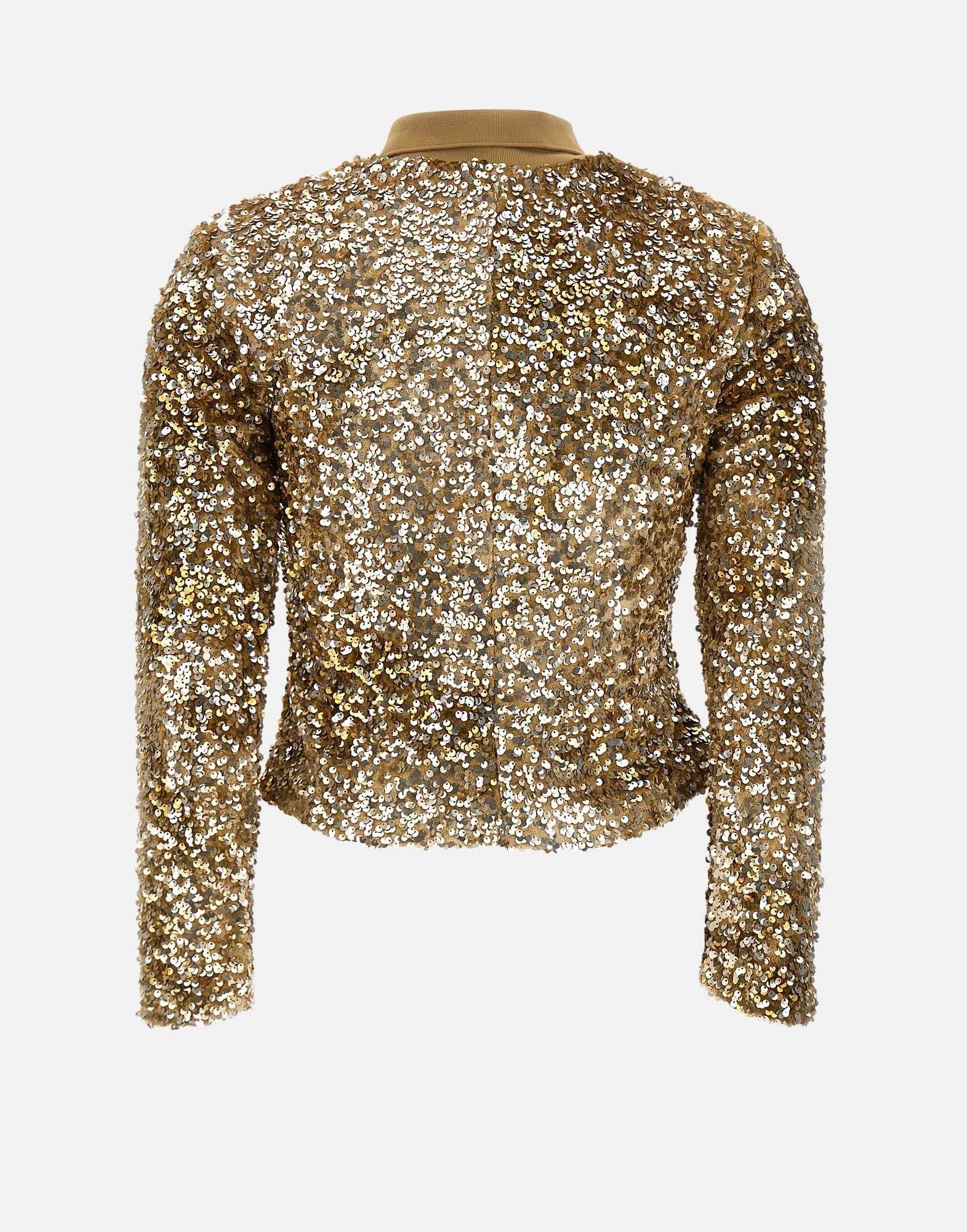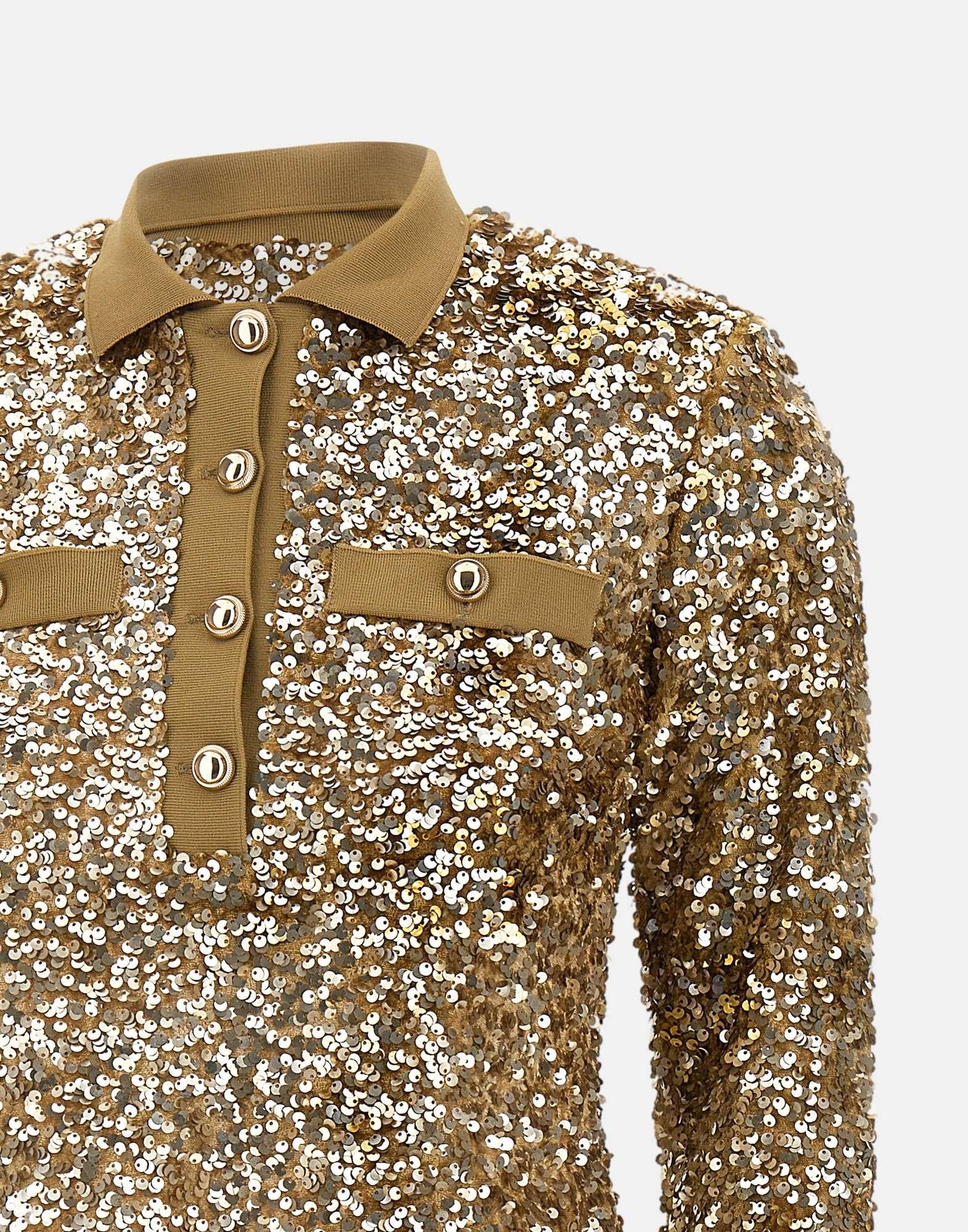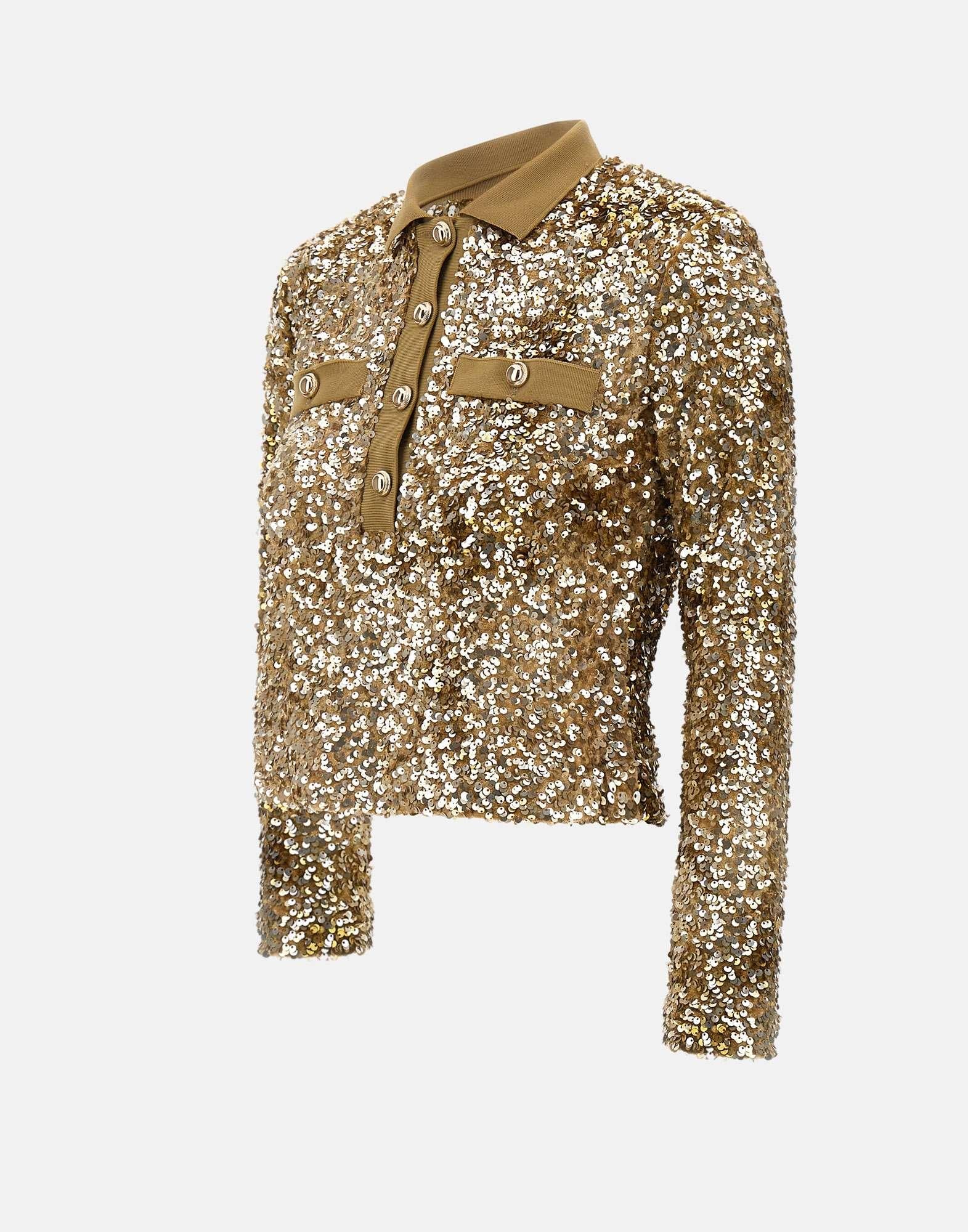 Marella "Betta" crepe blouse, embellished with a cascade of gold sequins for a luminous and sophisticated effect. Inspired by classic polo shirt, this style features a classic collar, long sleeves, patch pockets on chest, and a jeweled button closure. Regular fit, ideal for evening looks or special events.