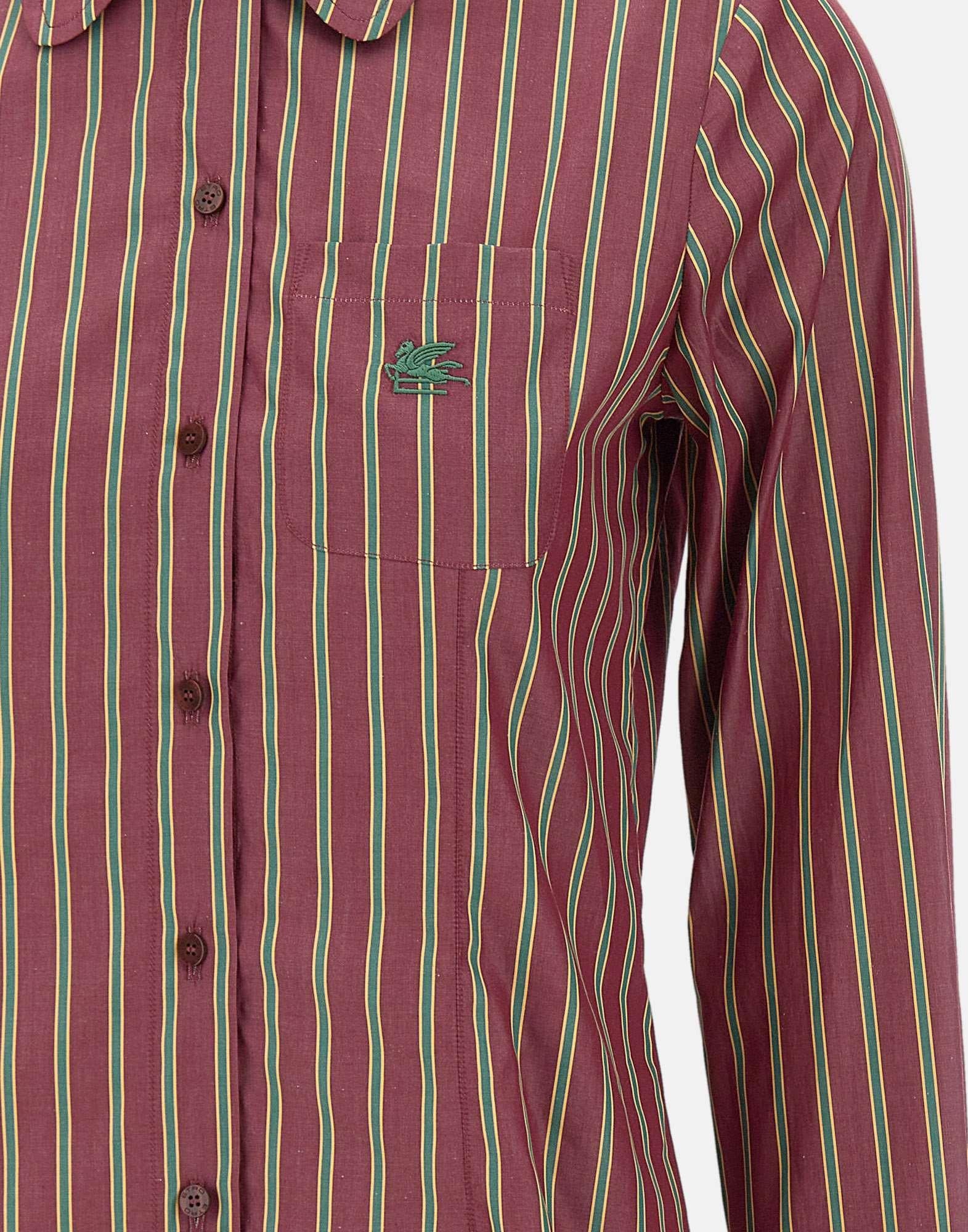 Etro cotton poplin shirt with a vertical striped pattern in shades of green and yellow on a purple background, a refined and distinctive color combination. The style features long sleeves, a classic collar, a tone-on-tone mother-of-pearl button closure, and buttoned cuffs. The chest pocket with embroidered Pegasus, the brand's iconic symbol, adds an exclusive detail to the design. Made in Italy, slim fit