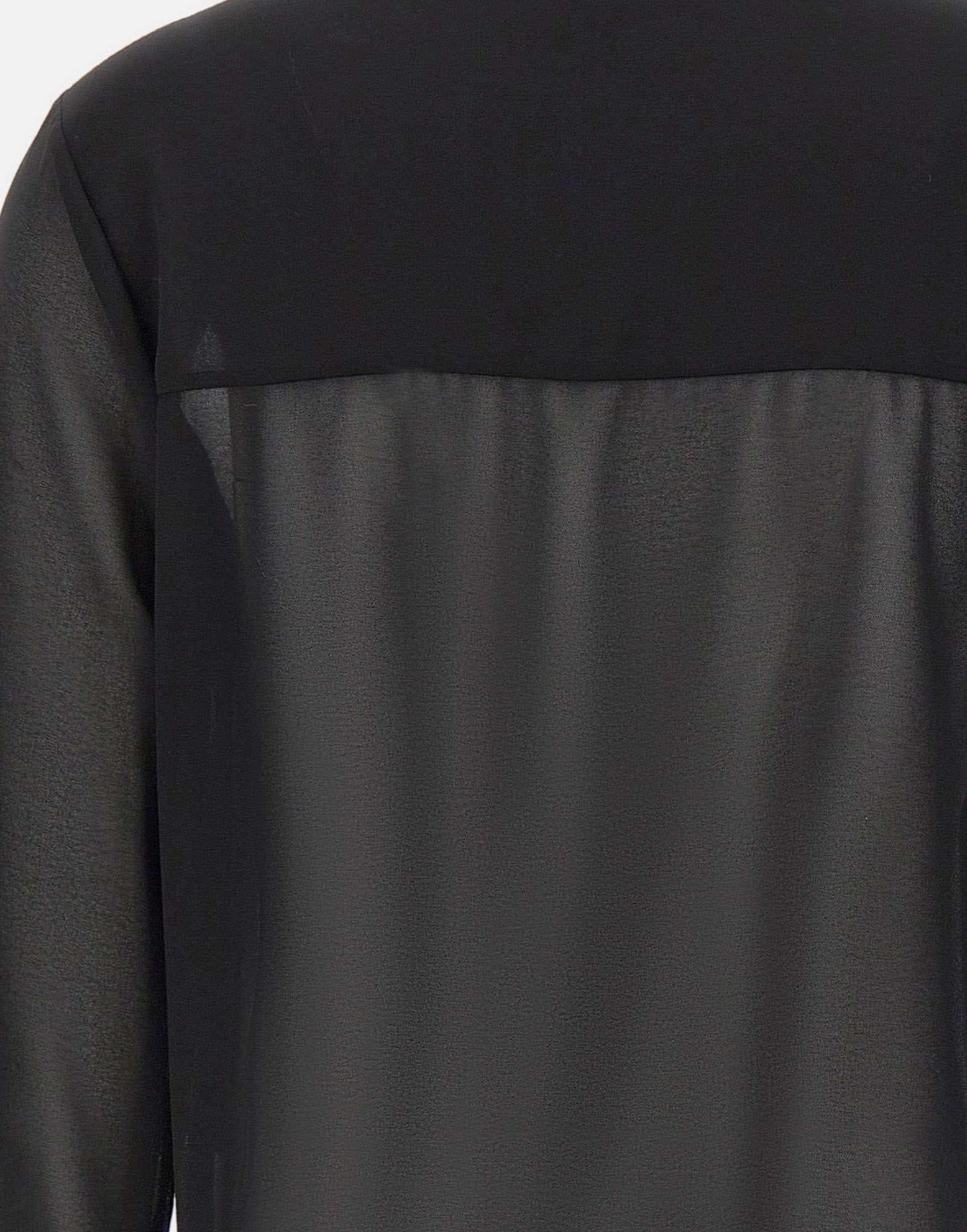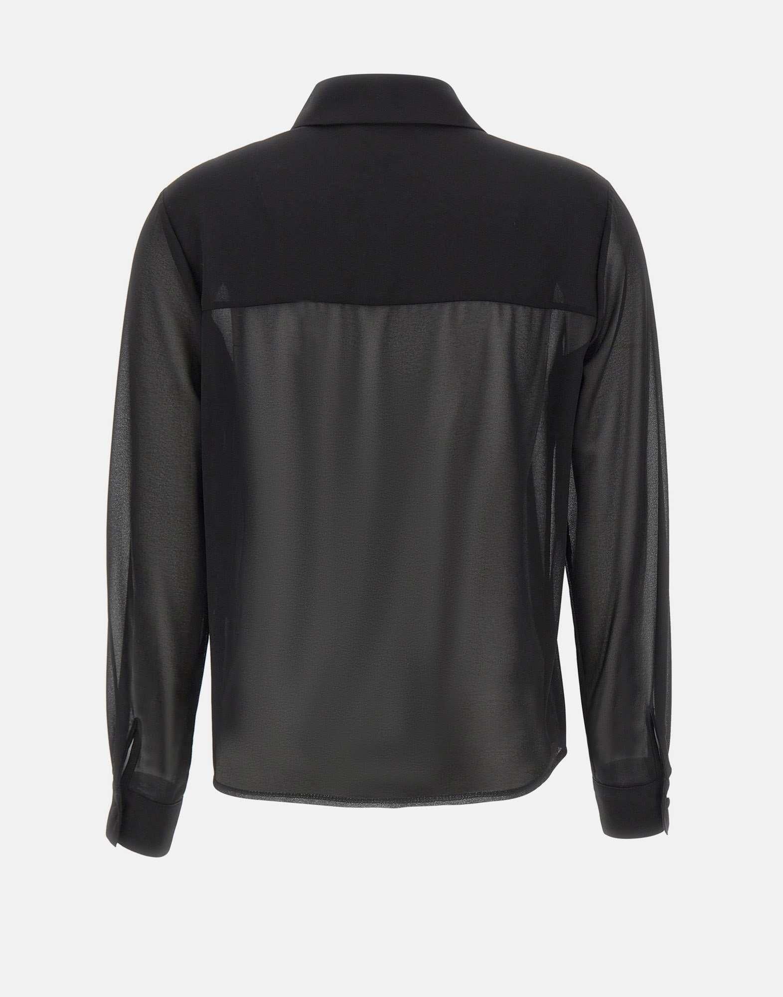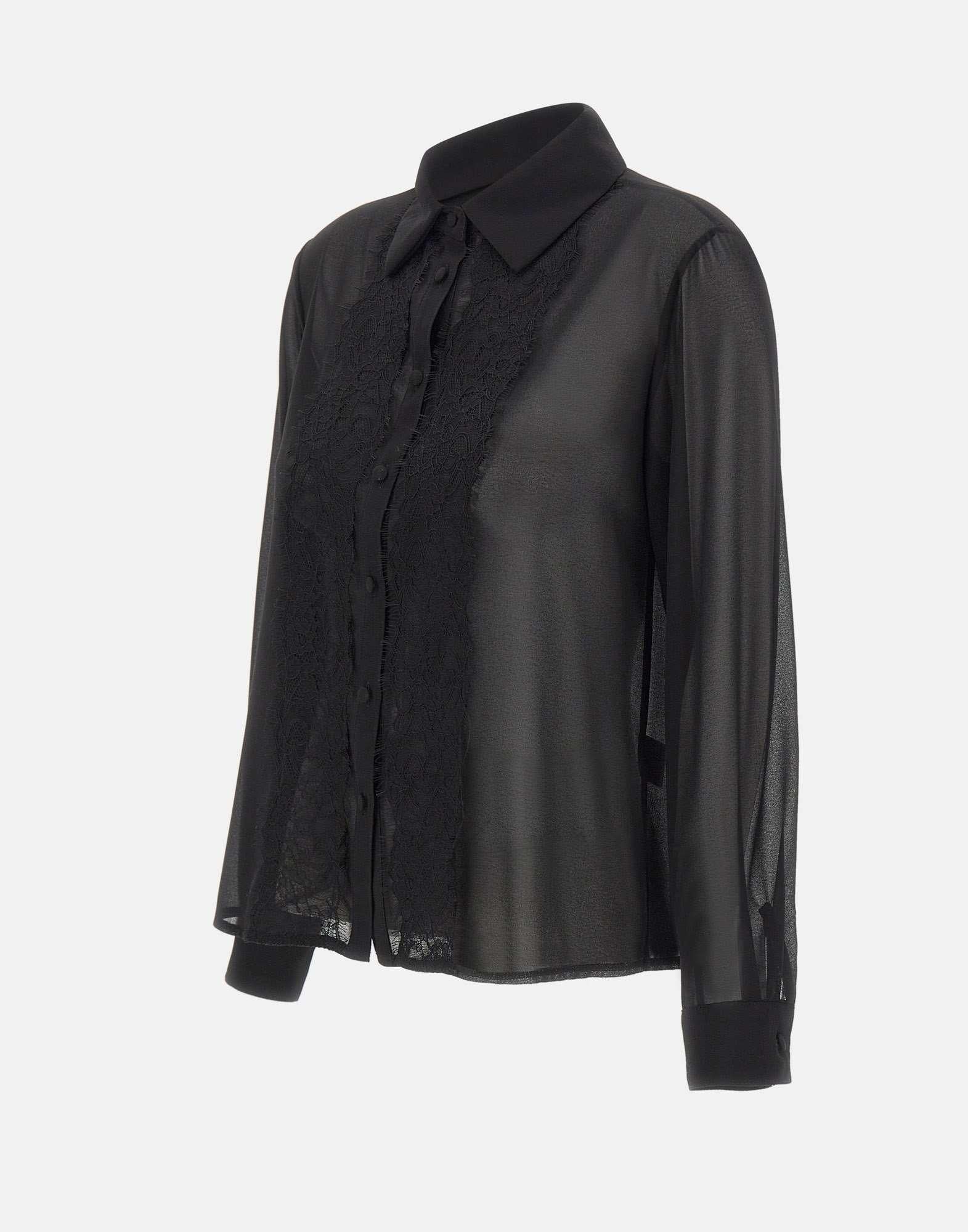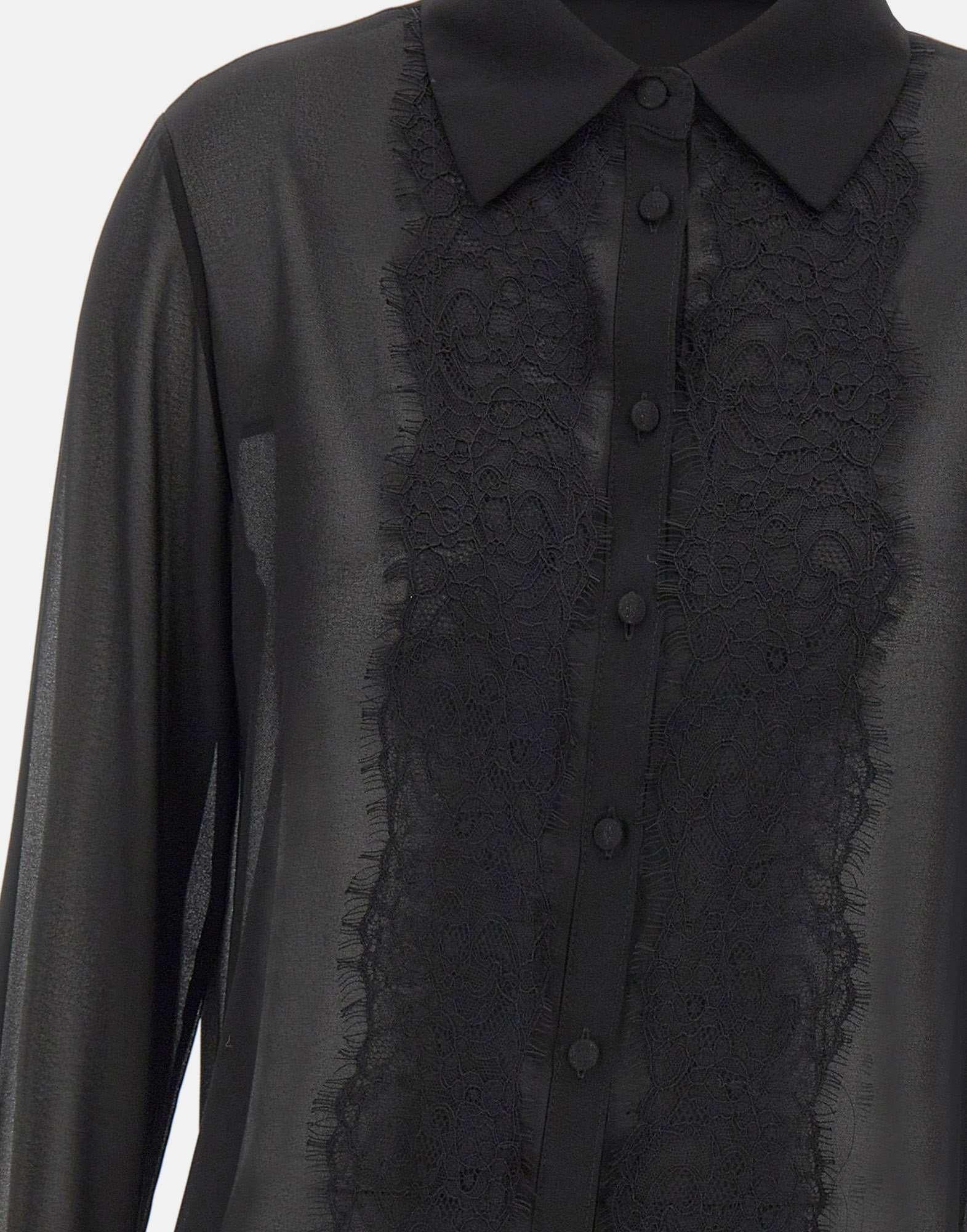 Kaos women's shirt in sheer black fabric, enriched with delicate lace embroidery running along the front button placket for a refined, feminine touch. Features buttoned cuffs and tonal front button closure. Regular fit, ideal for both daywear and evening occasions.