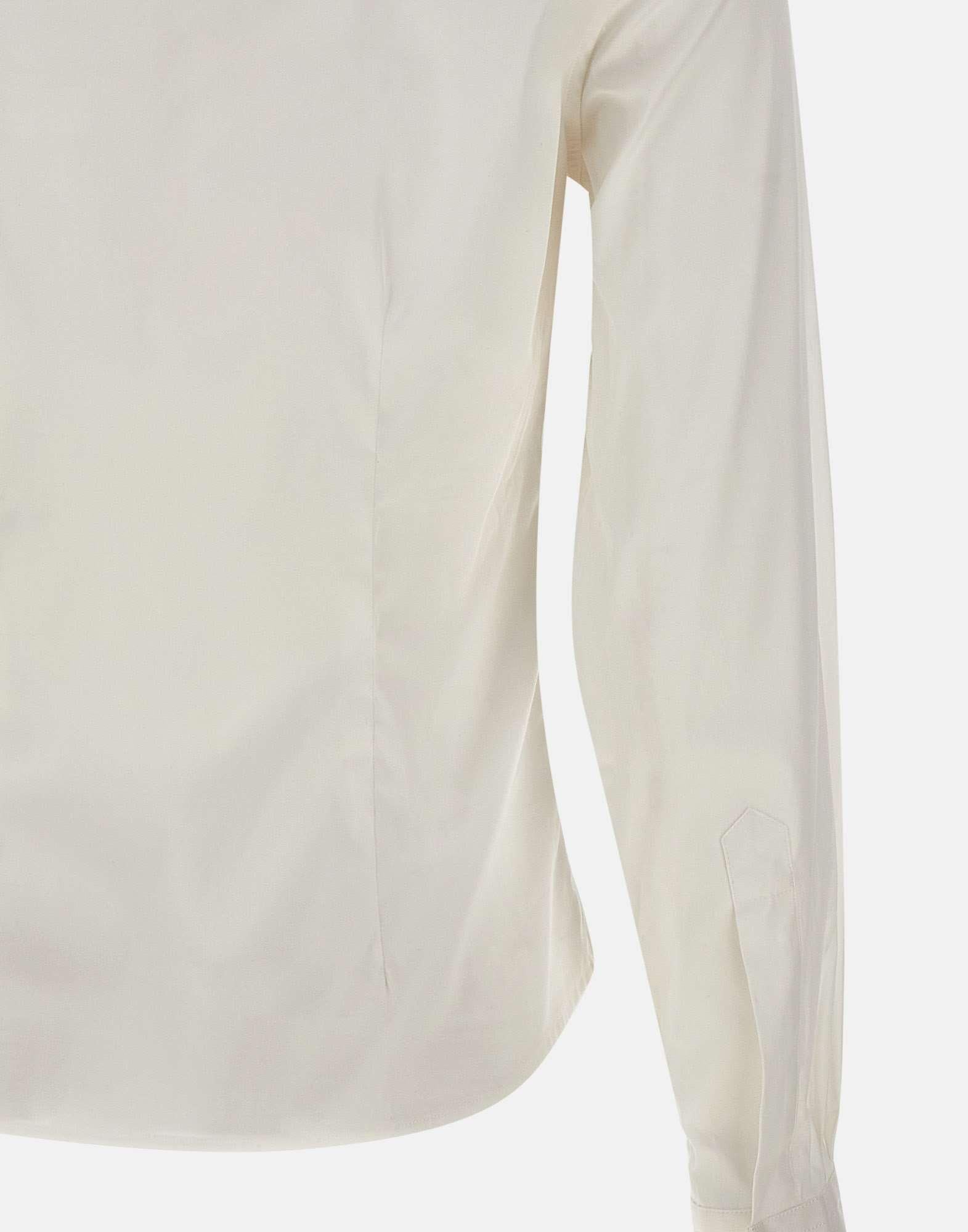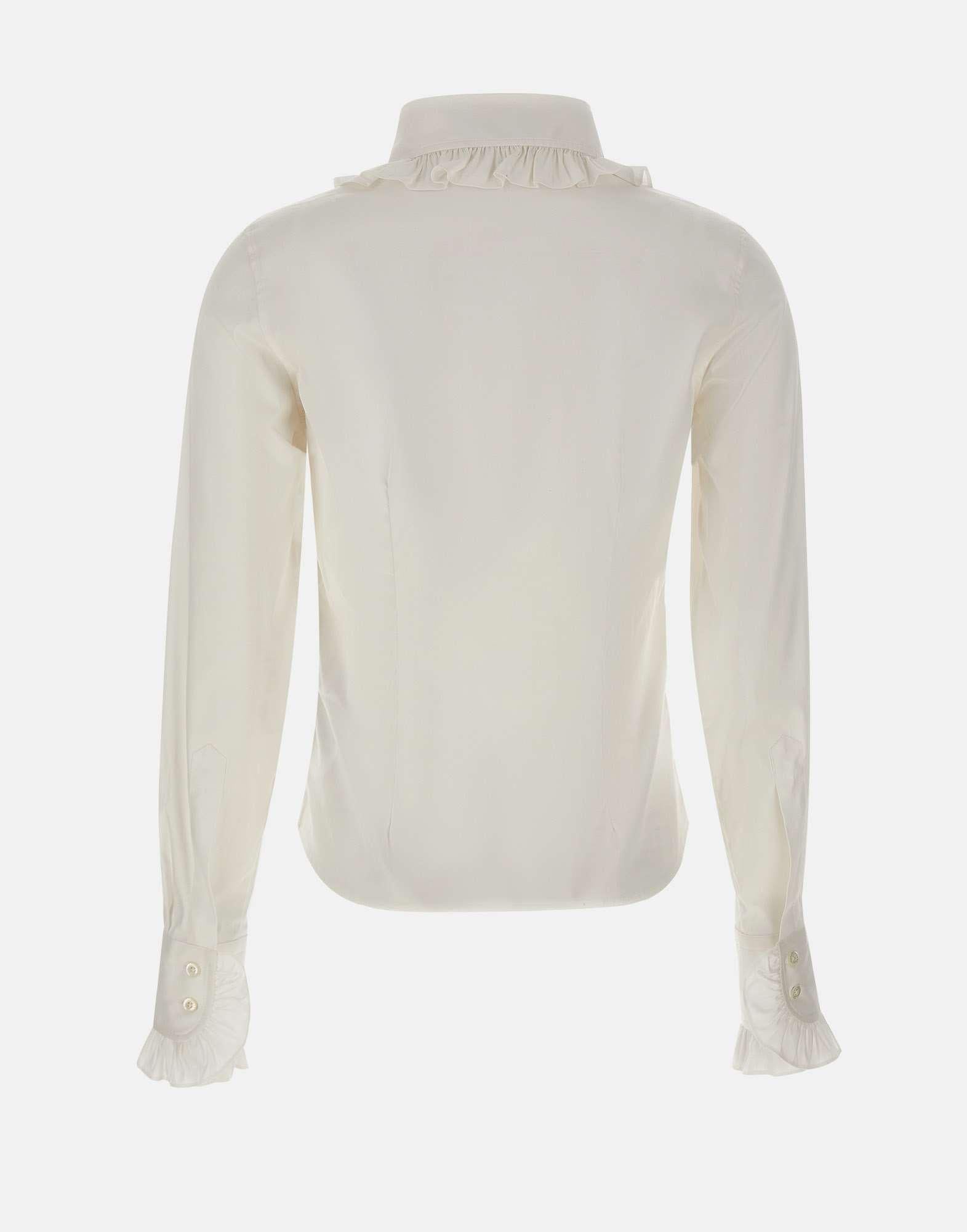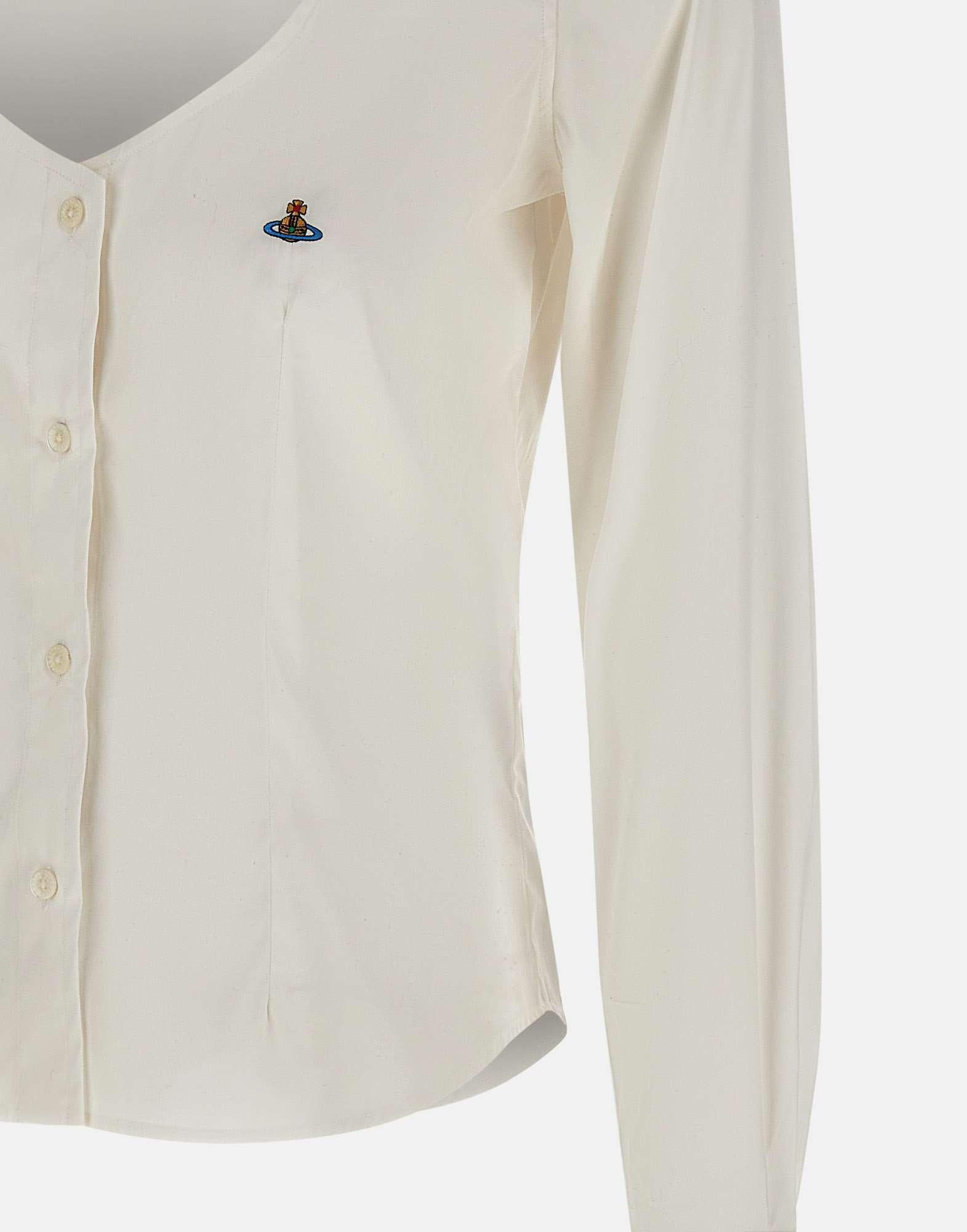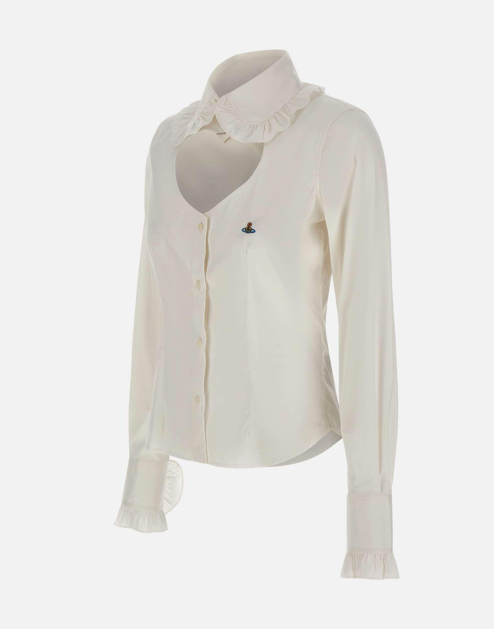 Vivienne Westwood "Toulouse Frill" white shirt crafted from stretch cotton with a romantic, refined design. Features a sweetheart neckline, rounded collar with ruffles, and long sleeves finished with ruffled cuffs. The signature embroidered Orb adorns the chest. Detailed with tone-on-tone stitching, a back yoke, and a curved hem for a flattering fit. Slim fit.