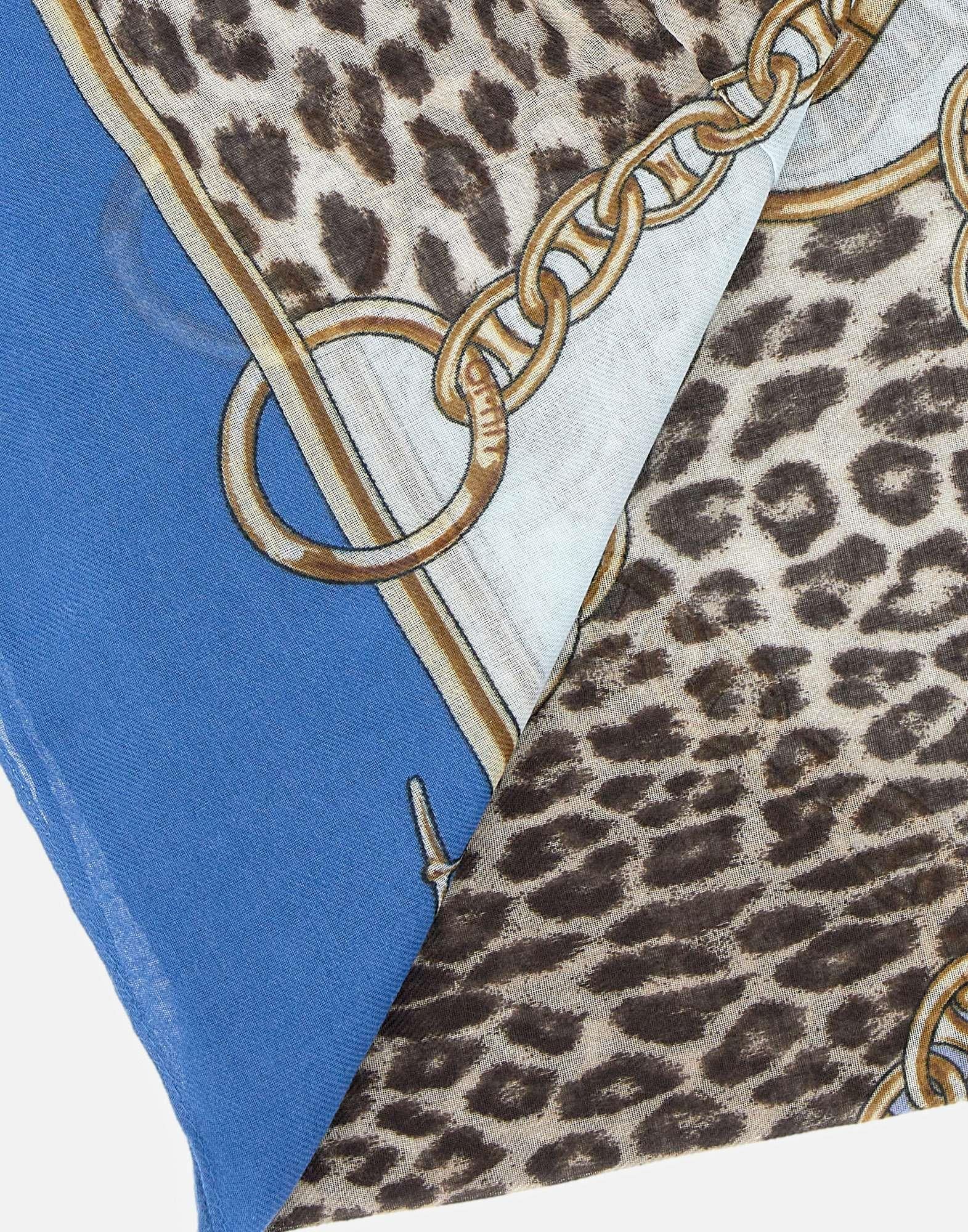 Liu-Jo women's scarf in lightweight fabric with a chain and animal print pattern in shades of blue, elegant and sophisticated. Made as a "Liu Jo Better" product, it is created using a sustainable and environmentally friendly production process. Presented in a branded box, it's also a perfect gift idea. Dimensions: 120x120 cm.